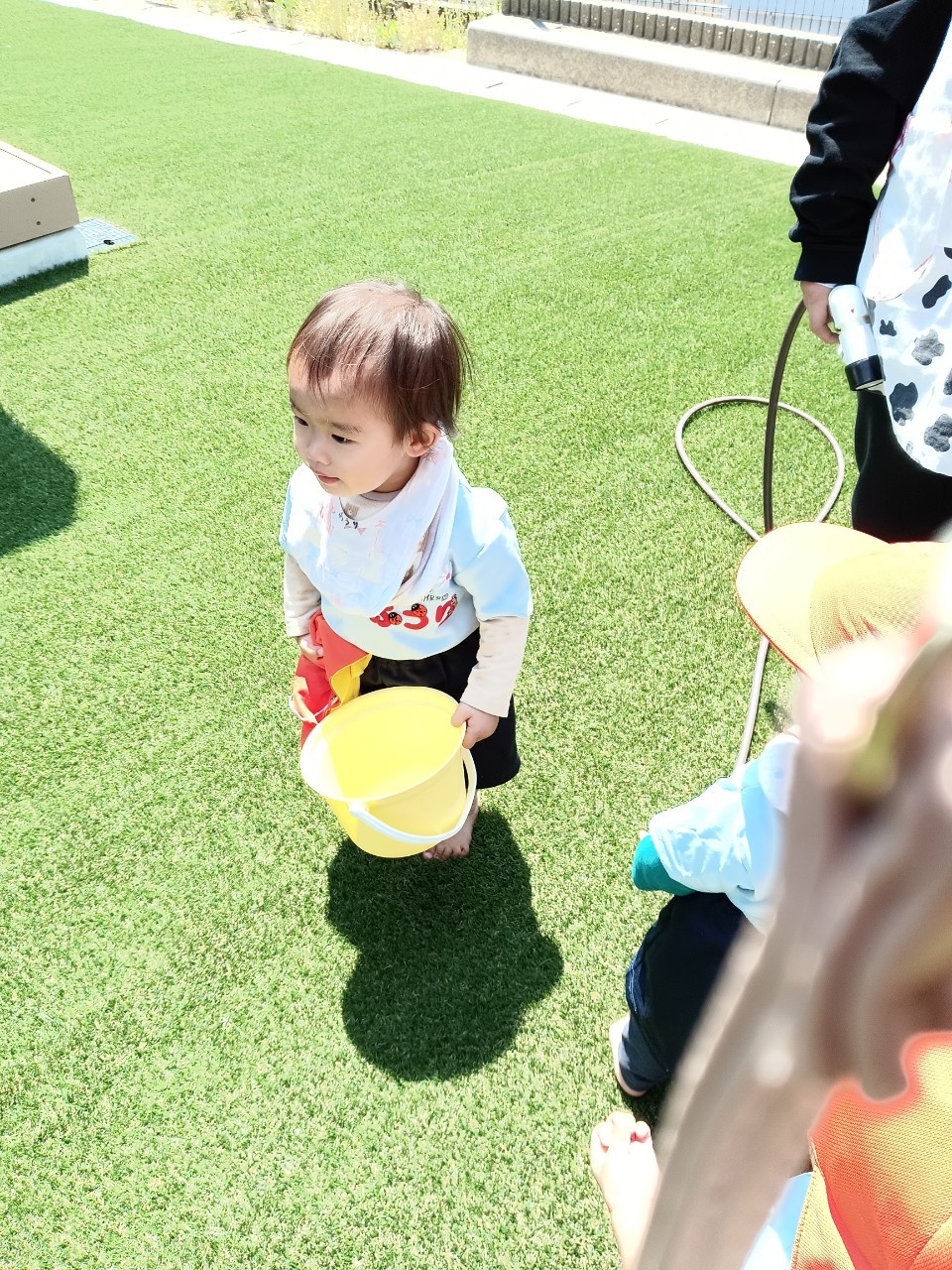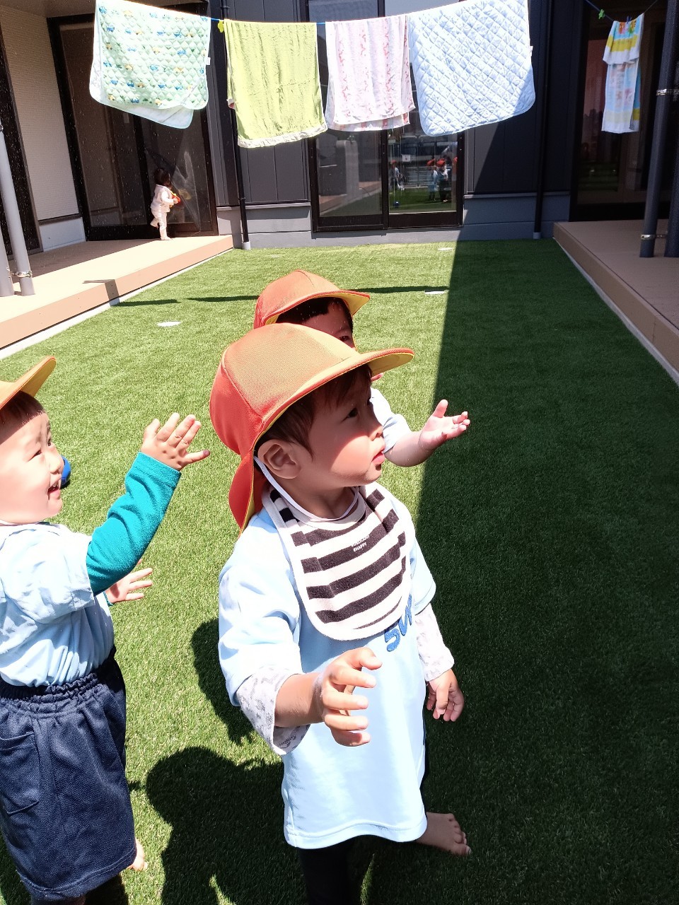 今日は園庭で遊びました☺️ボールやシャボン玉をだしてみんなで追いかけて沢山体を動かして遊ぶ姿がみられました🤗外が暑かったので、シャワーやバケツに水をいれ雨の様に降らせると、気持ちよさそうに浴び楽しむ姿がみられました😆