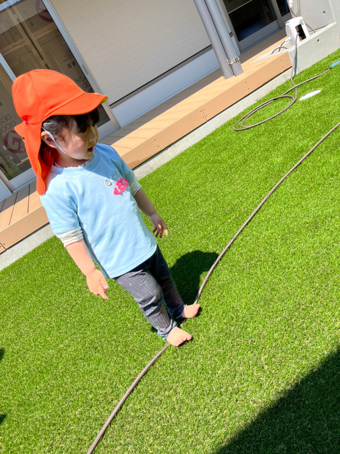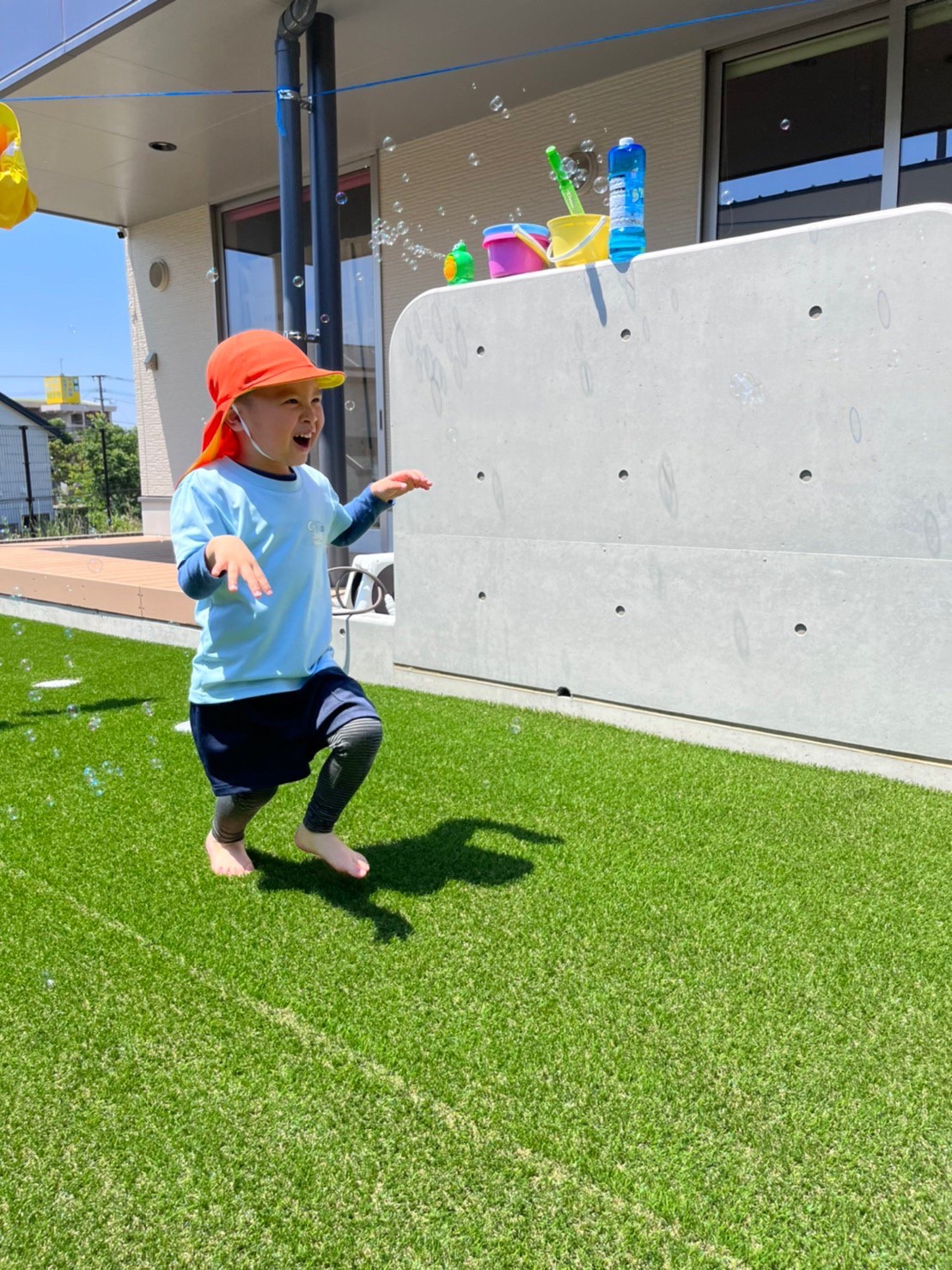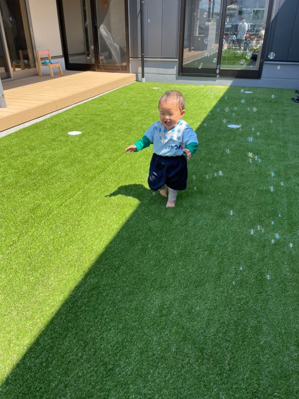 今日はお庭で遊びました✨日差しが強かったので、シャワーの水を巻くと、笑い声をあげて逃げまわっていました😆ボールやしゃぼん玉遊びも嬉しそうでしたよ🎶