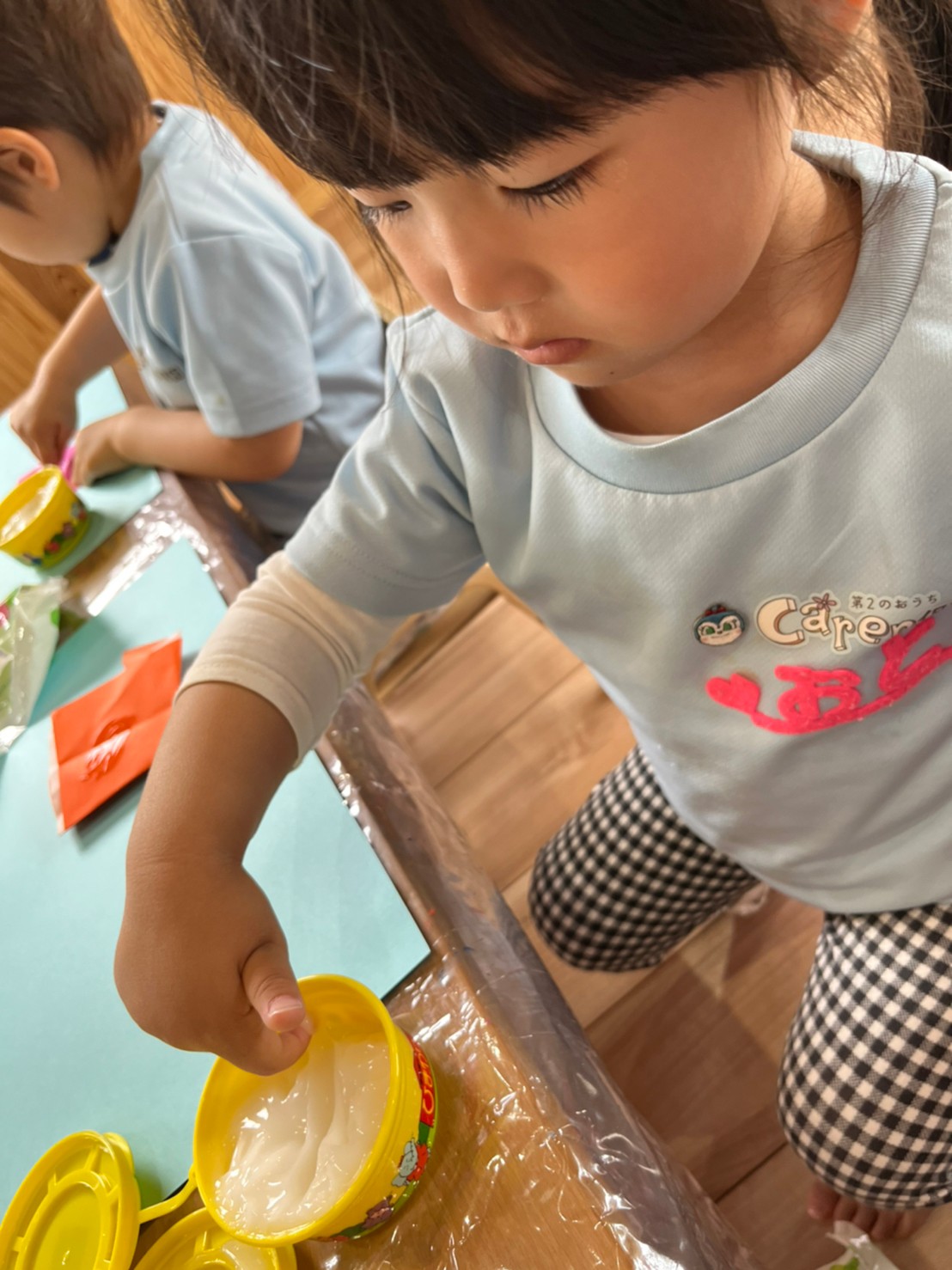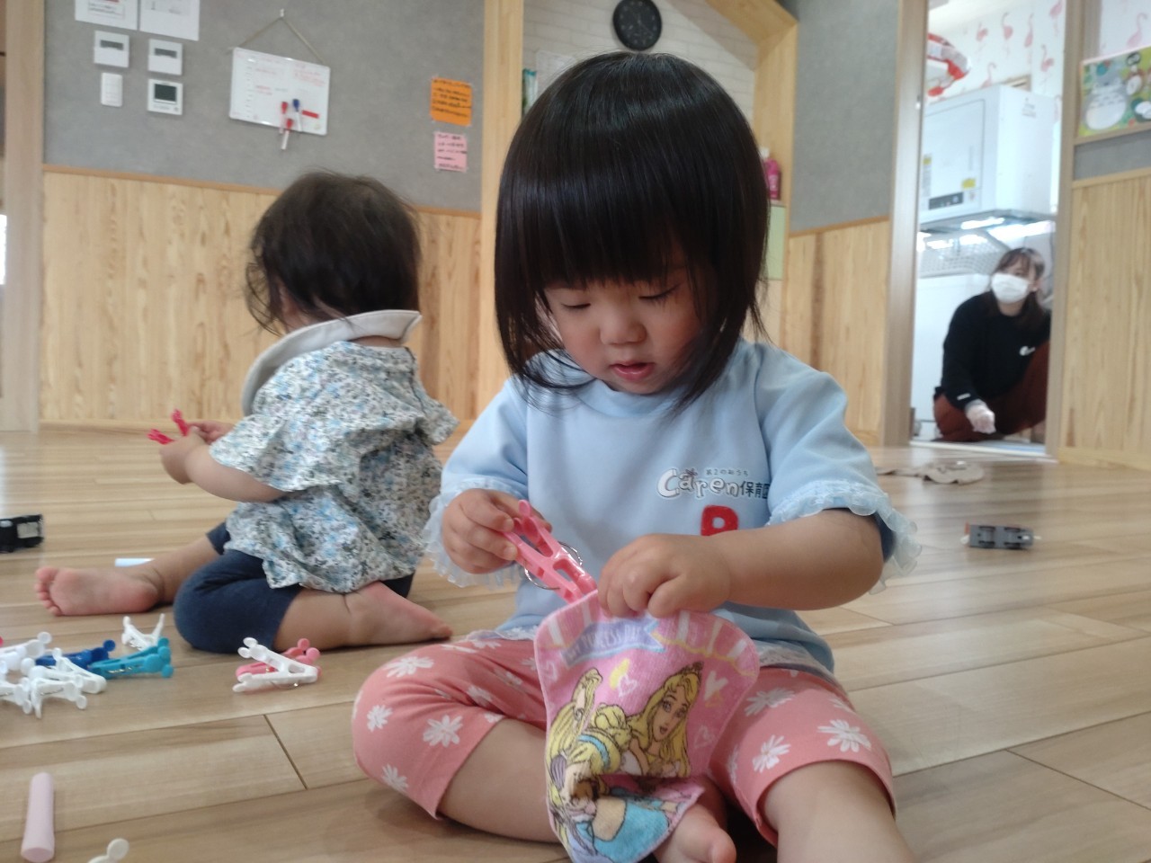 洗濯ばさみでハンカチを挟んだり、長〜く繋げたりたりして器用に指先を使っていましたよ🥰