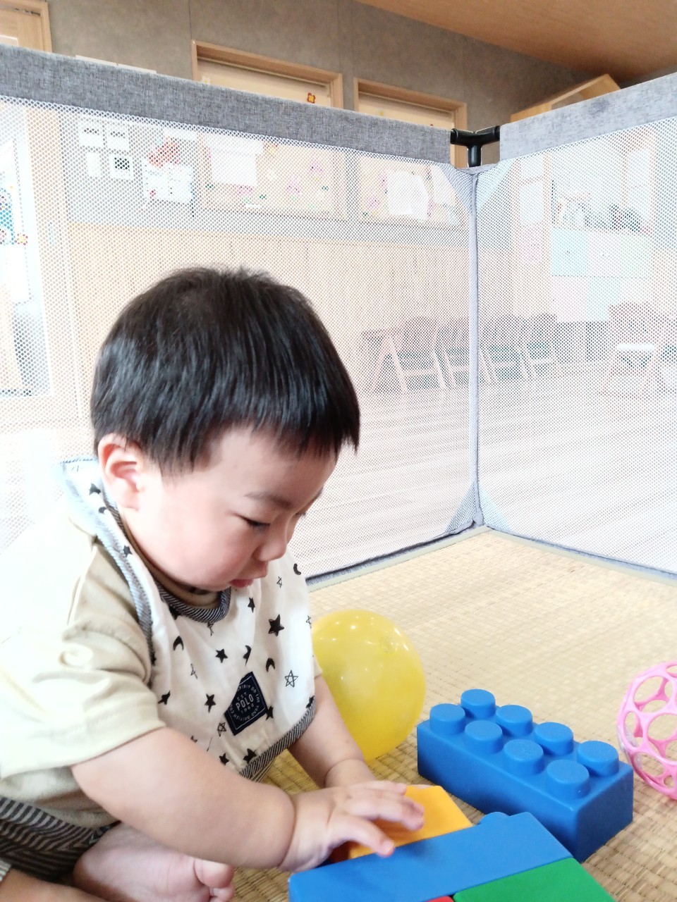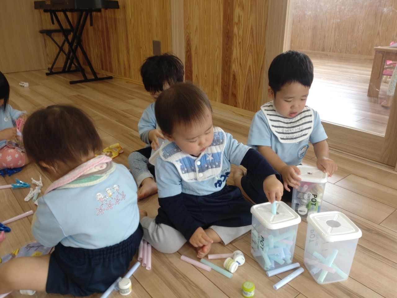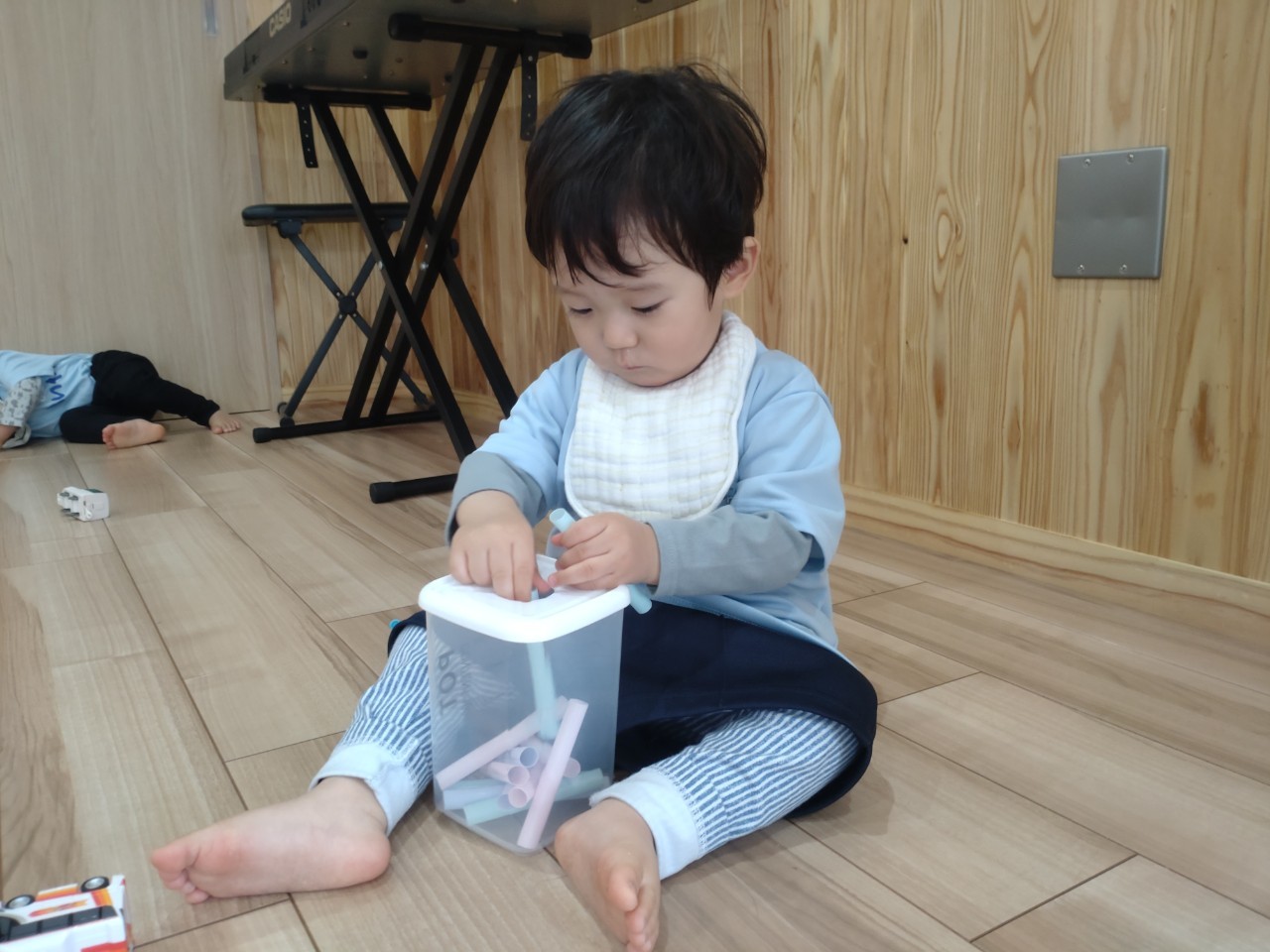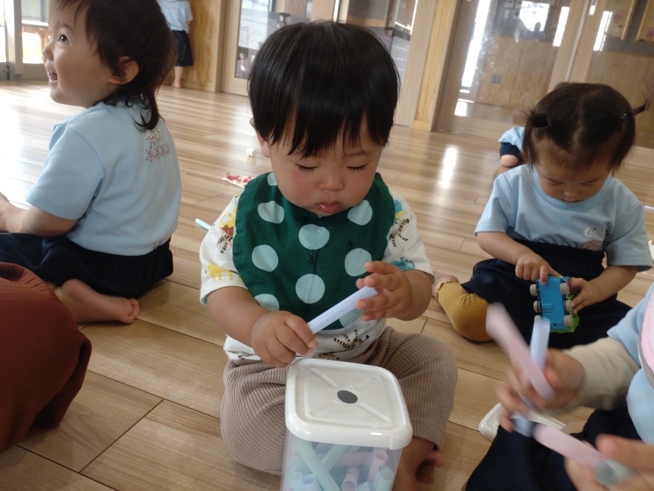 指先遊びでは、容器の小さい穴にストローやキャップを集中して次々に入れていました☺️