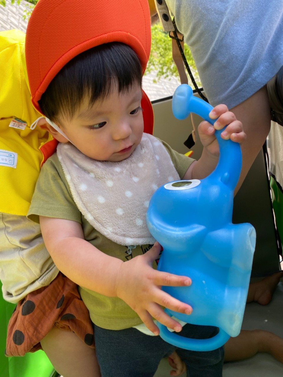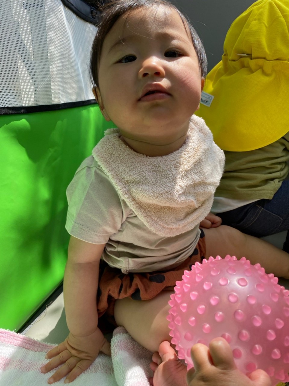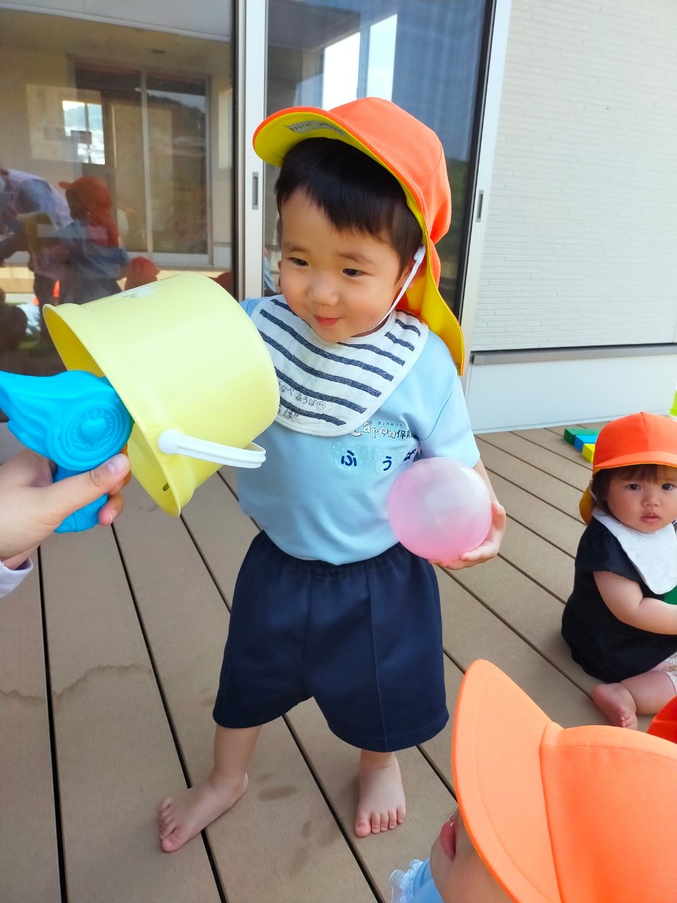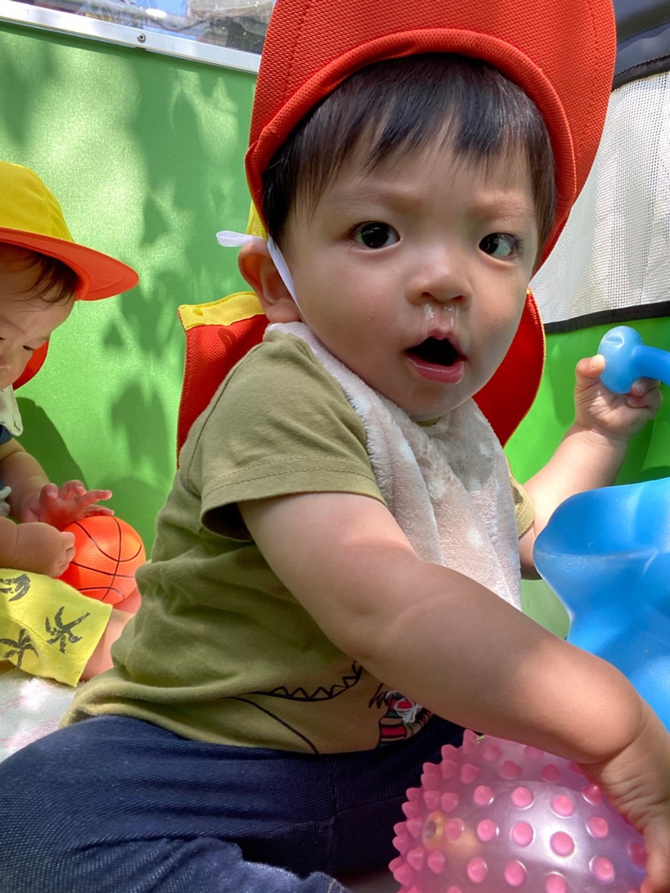 ひよこ🐤ぐみ。今日は近くの公園に散歩🏞にいきました。おんぶの子やカートに乗るこも景色を見ながら散歩を楽しみました😌暑いので水分補給を行い日陰で遊びましまた😀カートの中でボール遊びをしたりシャボン玉を飛ばすとジーッと見ている姿が見られまさした🙂園に早めに戻り沐浴をし汗を流していきました☺️