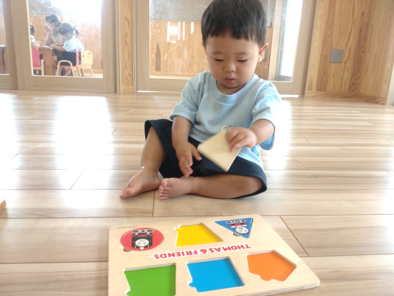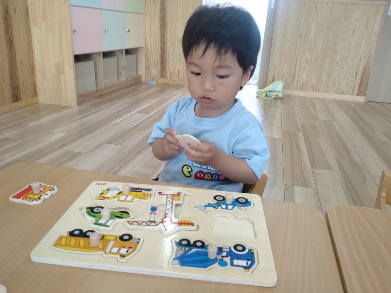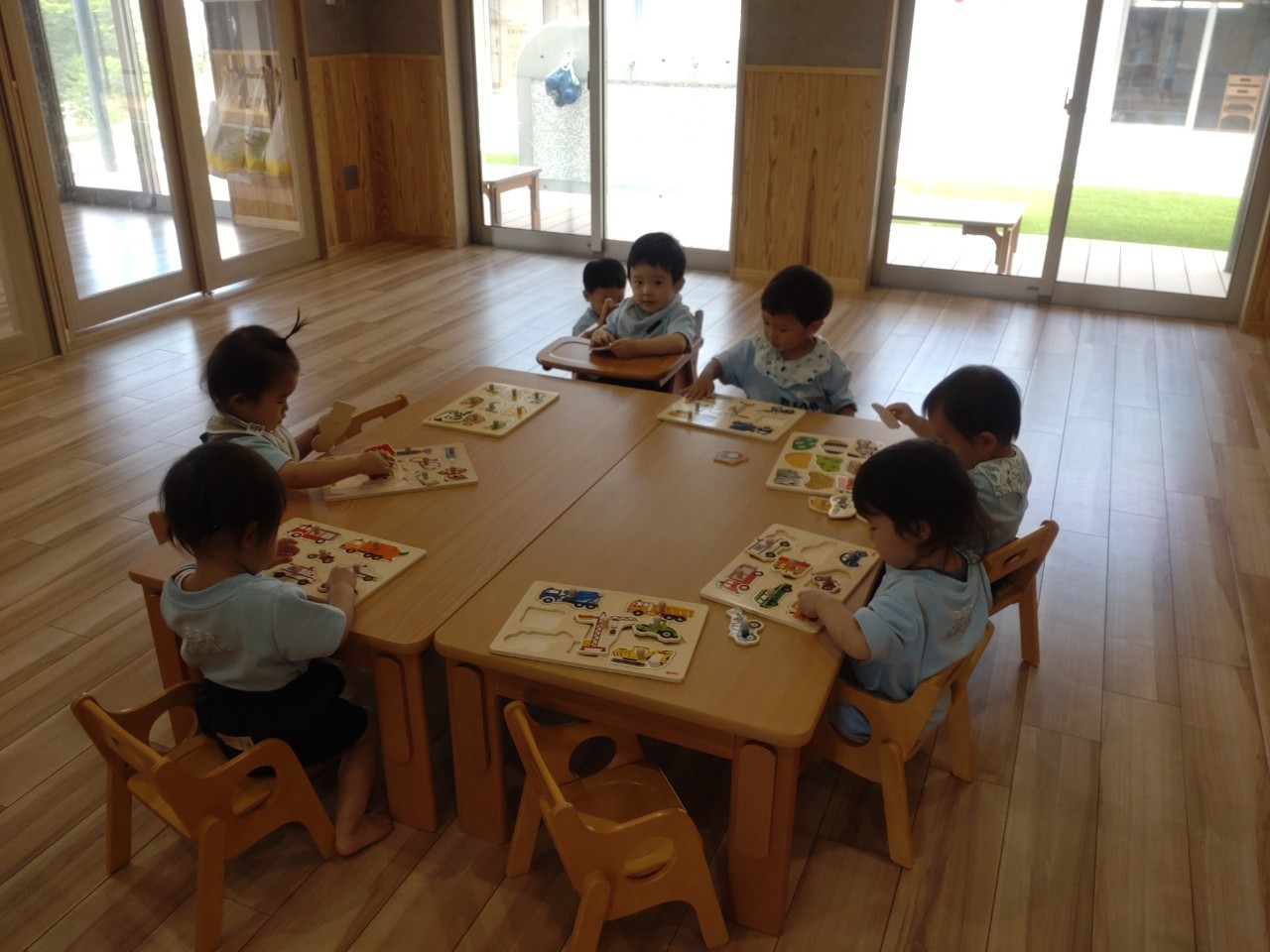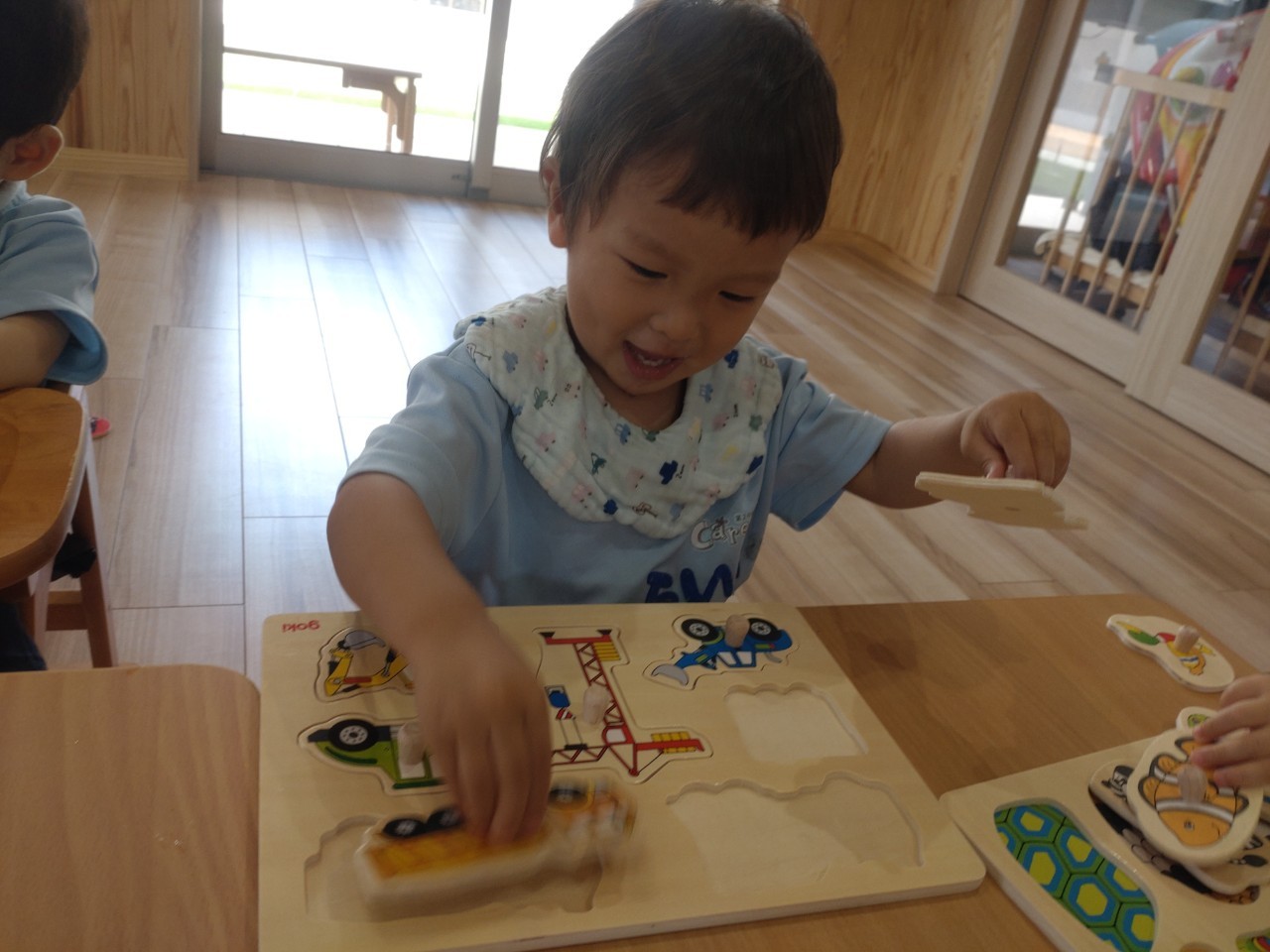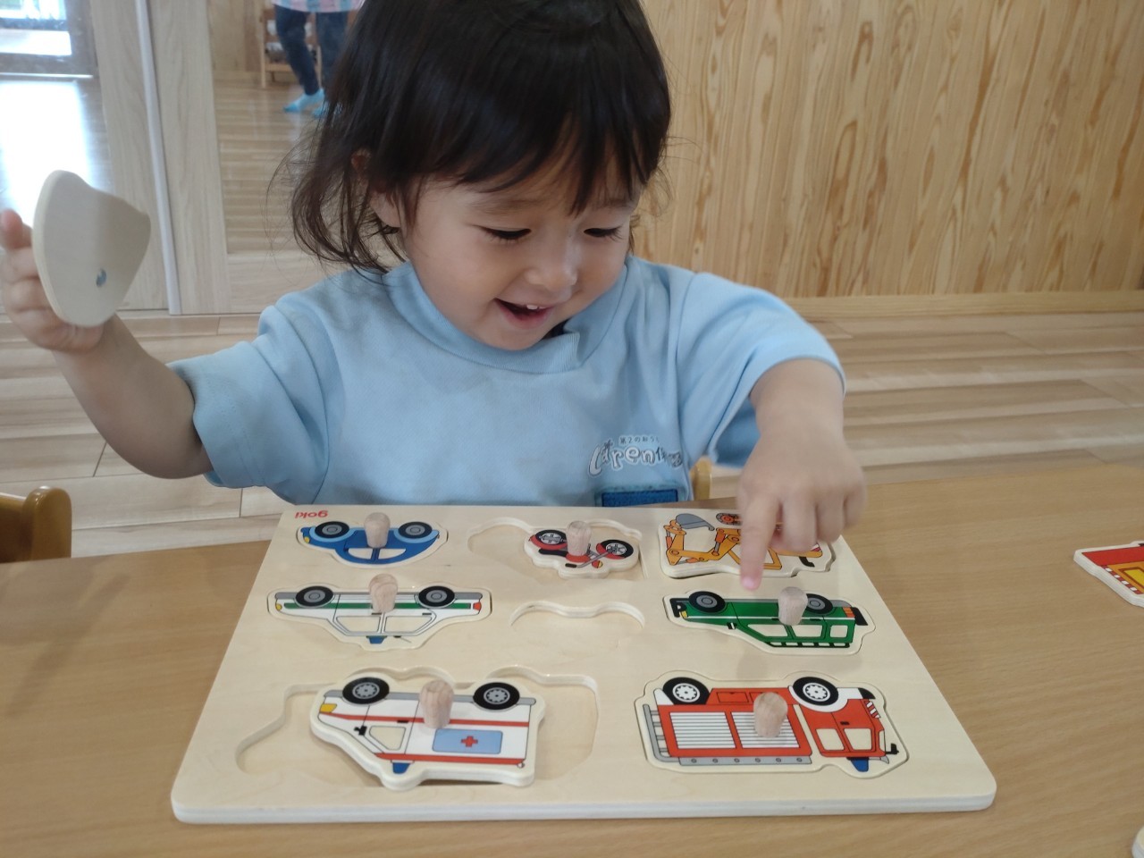 お部屋では型はめパズルをしました❣️乗り物や動物の名前を口々に言って、集中して型にはめる子ども達でした🎶