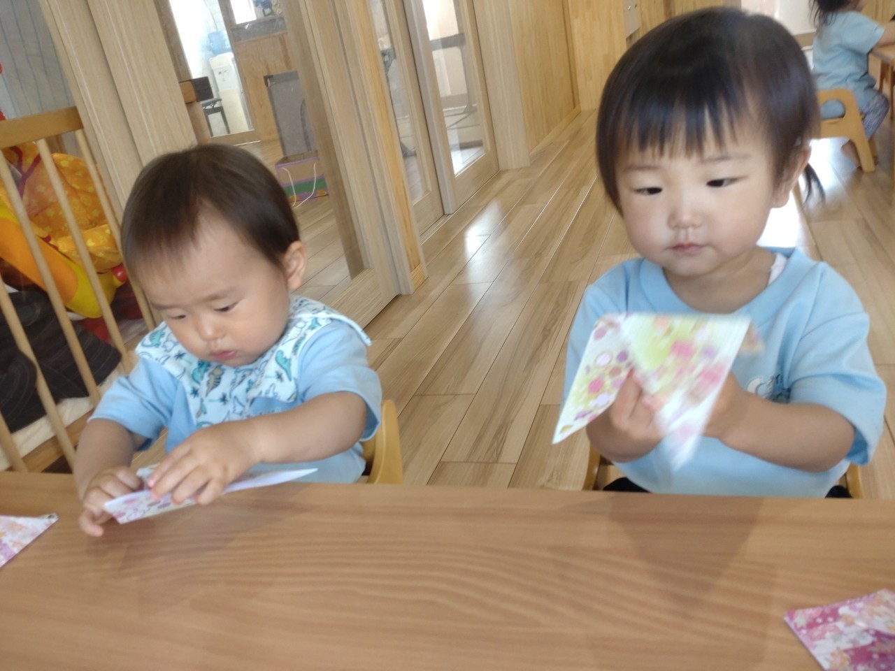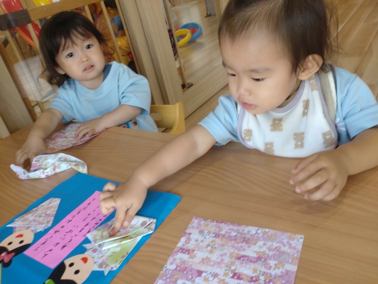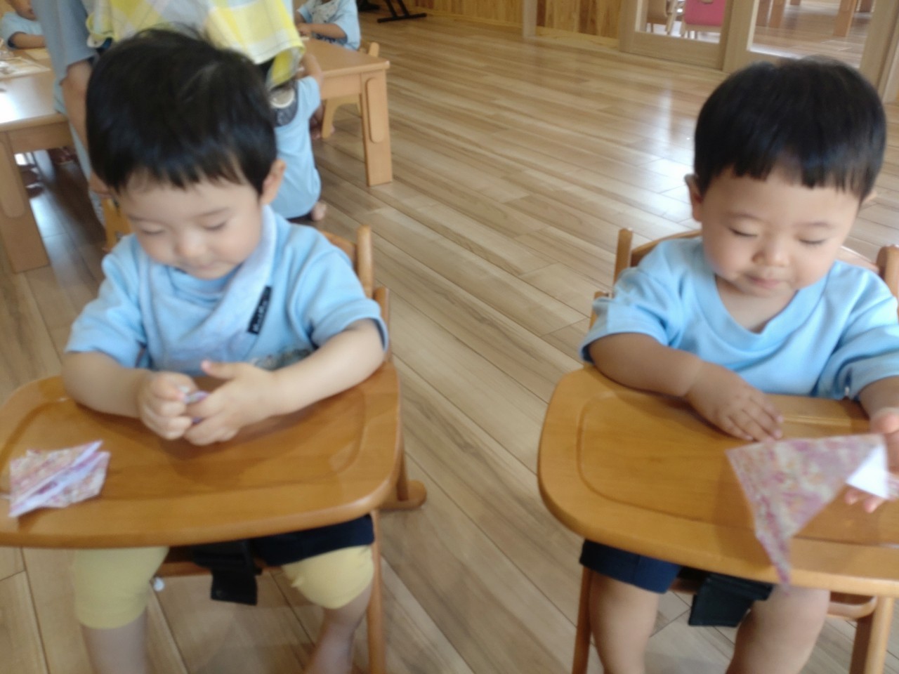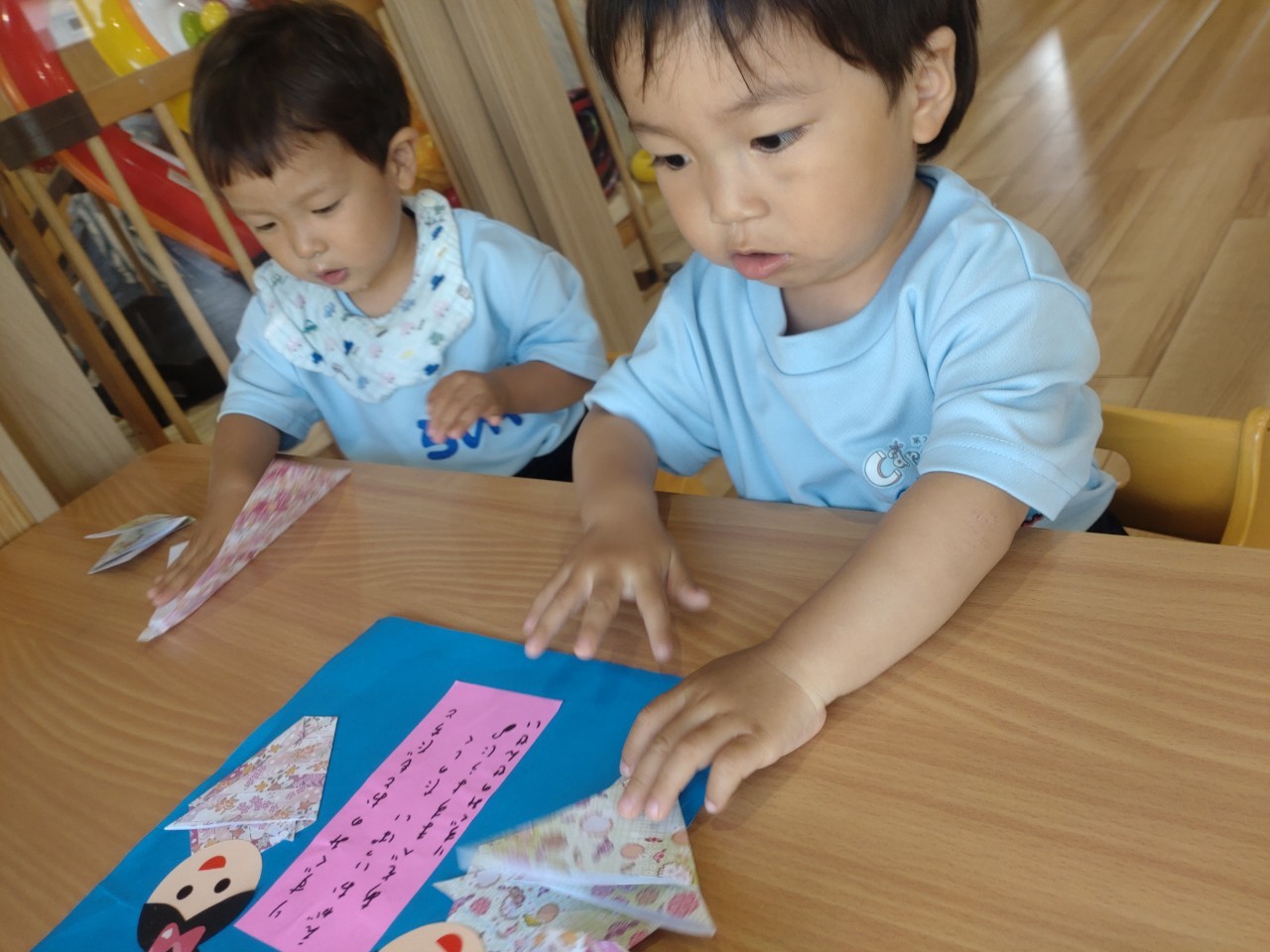 織姫と彦星の見本を事前に見せて、折り紙でお洋服を作りました✨指先を使い、上手に折ることができましたよ🥰
