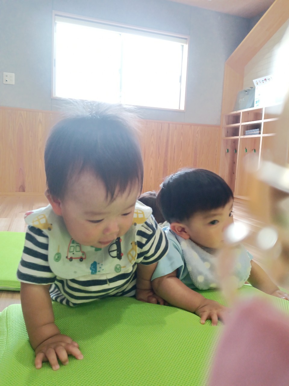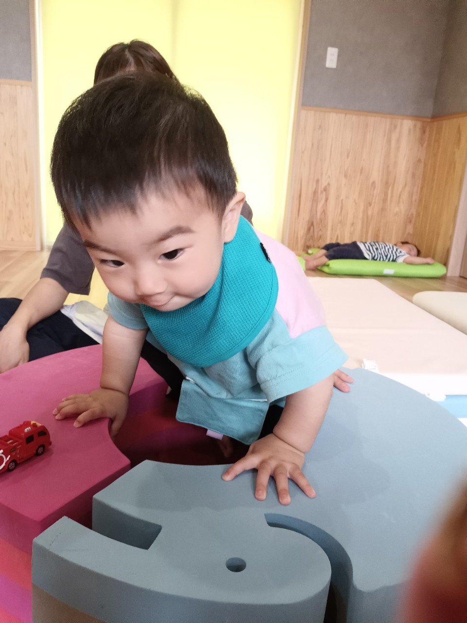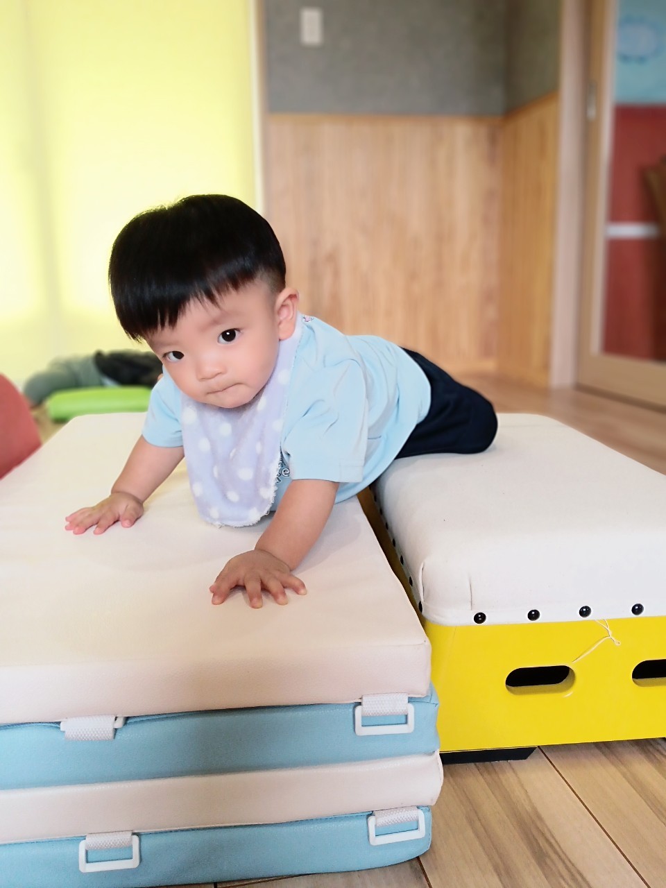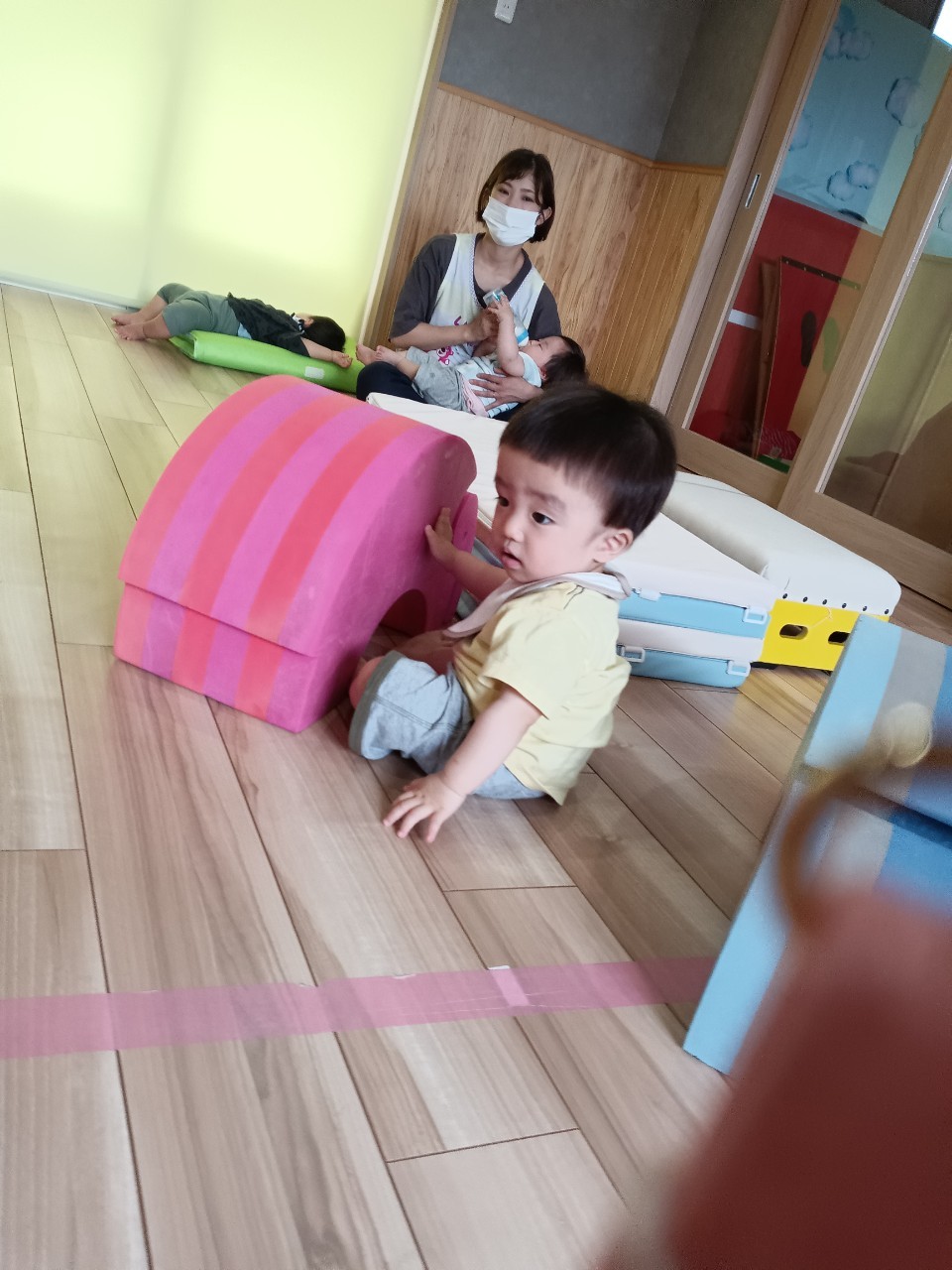 今日な室内で跳び箱やマットをだしてハイハイで登り降りして体を動かして遊びました😊マットを上手に登とたり座って滑り台の様に降りたり寝転んでコロコロして楽しく遊んでいました😀ボーネルンドにも座り揺らしてもらうと笑顔で喜ぶ姿もみられました😄ボーネルンドのトンネルやロッカーからいないいないばぁしては満面の笑みが沢山みられました😊🐿りす組🐿