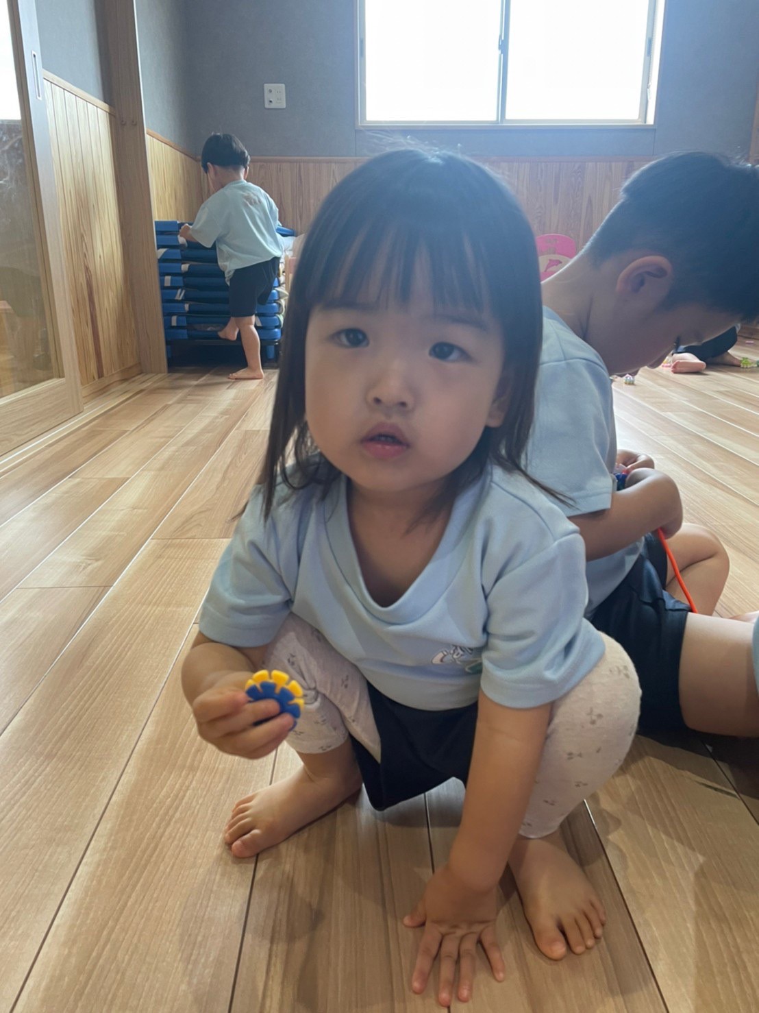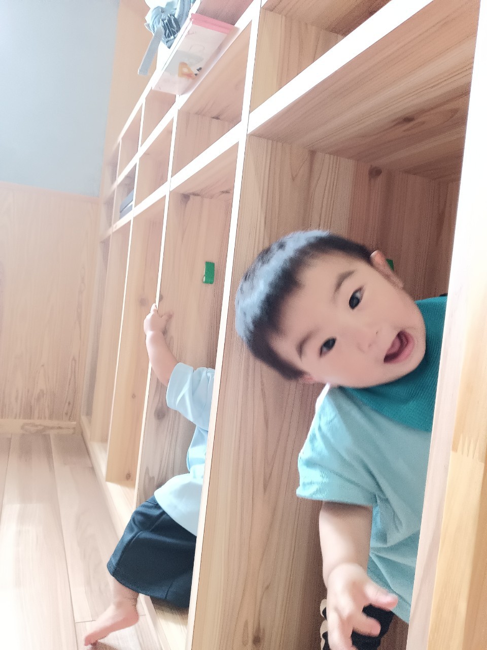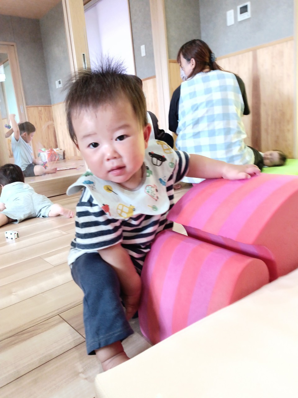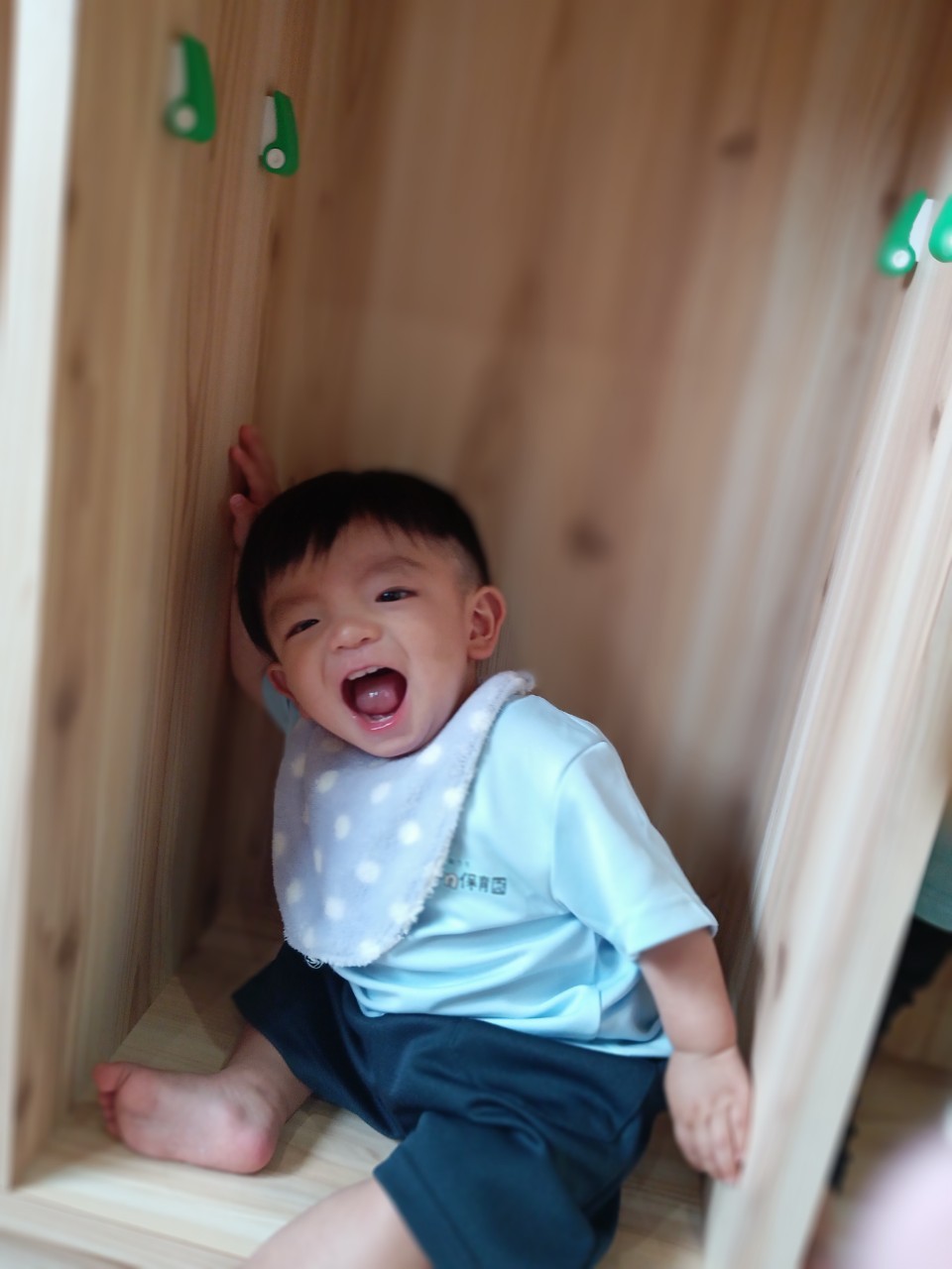 今日な室内で跳び箱やマットをだしてハイハイで登り降りして体を動かして遊びました😊マットを上手に登とたり座って滑り台の様に降りたり寝転んでコロコロして楽しく遊んでいました😀ボーネルンドにも座り揺らしてもらうと笑顔で喜ぶ姿もみられました😄ボーネルンドのトンネルやロッカーからいないいないばぁしては満面の笑みが沢山みられました😊🐿りす組🐿