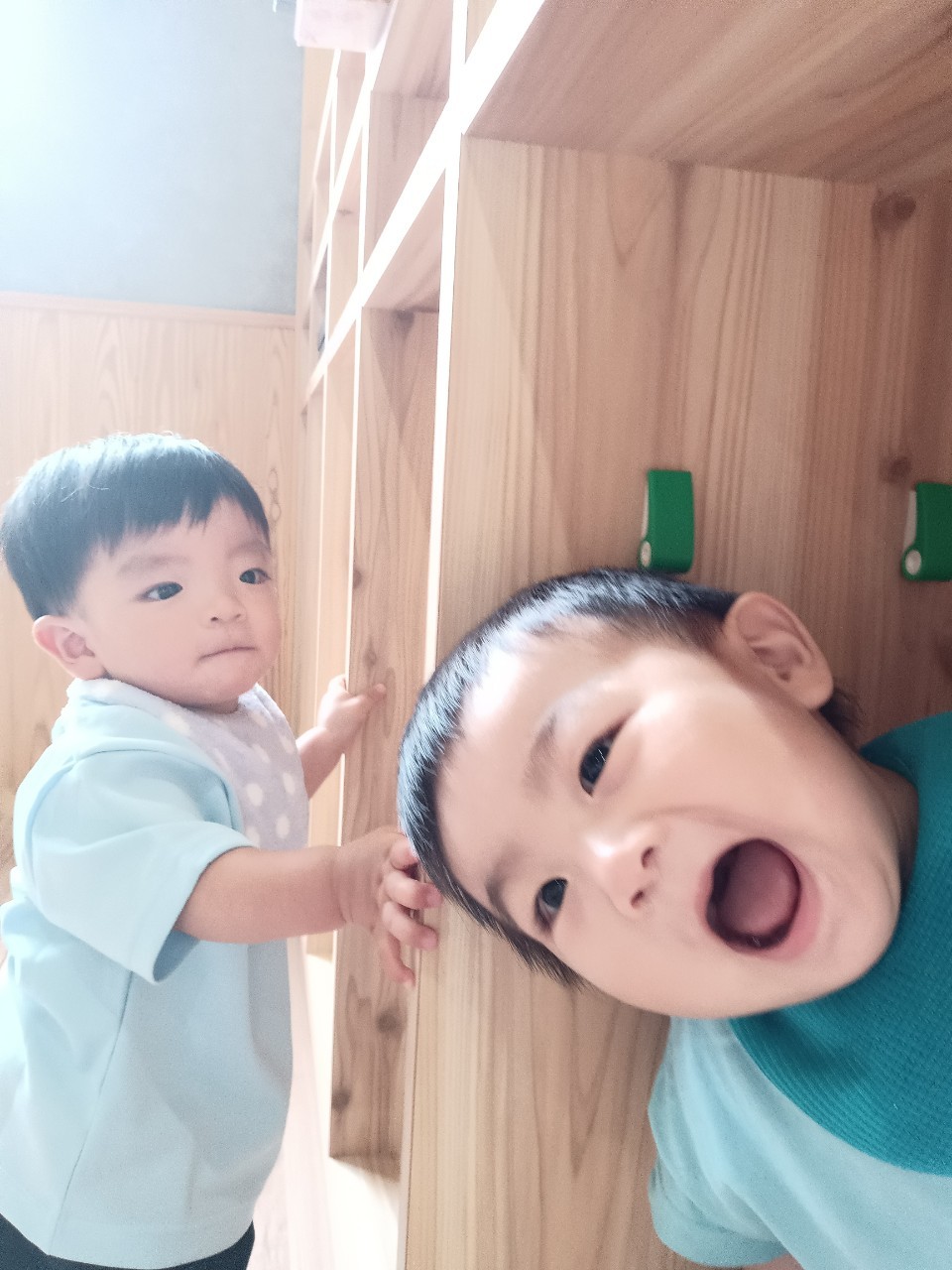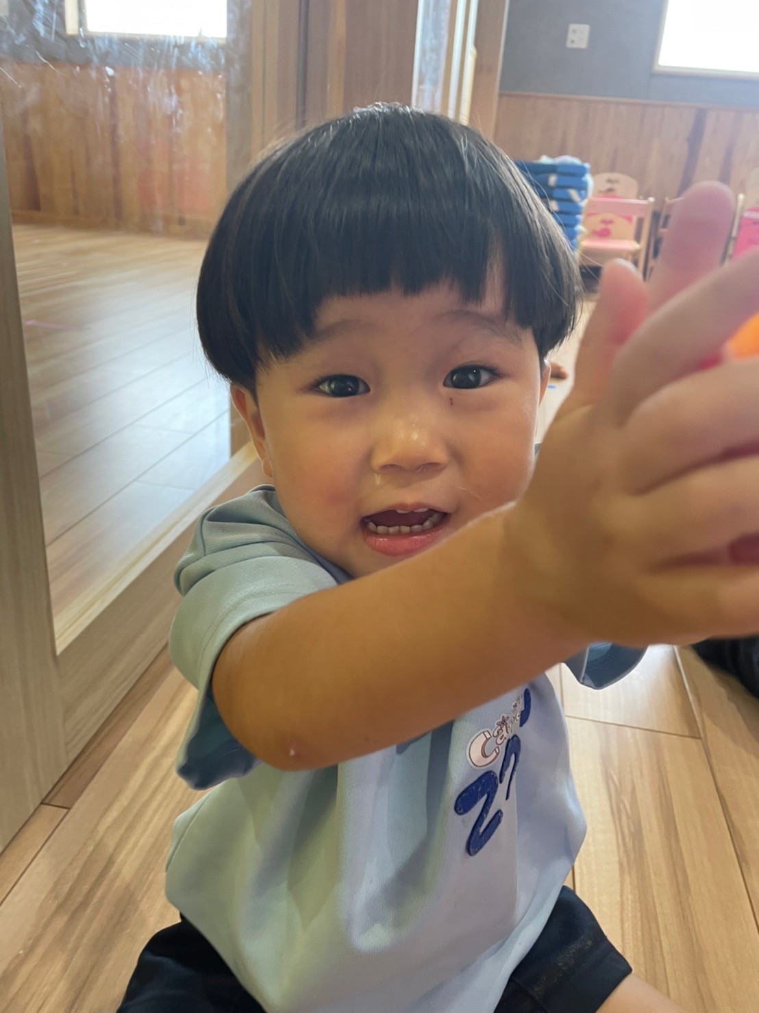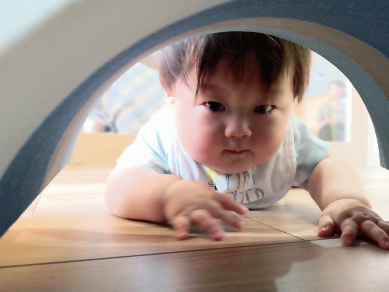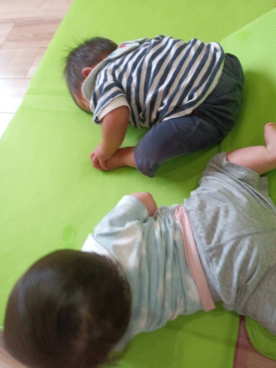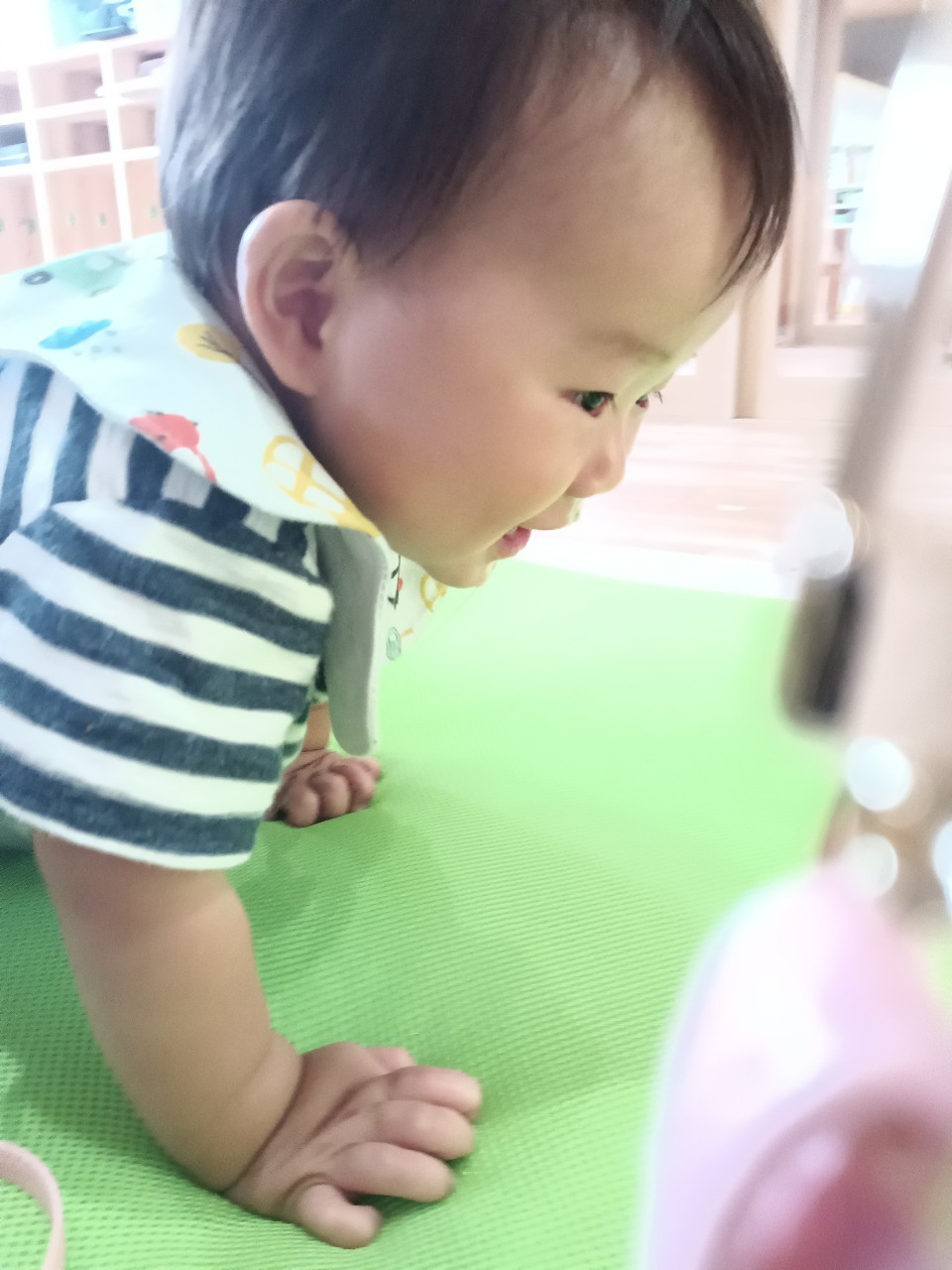 今日な室内で跳び箱やマットをだしてハイハイで登り降りして体を動かして遊びました😊マットを上手に登とたり座って滑り台の様に降りたり寝転んでコロコロして楽しく遊んでいました😀ボーネルンドにも座り揺らしてもらうと笑顔で喜ぶ姿もみられました😄ボーネルンドのトンネルやロッカーからいないいないばぁしては満面の笑みが沢山みられました😊🐿りす組🐿