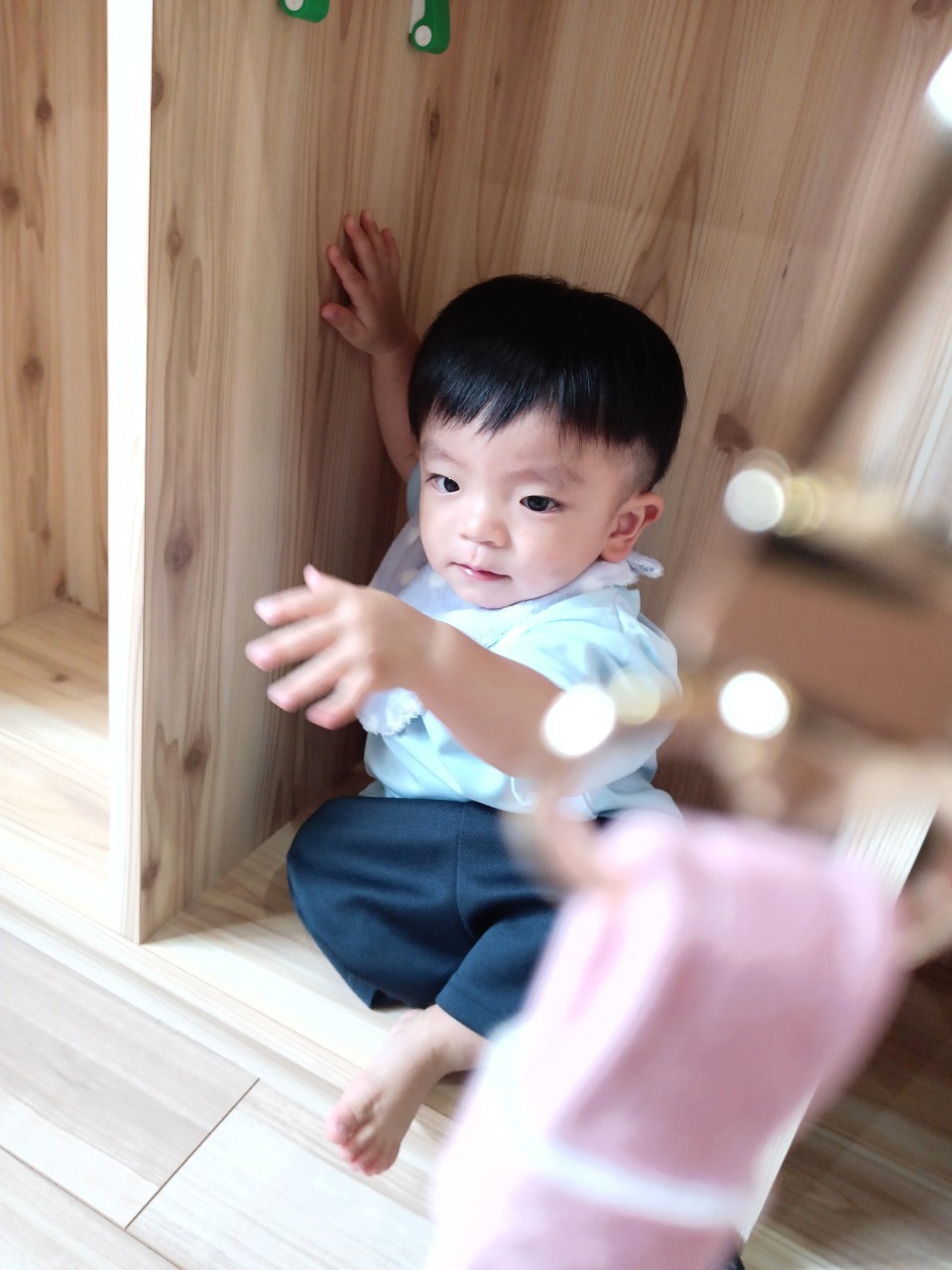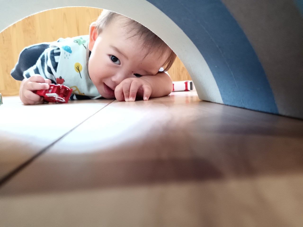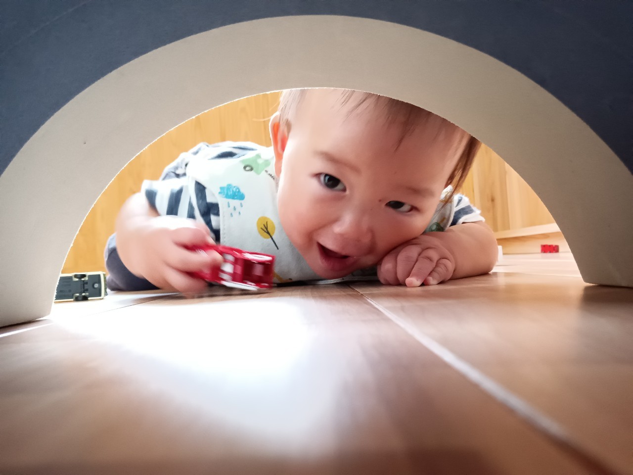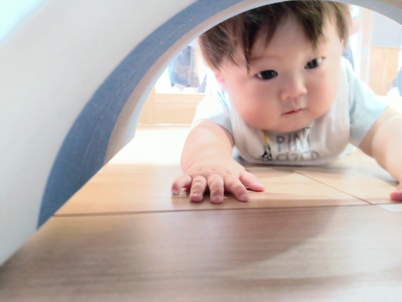 今日な室内で跳び箱やマットをだしてハイハイで登り降りして体を動かして遊びました😊マットを上手に登とたり座って滑り台の様に降りたり寝転んでコロコロして楽しく遊んでいました😀ボーネルンドにも座り揺らしてもらうと笑顔で喜ぶ姿もみられました😄ボーネルンドのトンネルやロッカーからいないいないばぁしては満面の笑みが沢山みられました😊🐿りす組🐿