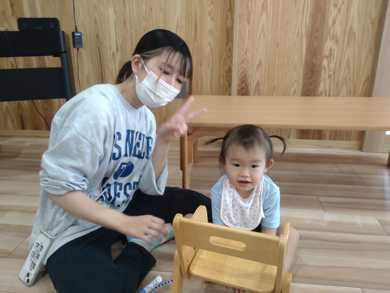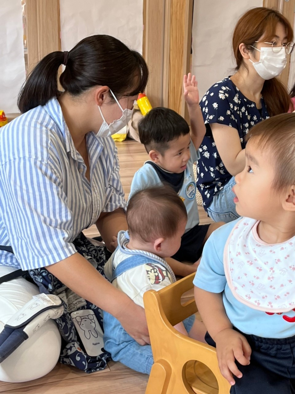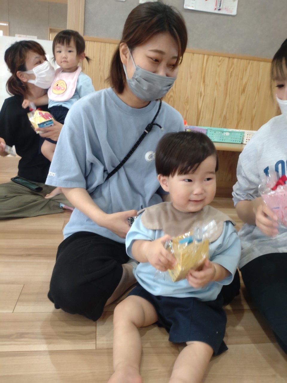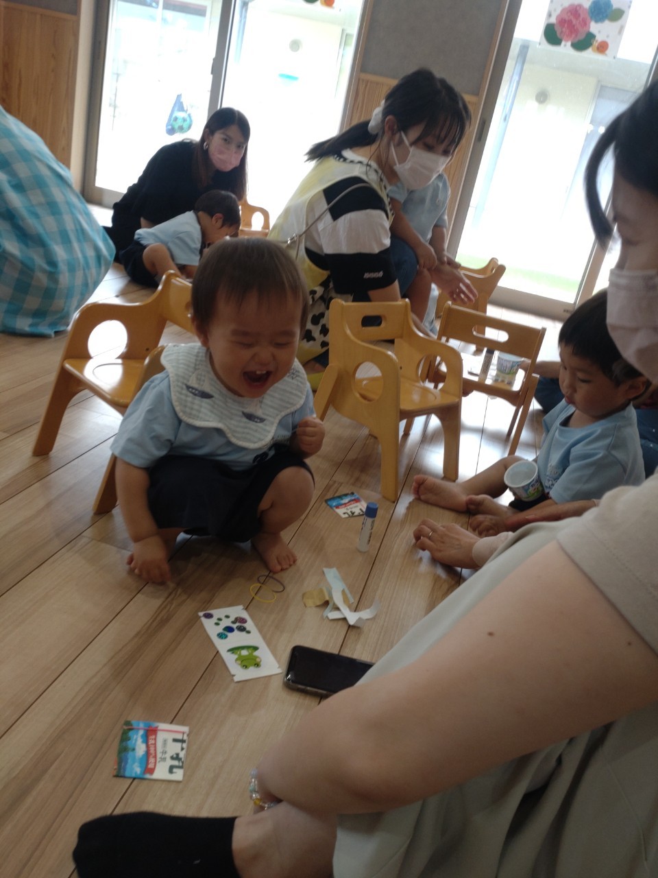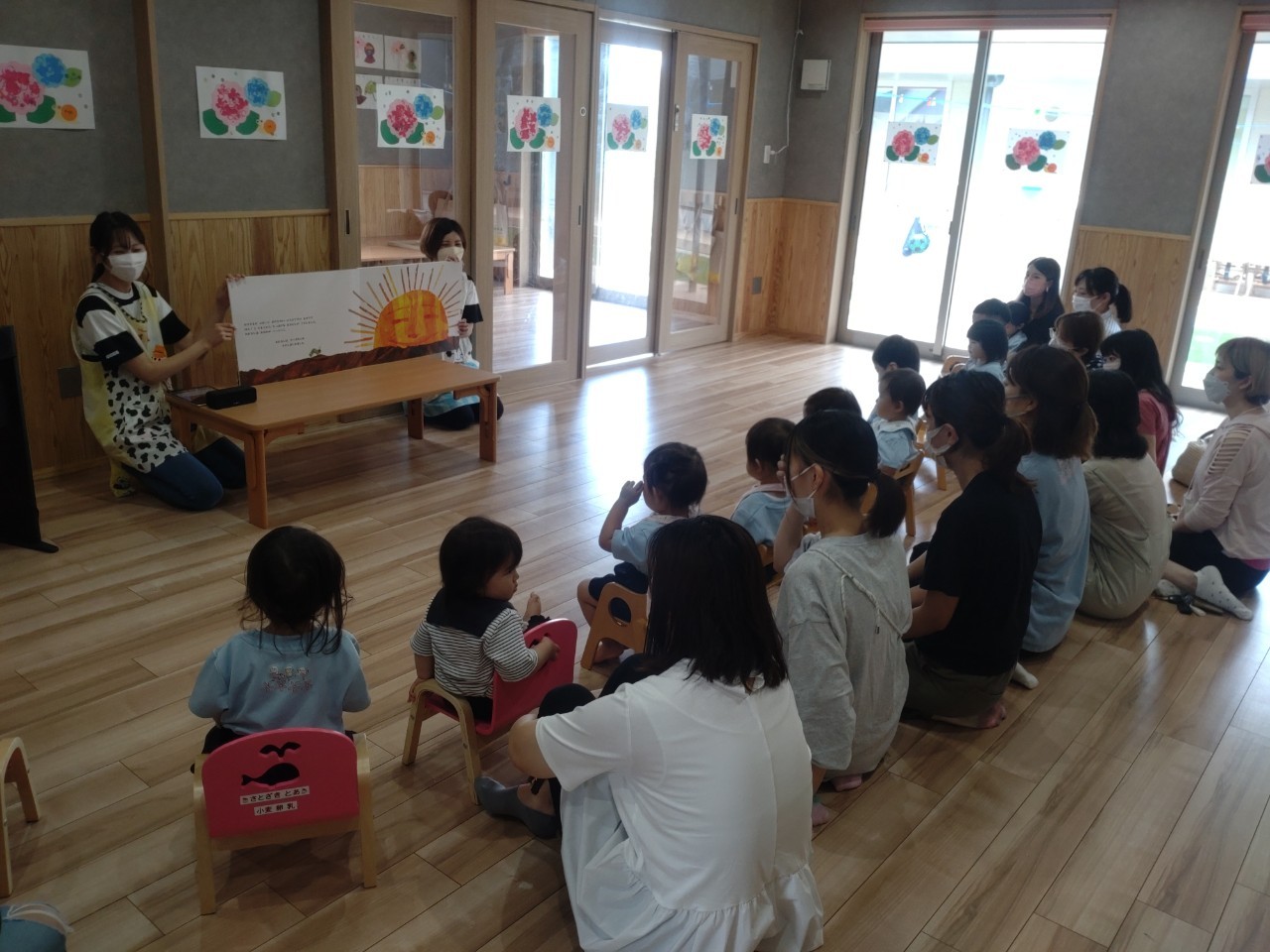 初めは緊張してお母さんのお膝に座っていたお友達も、少しずつ表情が和らいでいました☺️「はらぺこあおむし」の大型絵本が始まると椅子に座って集中して見ることができていましたよ☺️