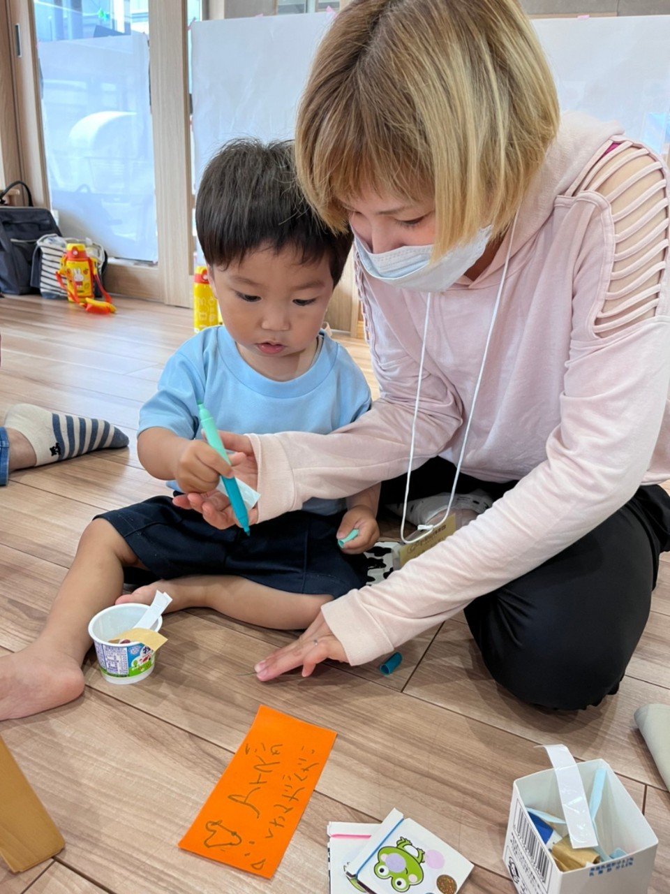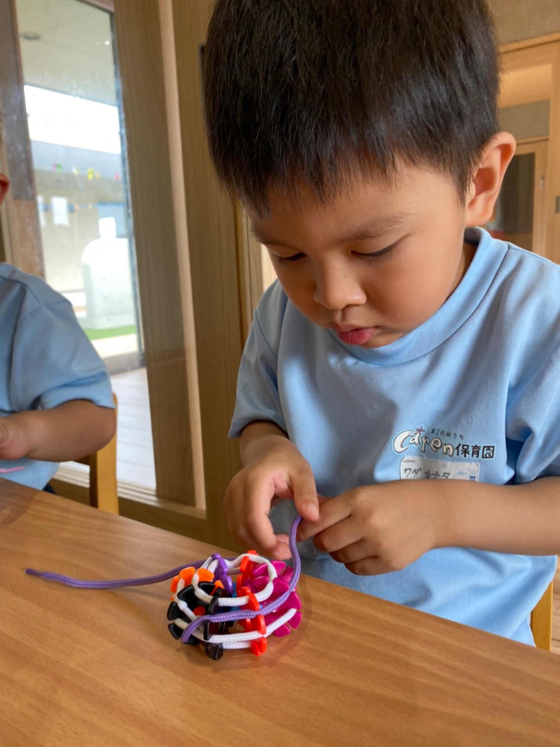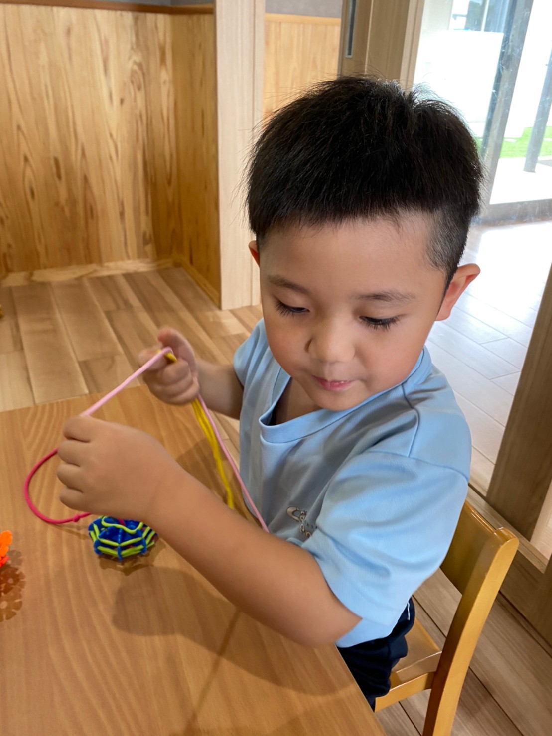 ジスターを紐で通してお兄さんのお友達が蜘蛛の巣を作って見せると真似して紐を通したり、色んな形を作って仲良く遊んでいましたよ☺️✨