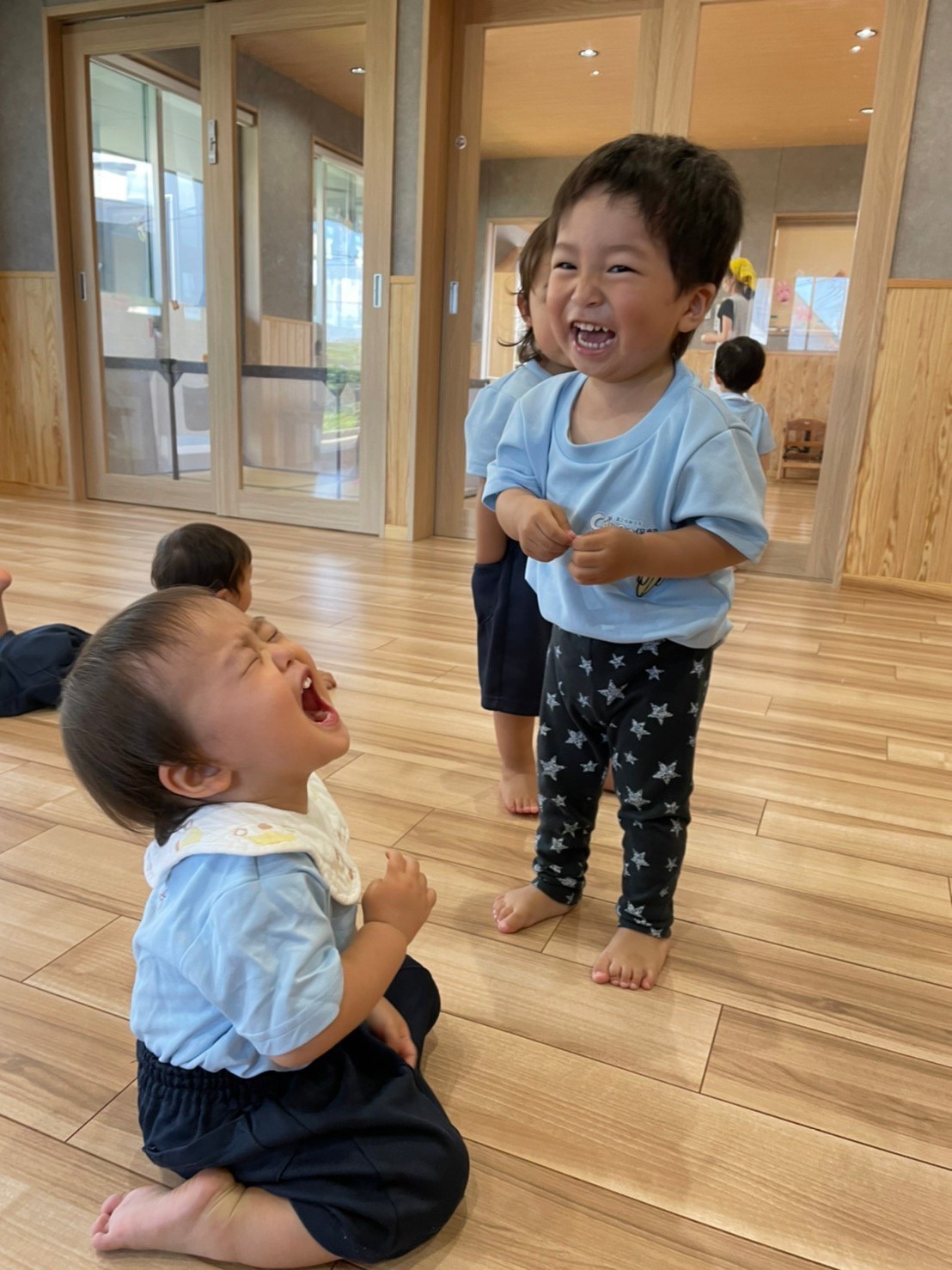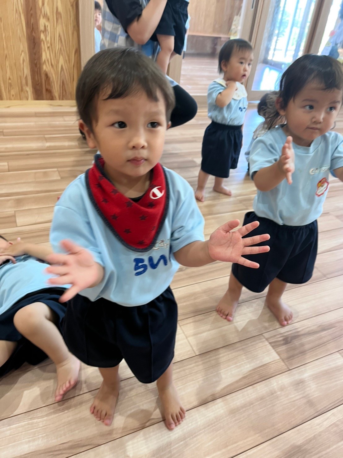 保育士が前で踊る振り付けを一生懸命に真似して踊る子どもたち☺️🎶