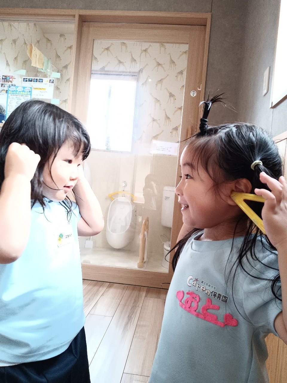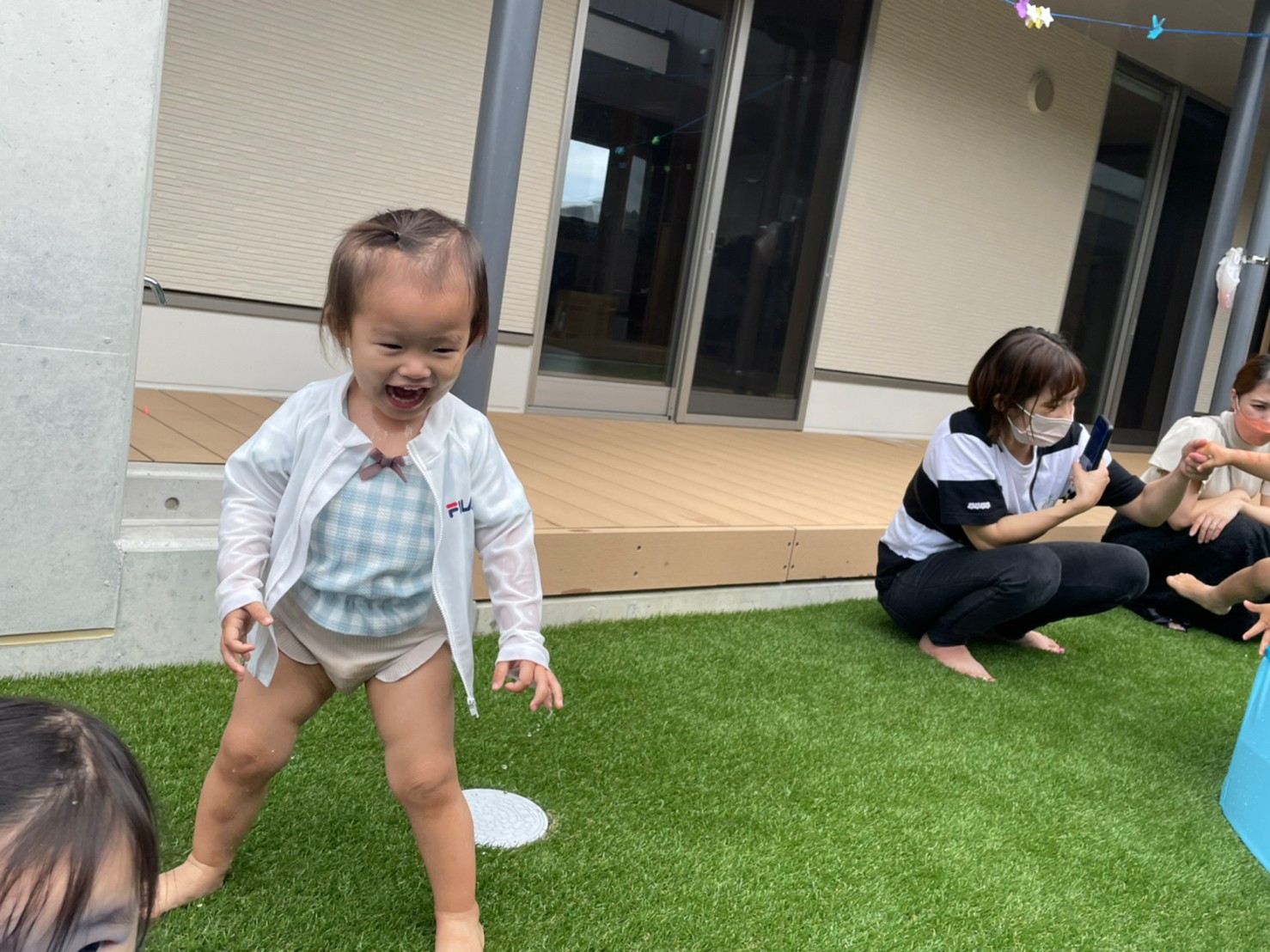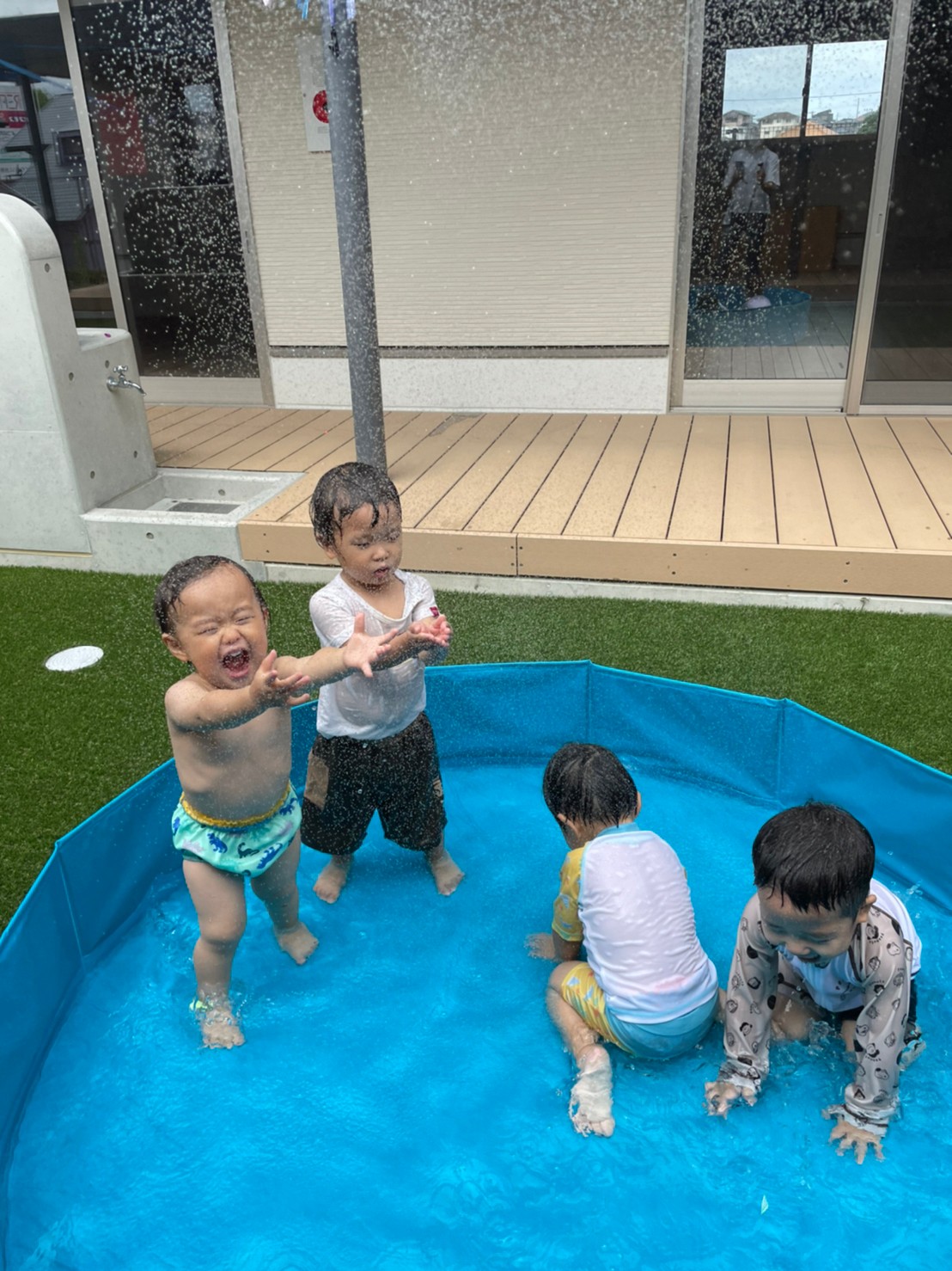 待ちに待った水遊びに大喜びの子どもたち!先生がシャワーで水をかけると「きゃーー😆」と笑顔で楽しむ様子がみられました!うざきこあらきりん組