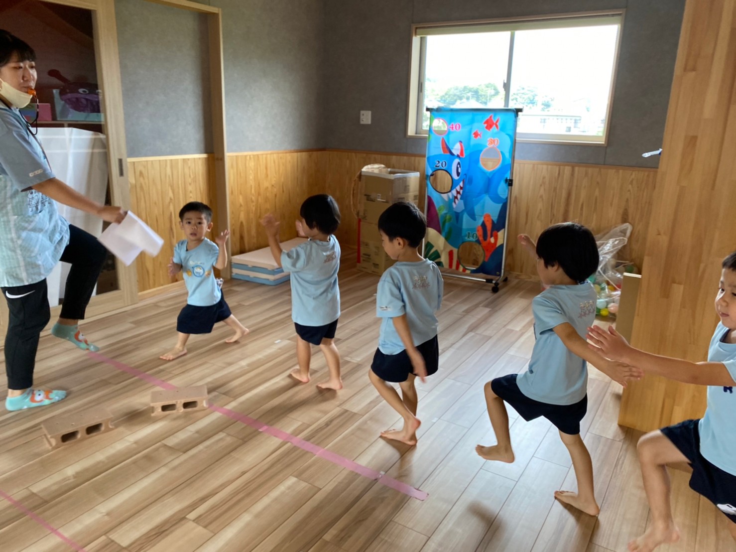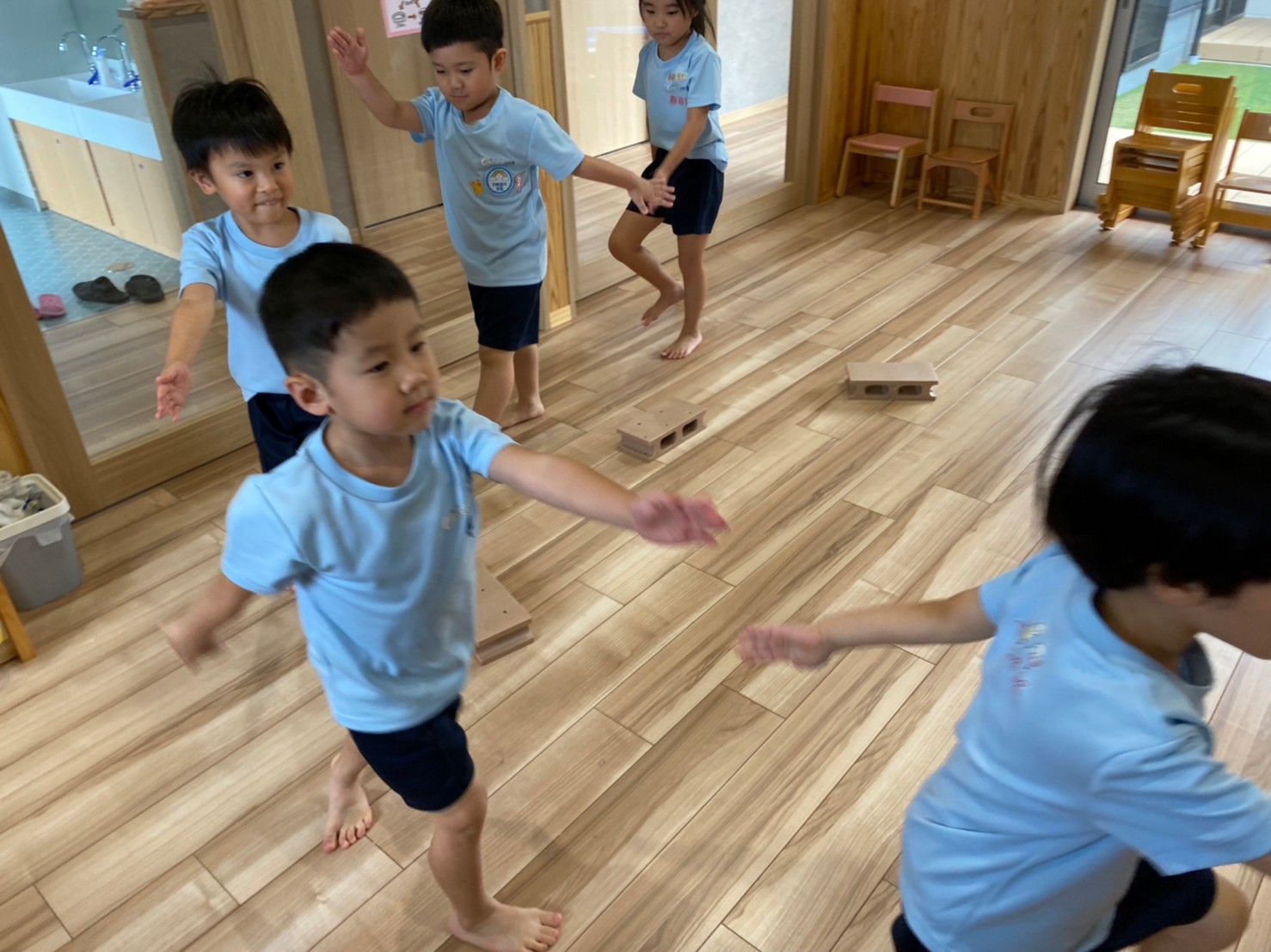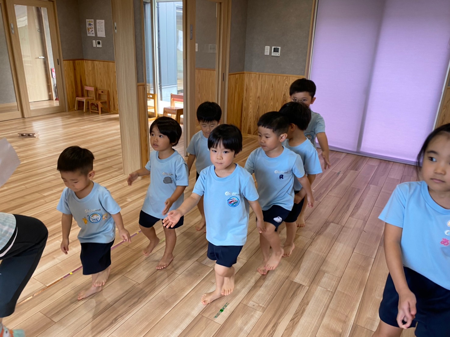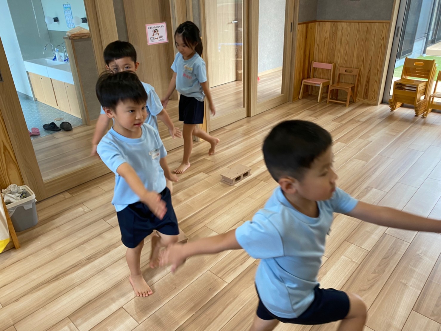 廊下や園庭などいつもと違う景色の中でお友達とあっちこっちいこう!と誘い合う姿が見られました😍