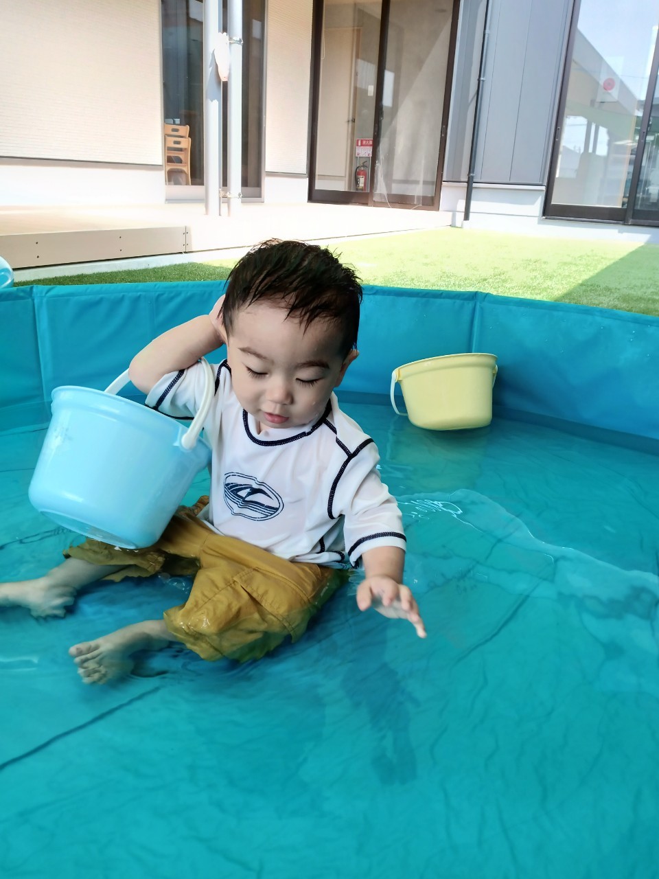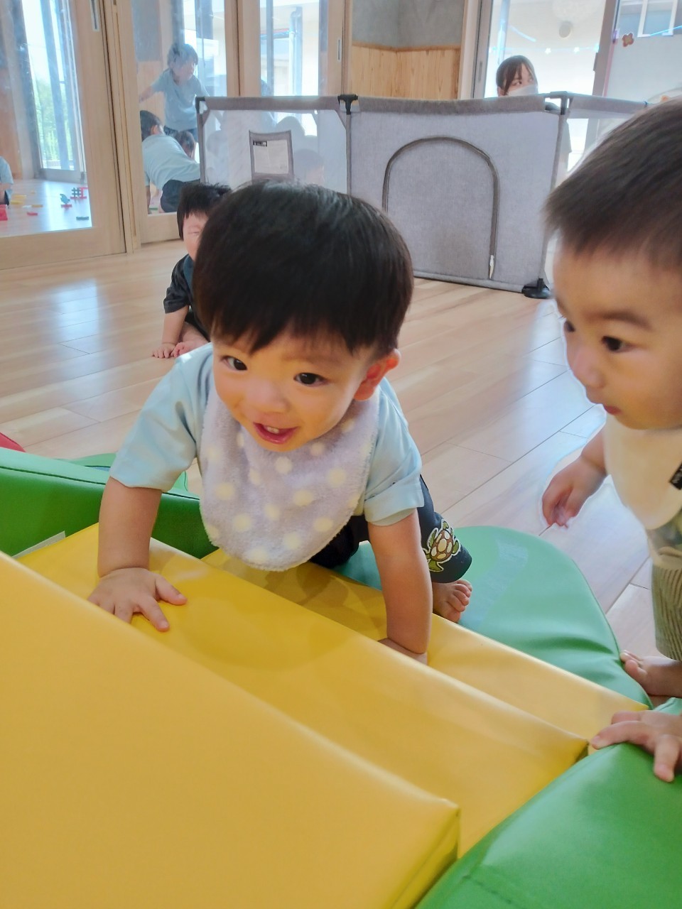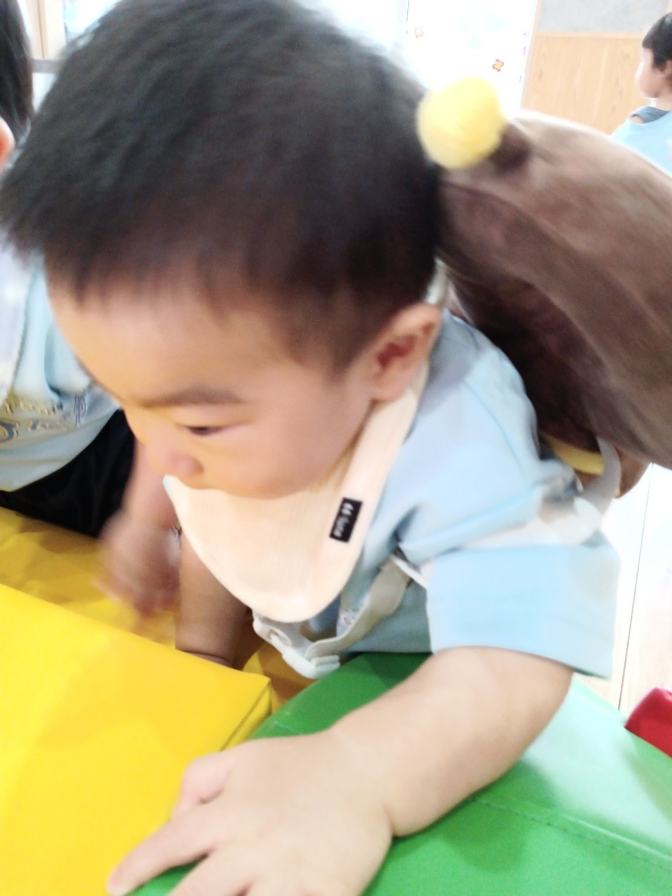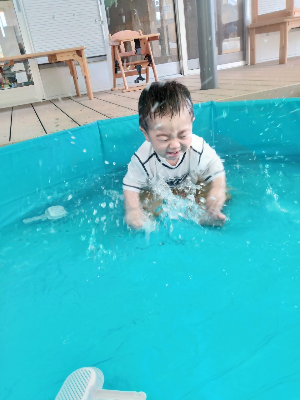 今日から久しぶりの登園に泣く子もいましたがすぐに今までの生活に戻り大好きな玩具で遊んでいました☺️今日は水遊びの日で、久しぶりだったのでプールの中にはいり思いっきり楽しむ様子が見られました🙂また部屋遊びの子も音が出る玩具や新しくきた亀🐢さんのプレイマットに興味を持ち、階段を登ったり、滑り台をすべったりと楽しく遊ぶ事ができました👏