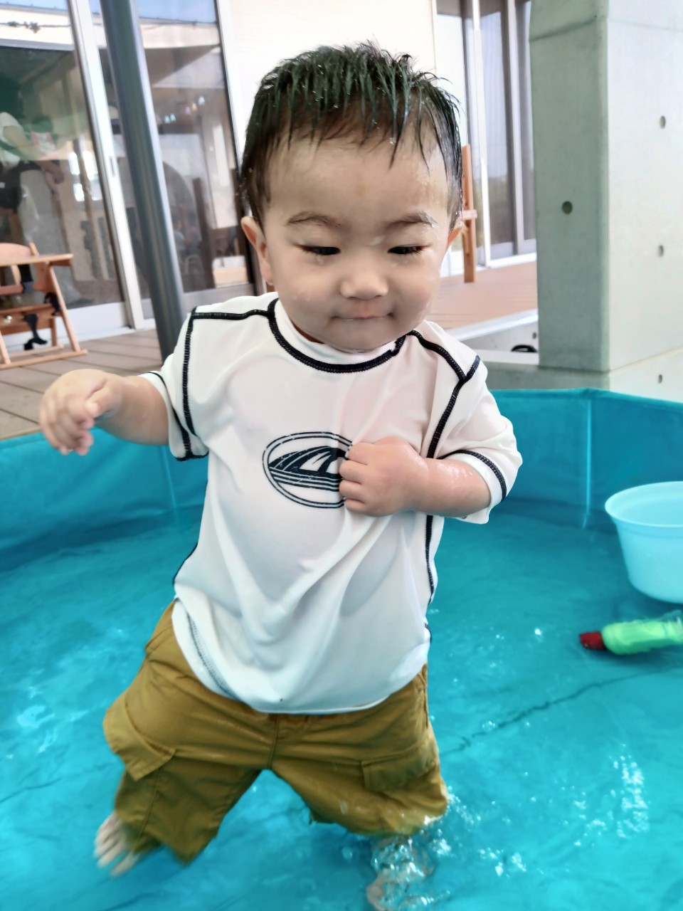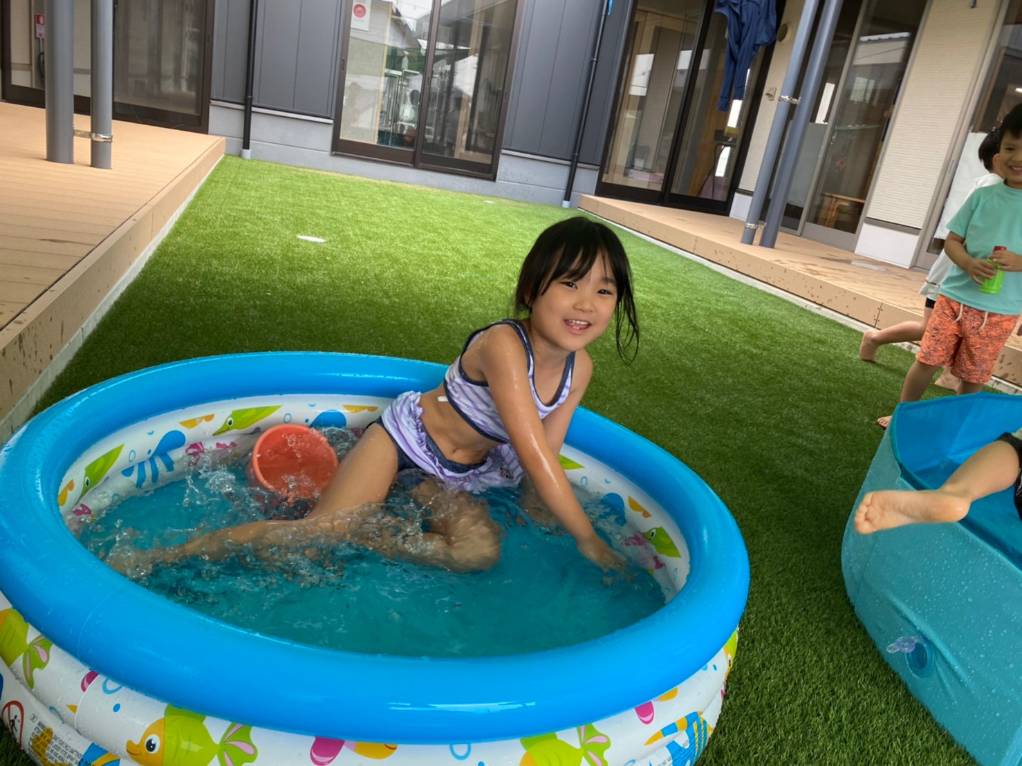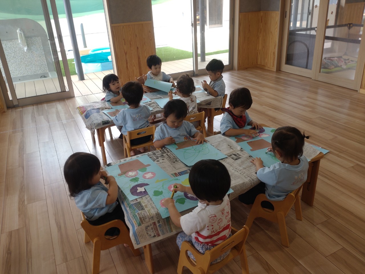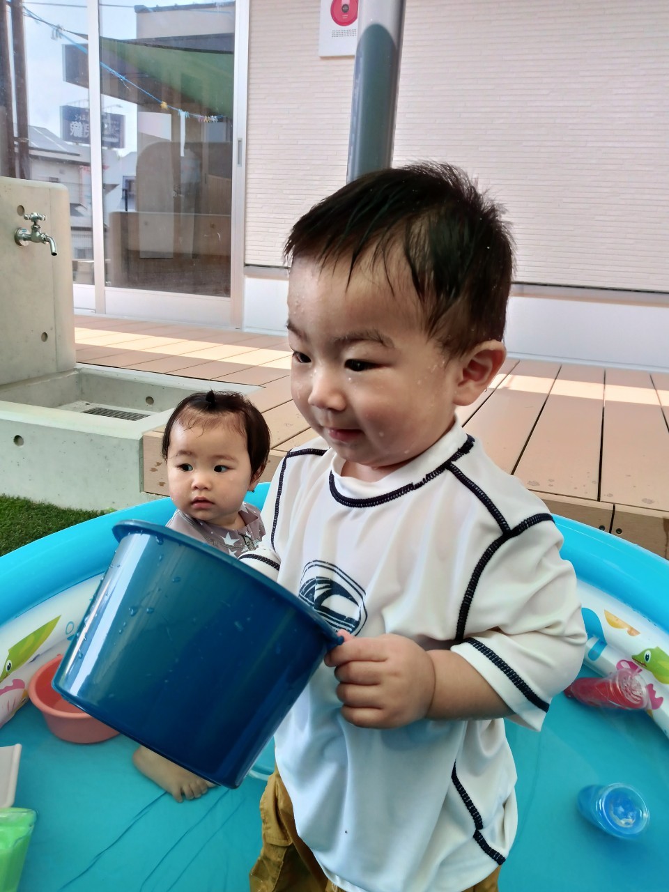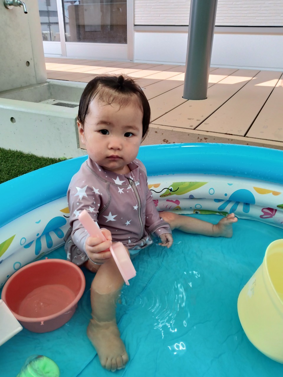 今日から久しぶりの登園に泣く子もいましたがすぐに今までの生活に戻り大好きな玩具で遊んでいました☺️今日は水遊びの日で、久しぶりだったのでプールの中にはいり思いっきり楽しむ様子が見られました🙂また部屋遊びの子も音が出る玩具や新しくきた亀🐢さんのプレイマットに興味を持ち、階段を登ったり、滑り台をすべったりと楽しく遊ぶ事ができました👏