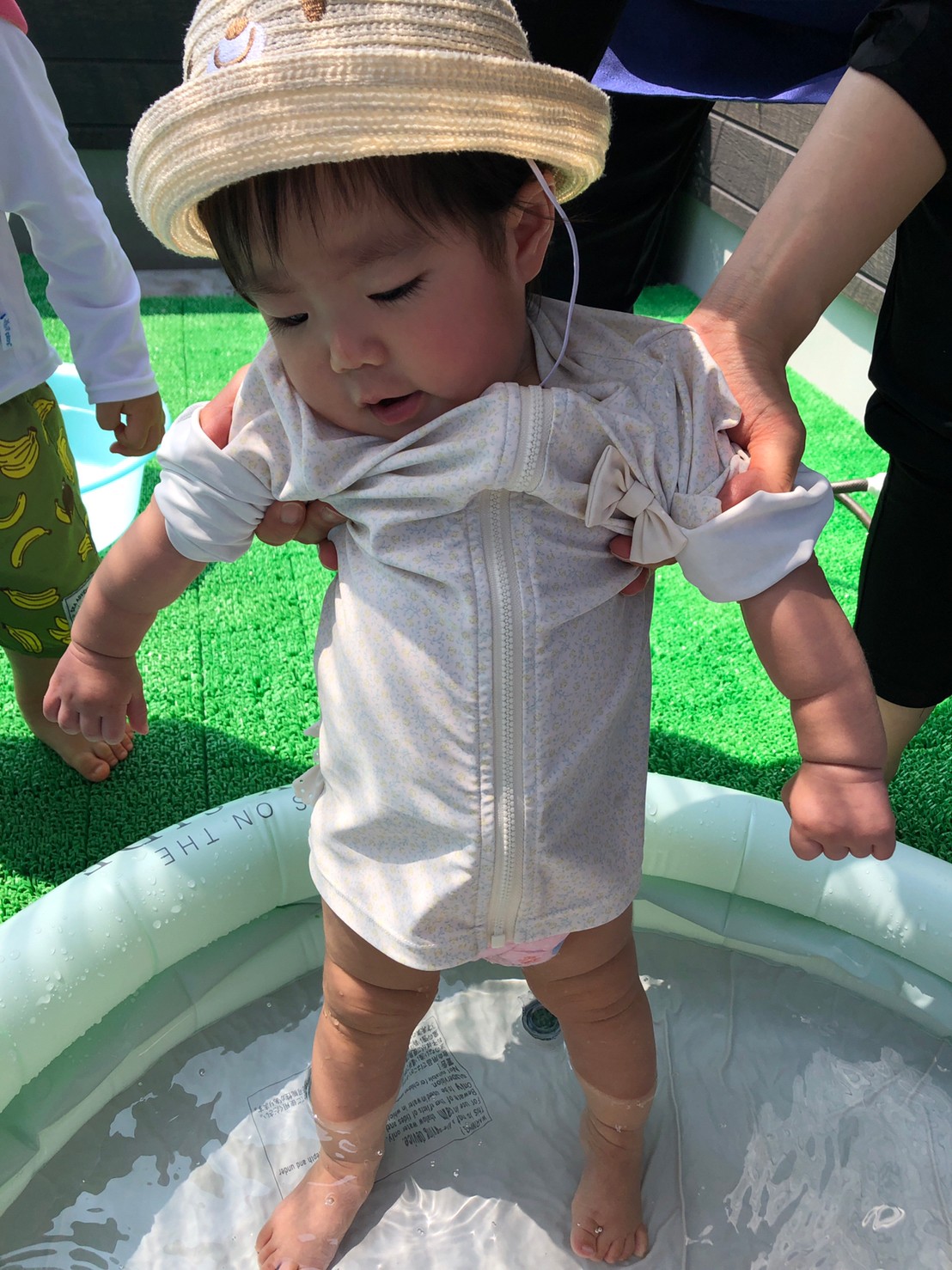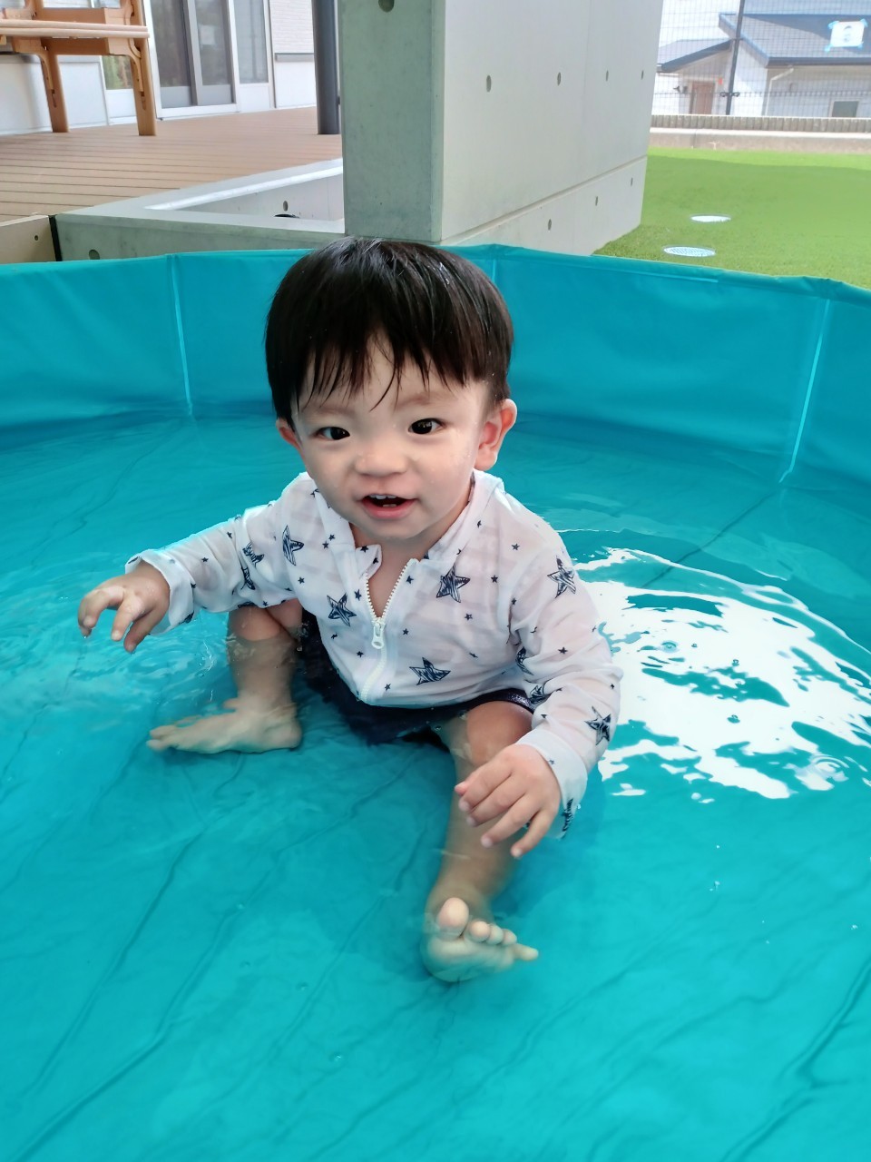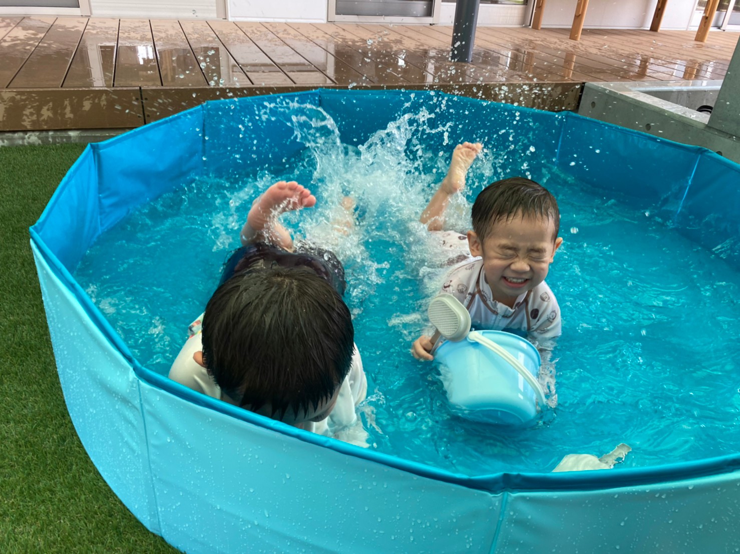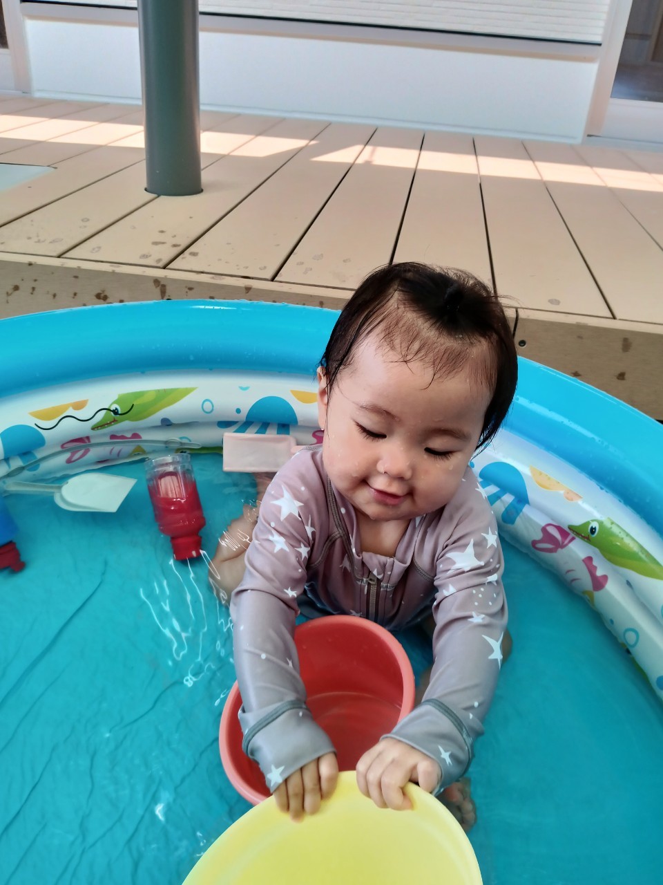 今日から久しぶりの登園に泣く子もいましたがすぐに今までの生活に戻り大好きな玩具で遊んでいました☺️今日は水遊びの日で、久しぶりだったのでプールの中にはいり思いっきり楽しむ様子が見られました🙂また部屋遊びの子も音が出る玩具や新しくきた亀🐢さんのプレイマットに興味を持ち、階段を登ったり、滑り台をすべったりと楽しく遊ぶ事ができました👏