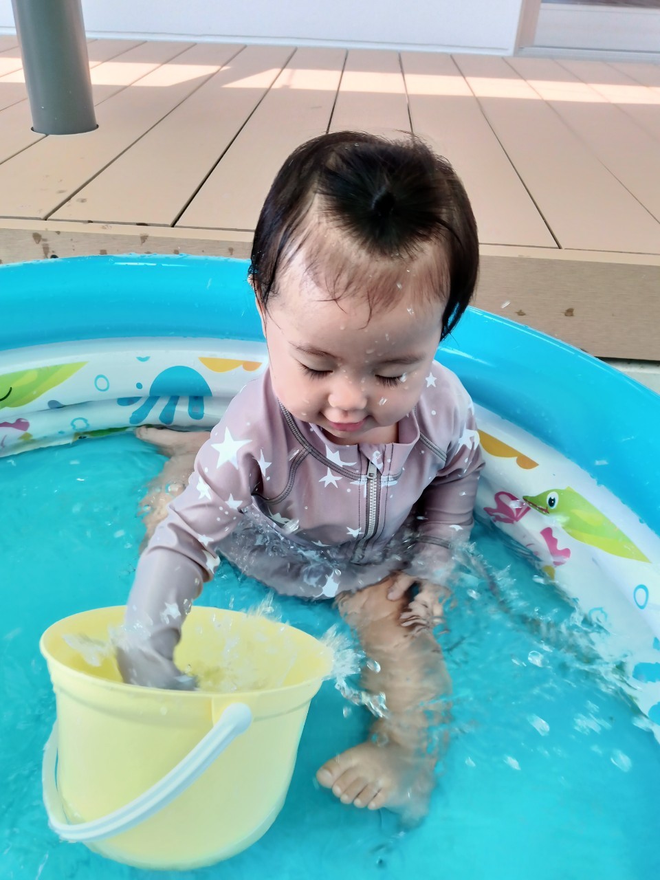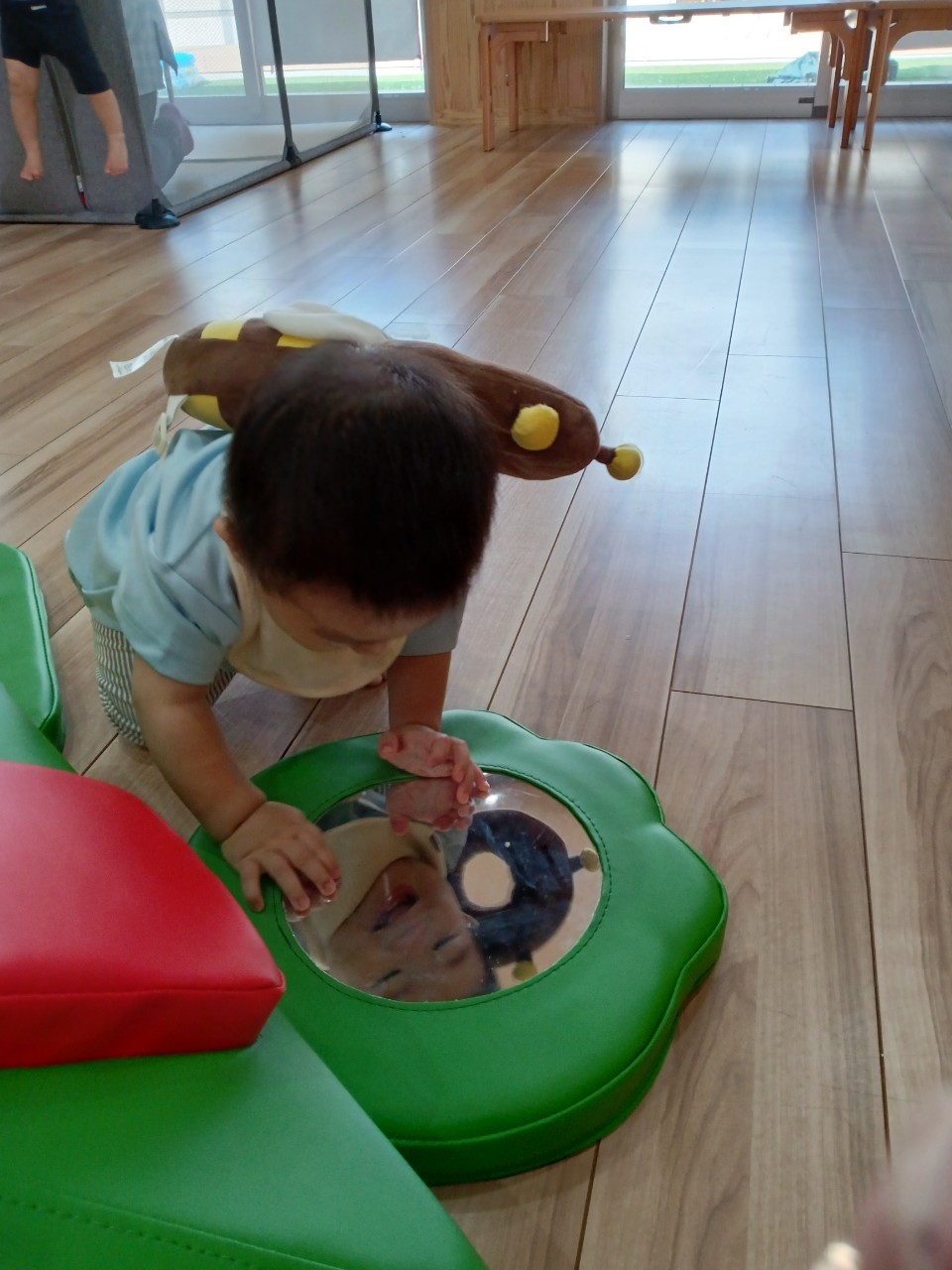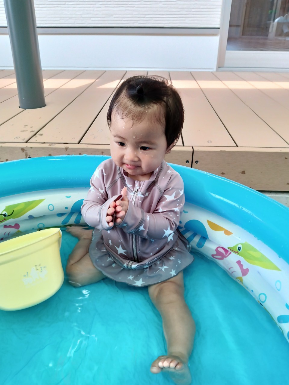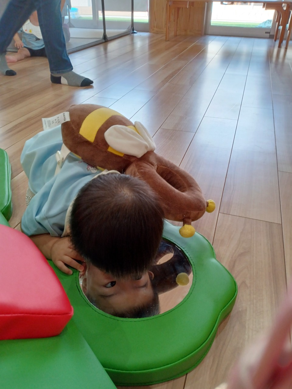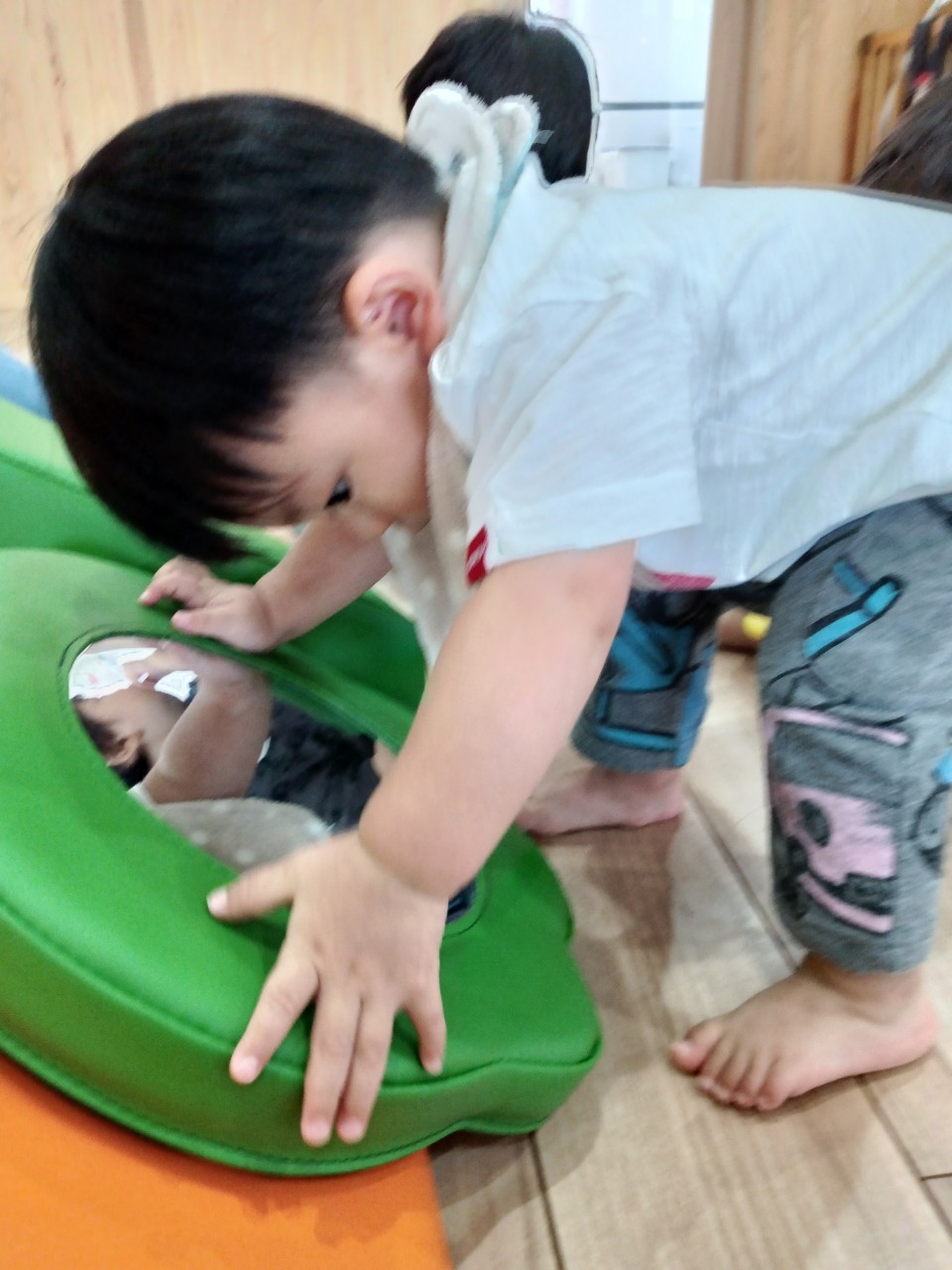 今日から久しぶりの登園に泣く子もいましたがすぐに今までの生活に戻り大好きな玩具で遊んでいました☺️今日は水遊びの日で、久しぶりだったのでプールの中にはいり思いっきり楽しむ様子が見られました🙂また部屋遊びの子も音が出る玩具や新しくきた亀🐢さんのプレイマットに興味を持ち、階段を登ったり、滑り台をすべったりと楽しく遊ぶ事ができました👏