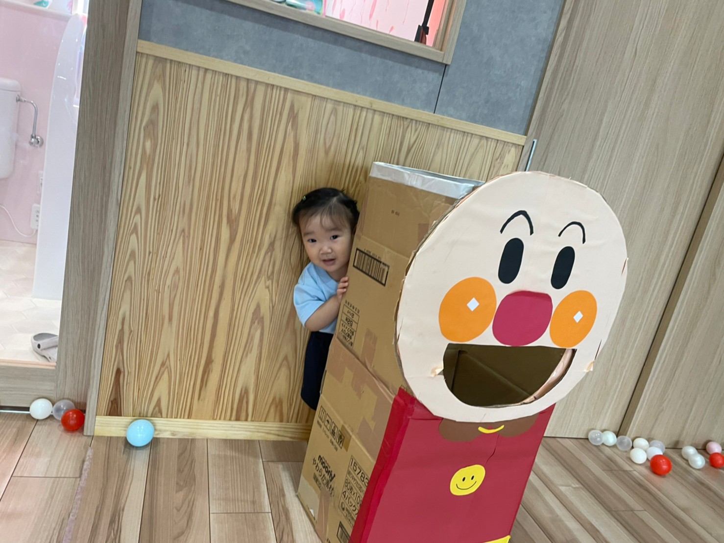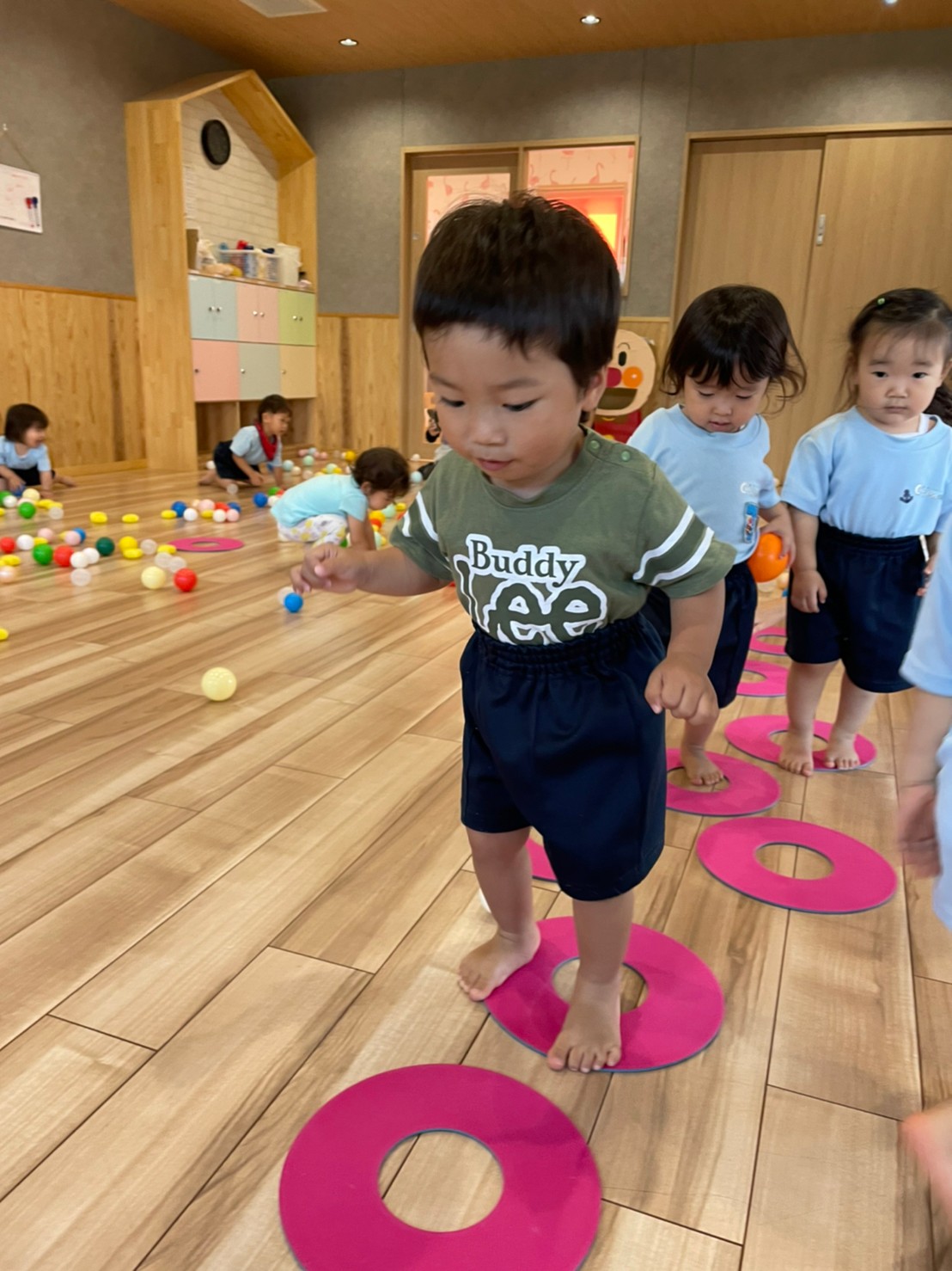 アンパンマンのゴールにボールをたくさん集めたり、丸型のマットをジャンプで進んだりして楽しみました😌✨