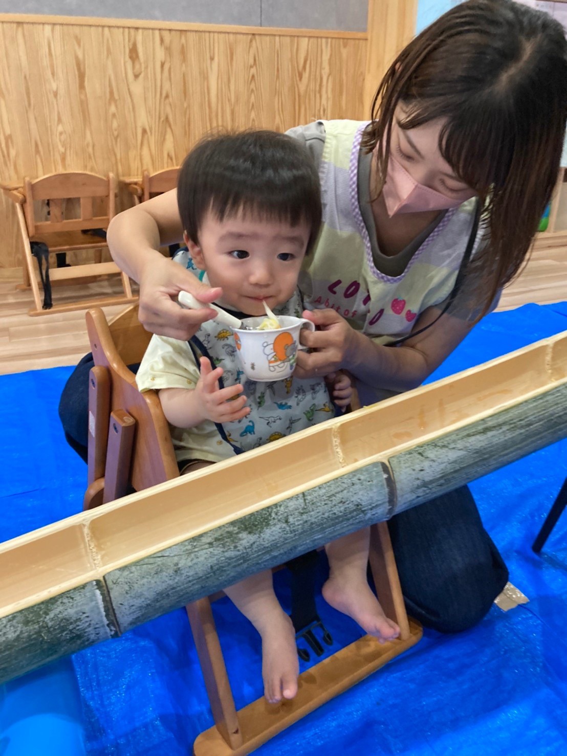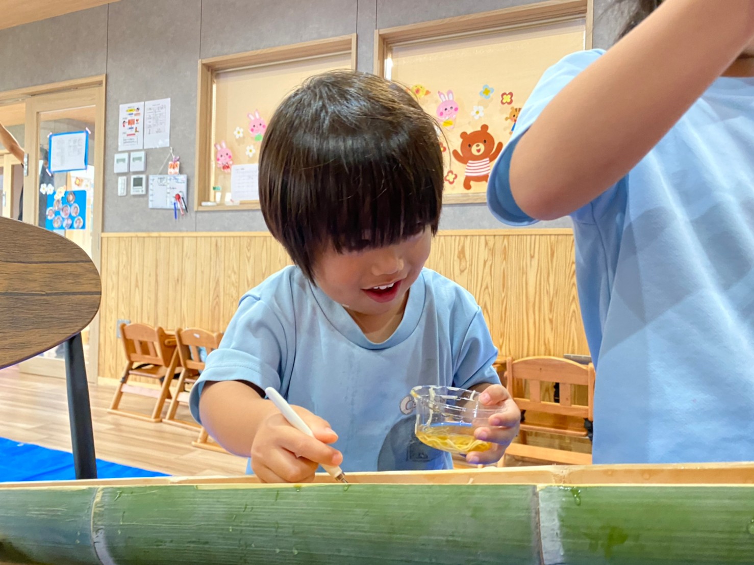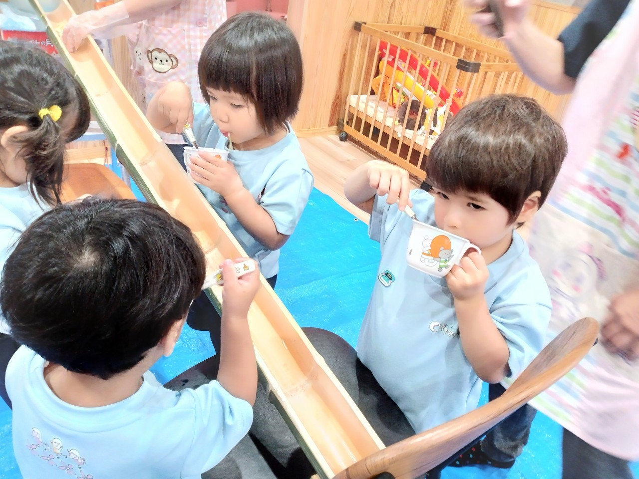 最初不思議そうに竹を見つめていた子どもたちでしたが先生と一緒にそうめんをすくい、モリモリ食べてそうめん流しを満喫しました🥰