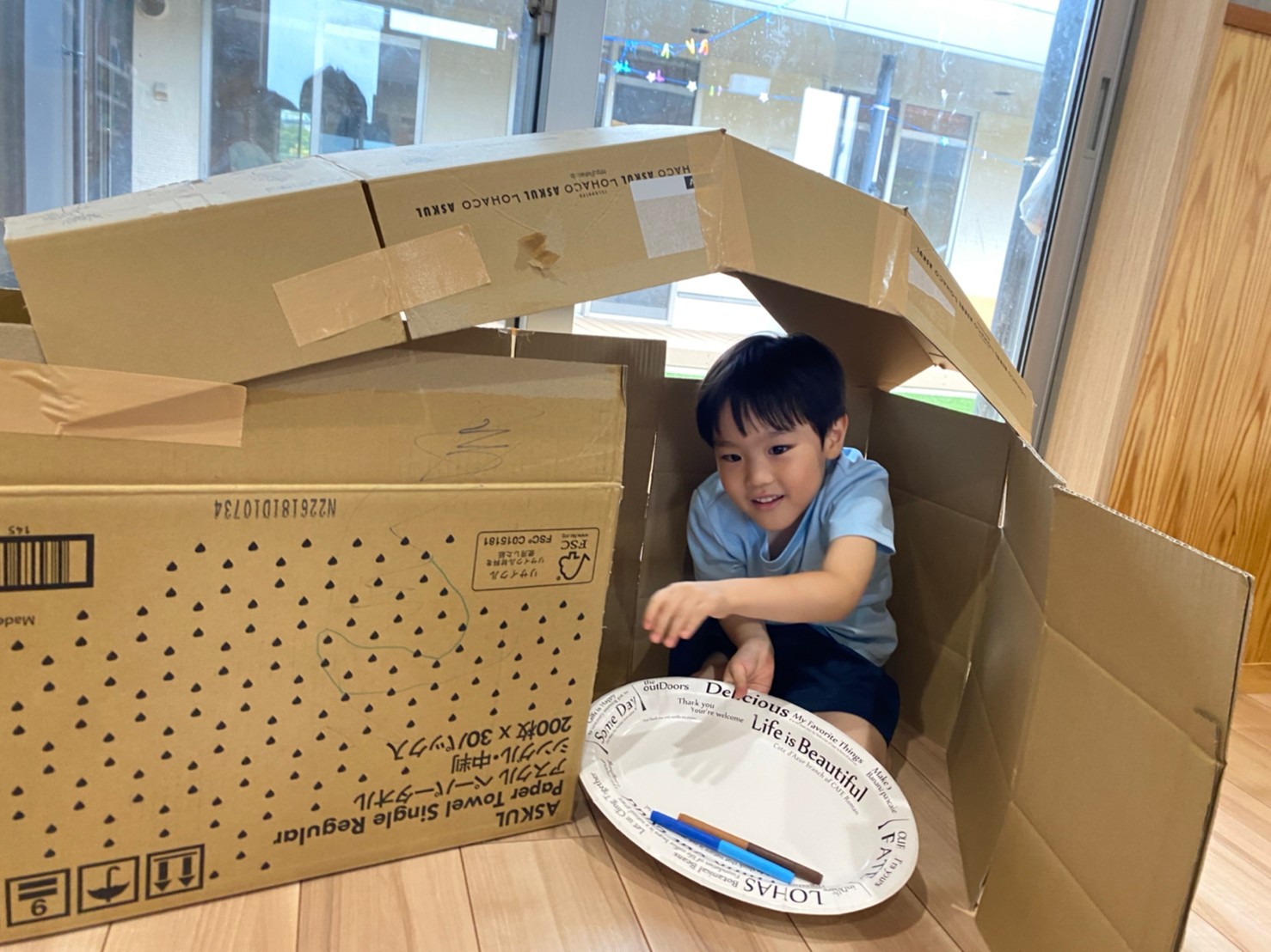 不要な段ボールをたくさん集めて、みんなで大きな家を作りましたよ🏠!