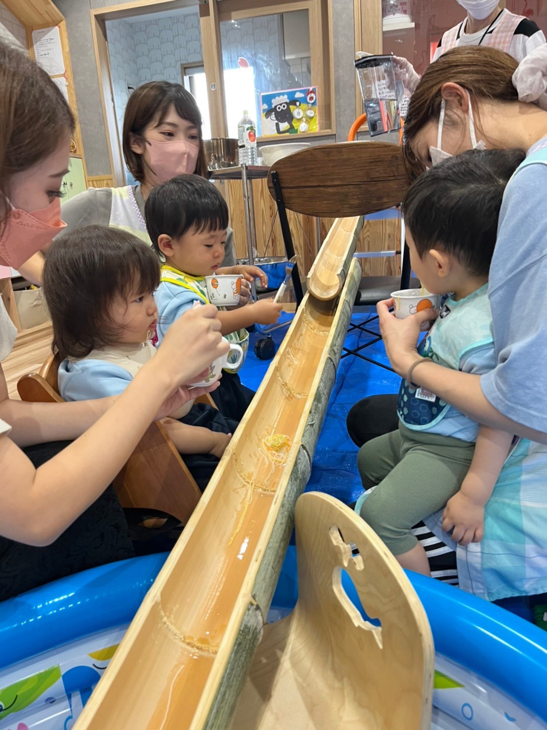 今日はそうめん流しに参加しました😌順番がまわってくるまで楽しみだったようで「まだかな?まだかな?」と楽しみに待つ姿が見られました😊はじめはなかなか掬えない子もいましたがこつをつかむとフォークを上手に使い流れるそうめんを掬えていました☺️思い出になる体験ができました😊うさぎ、こあら、きりん組