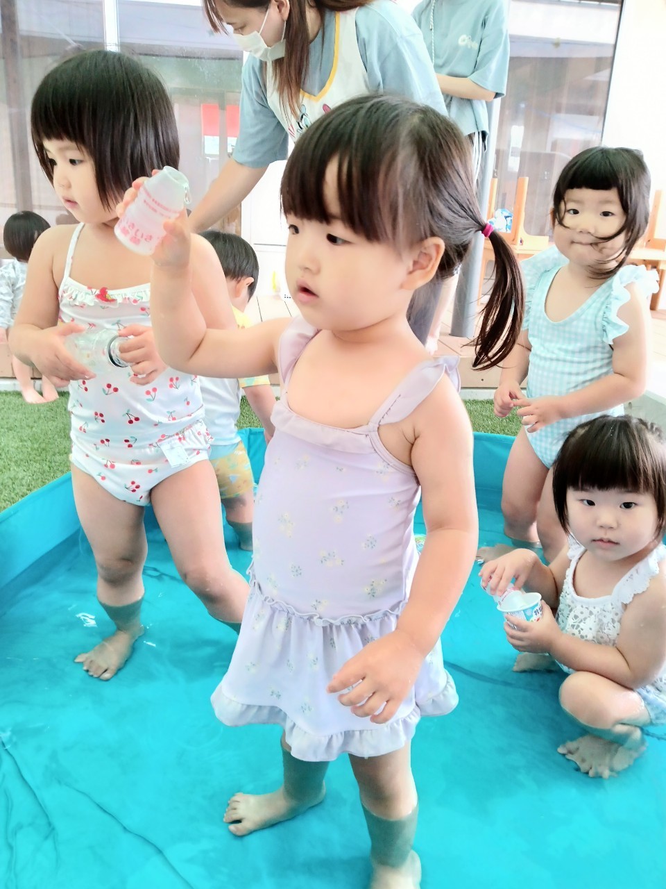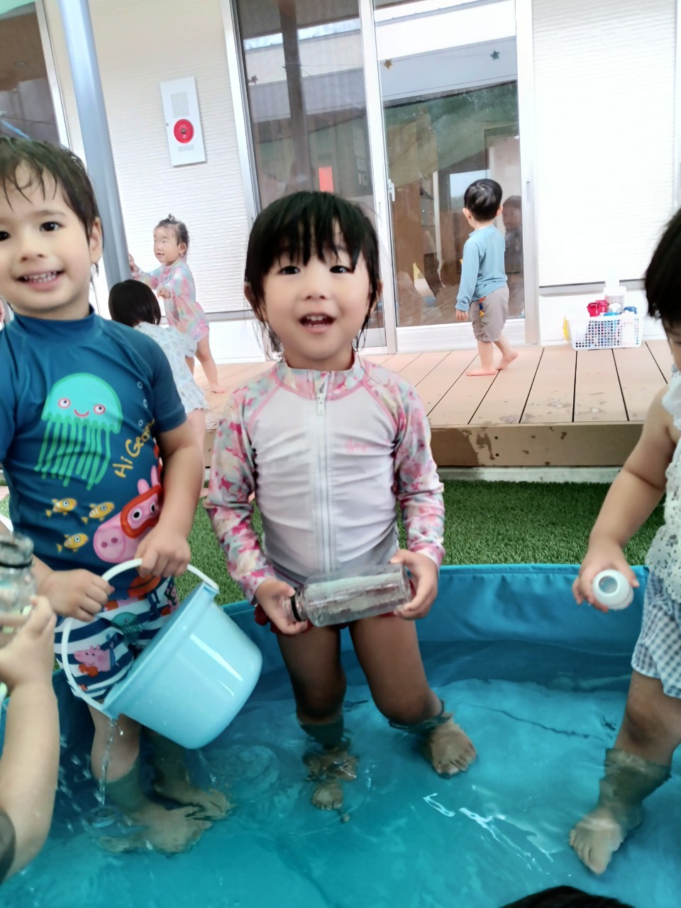 今日は水遊びの日でした🎶久しぶりの水遊びにみんな楽しむ姿が見られました💕猛暑日ではなく少し涼しかったが、水分補給もこまめに行ないました🤗