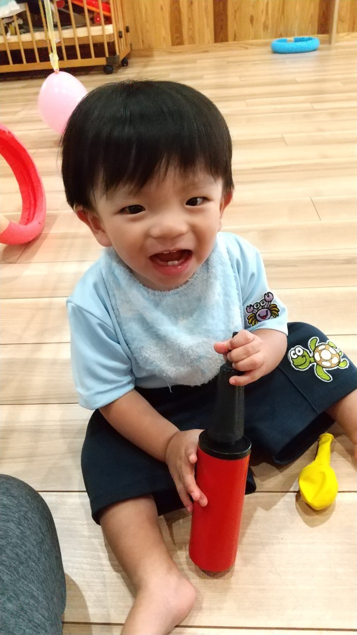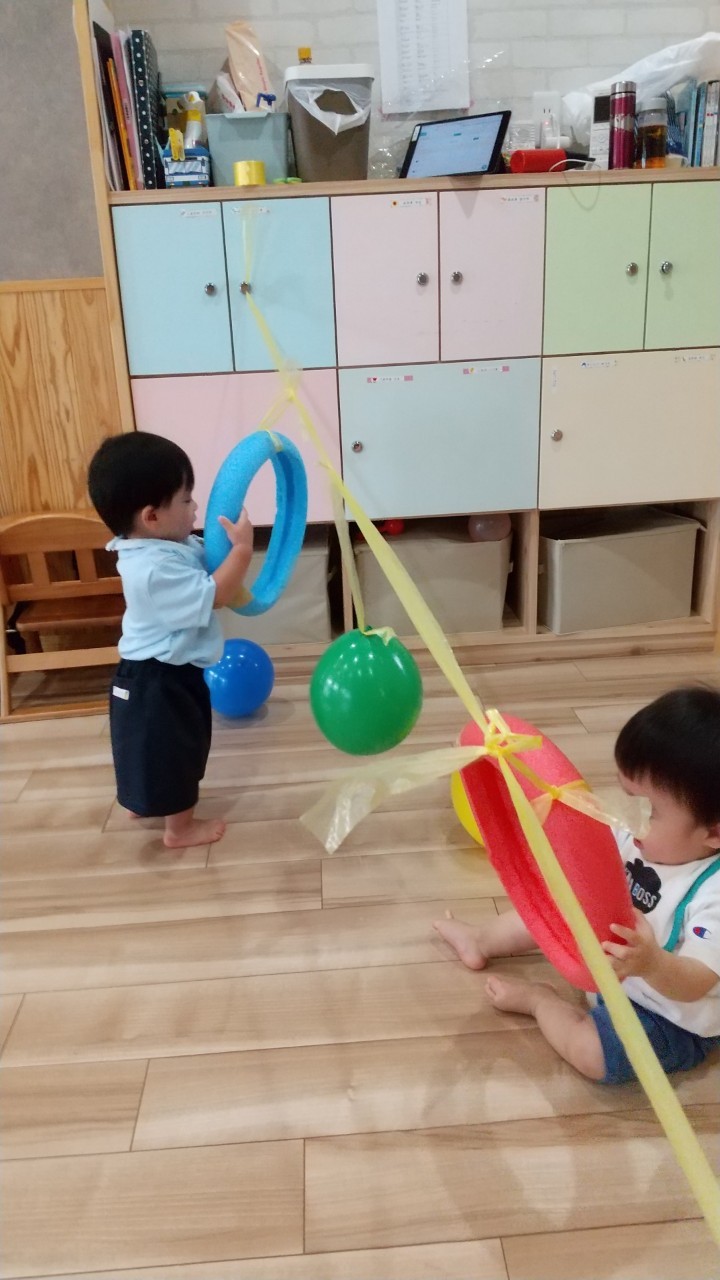 みんなで風船🎈やウレタンフープ遊びをしました!吊るし風船がユラユラ揺れるとタッチしたり引っ張ったりして、感触を楽しんであそびました💖