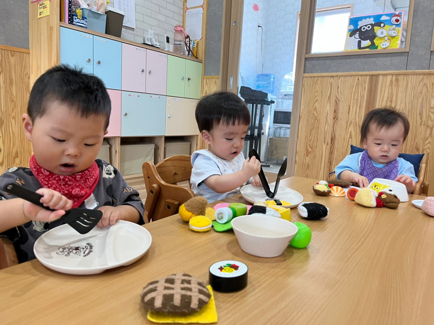 その後はおままごとをお椅子に座ってテーブルですると、ボウルに食べ物を入れて泡立て器で混ぜたり、お皿に食べ物を乗せて先生に「どうぞ」したりだんだん遊び方も成長しているなと感じます!😆りす組🐿