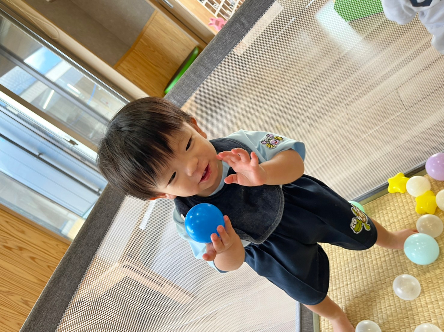 ボールプール遊びでは、みんなカラーボールを手に持ち上手に投げる子もいたり、風船を入れると、風船に興味津々なお友だちもいましたよ☺️💓