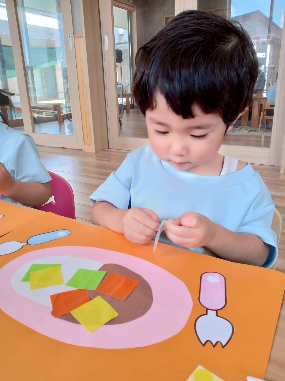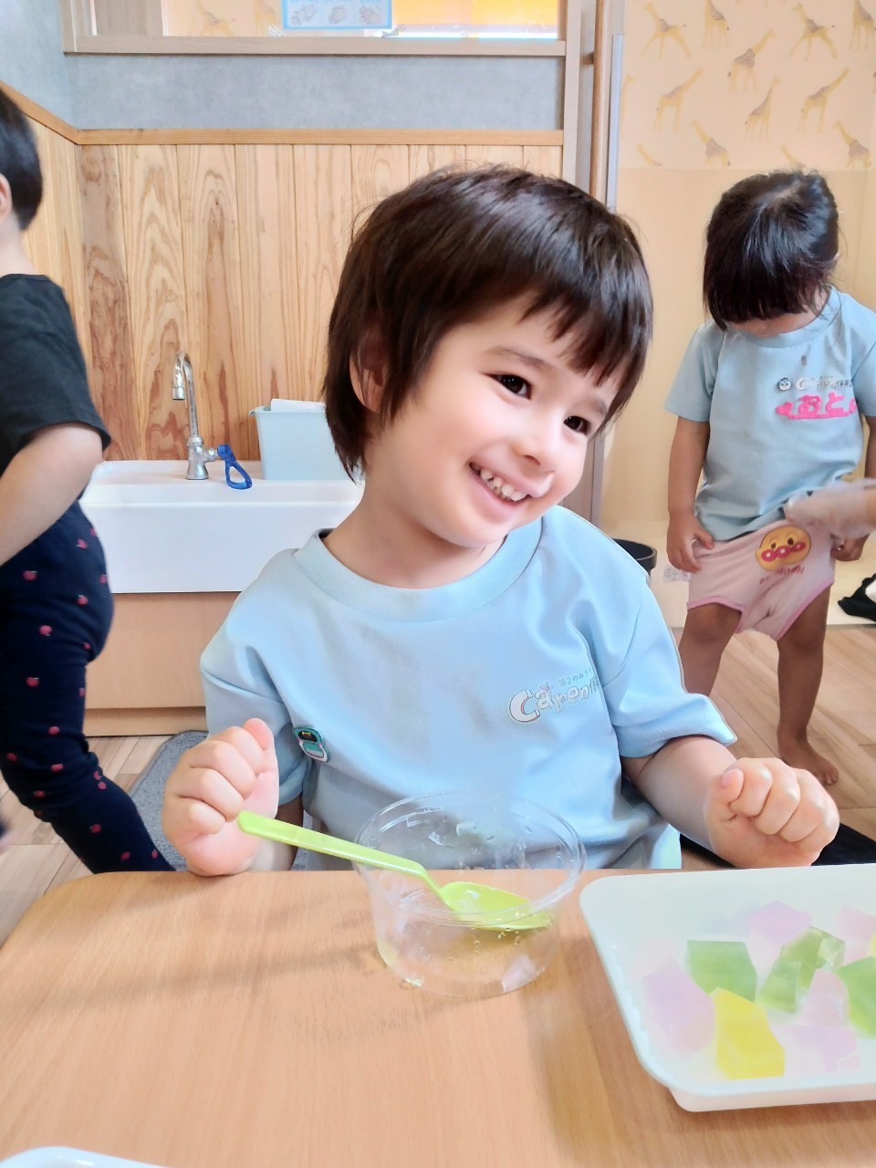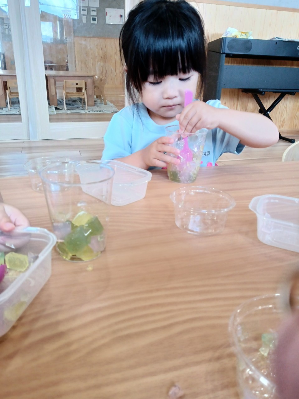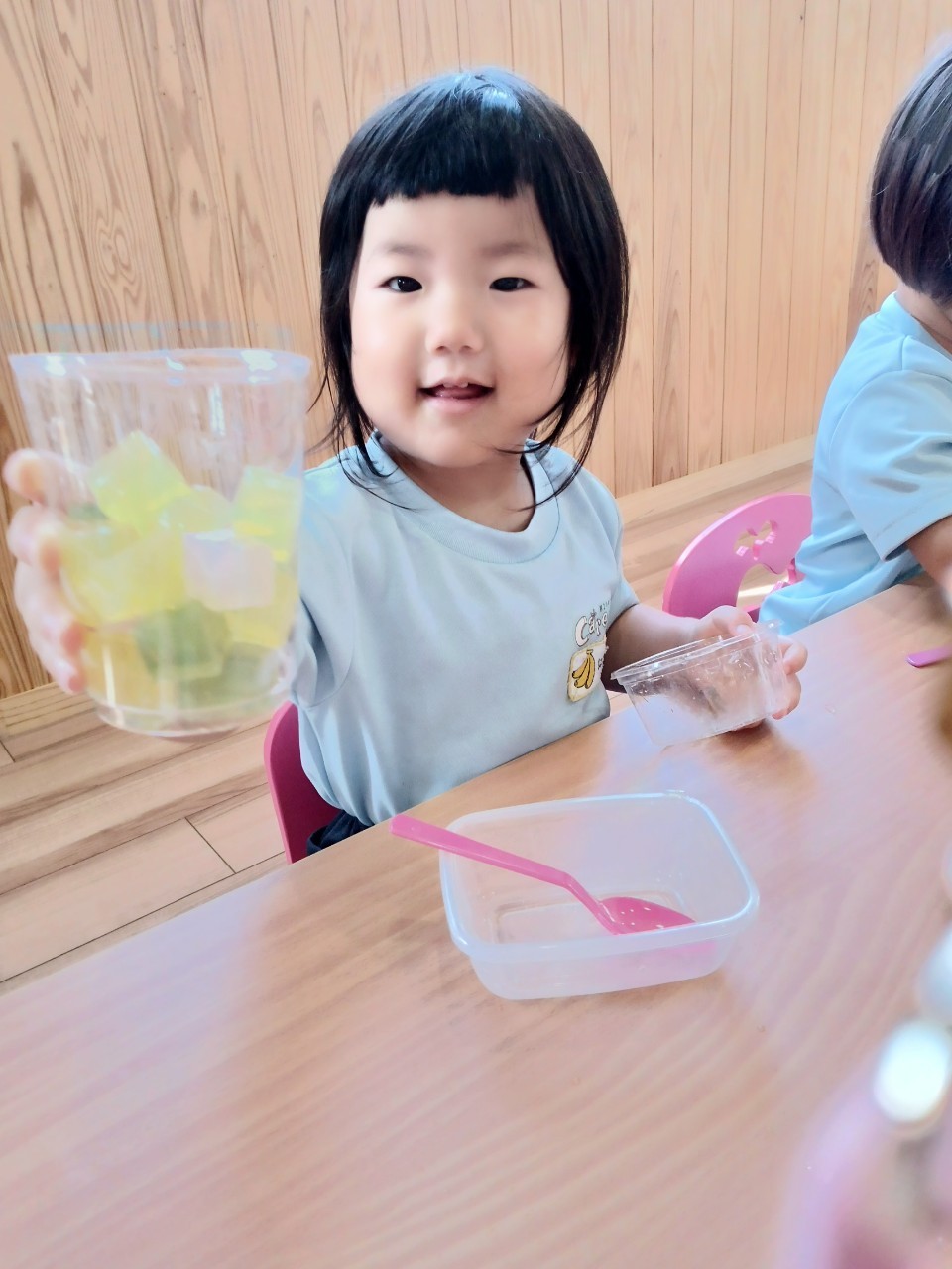 今日は寒天を使い感触や遊びをしました😋寒天の感触に触れたり触った時の冷たさにみんな歓喜していました😊カップやスプーンなどは人数分準備することで一人一人が集中して遊ぶ事ができ、混ぜたり潰したりしながら想像力を膨らませ楽しむことができていました😍。感触遊び後は製作の仕上げでシール貼りをしました🎶シール貼りも集中して取り組め上手にしあがりました😆うさぎ、こあら、きりん組