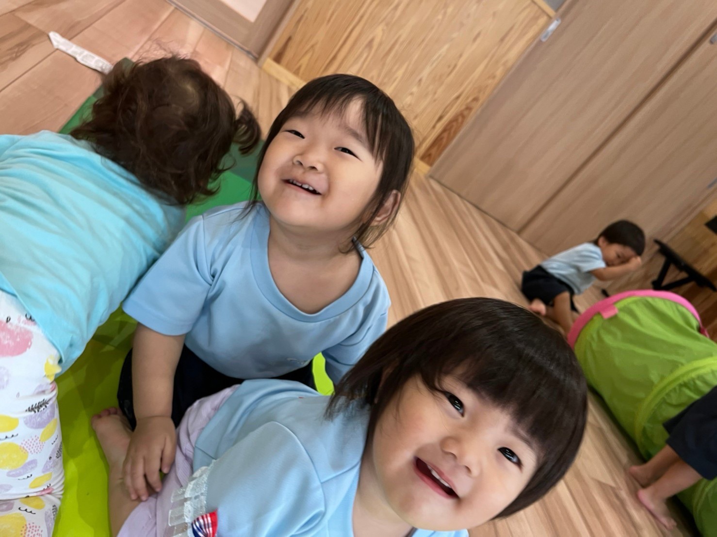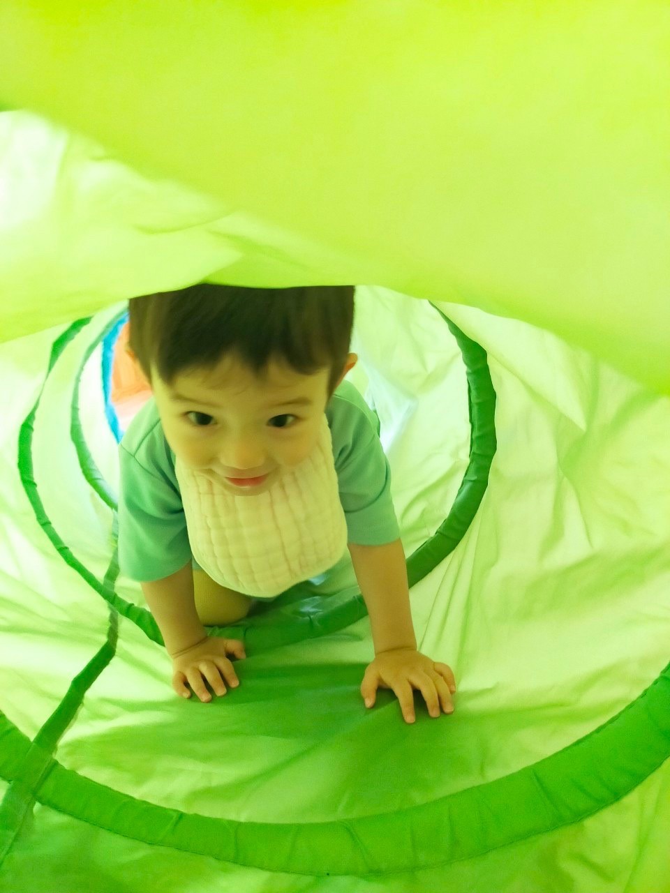 今日はお部屋の中でサーキット遊びをしました!ハイハイでトンネルを何度もくぐったり、マットの上をゴロゴロ転がったり、トランポリンで思いきり飛び跳ねて体をたくさん動かして遊びました😆✨