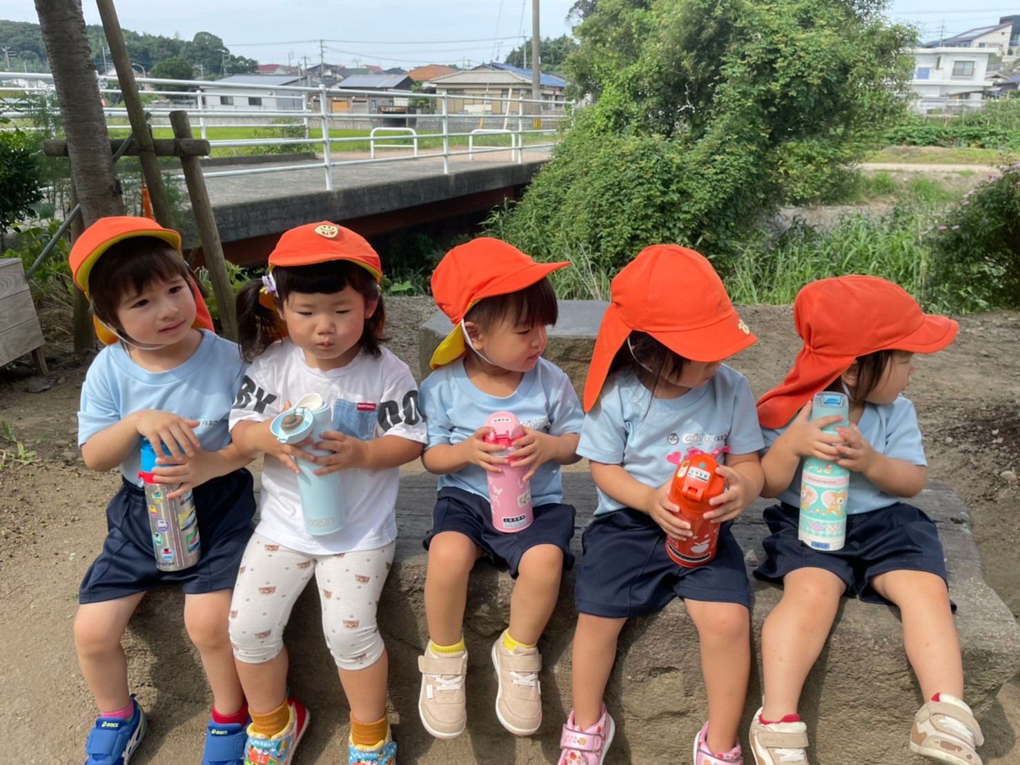 お友達と手を繋いで歩き川の魚や虫を探しながら散歩を楽しみました😊