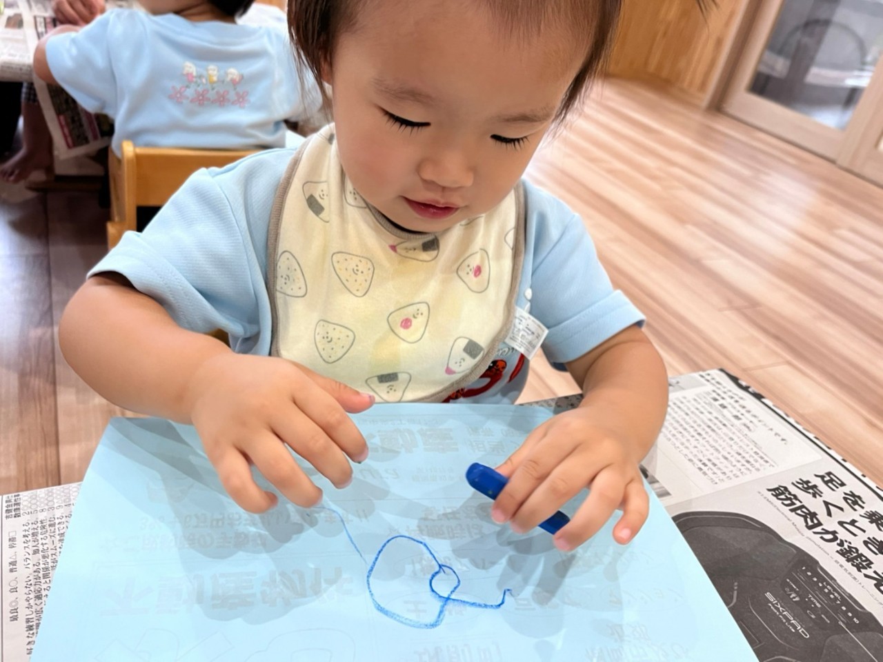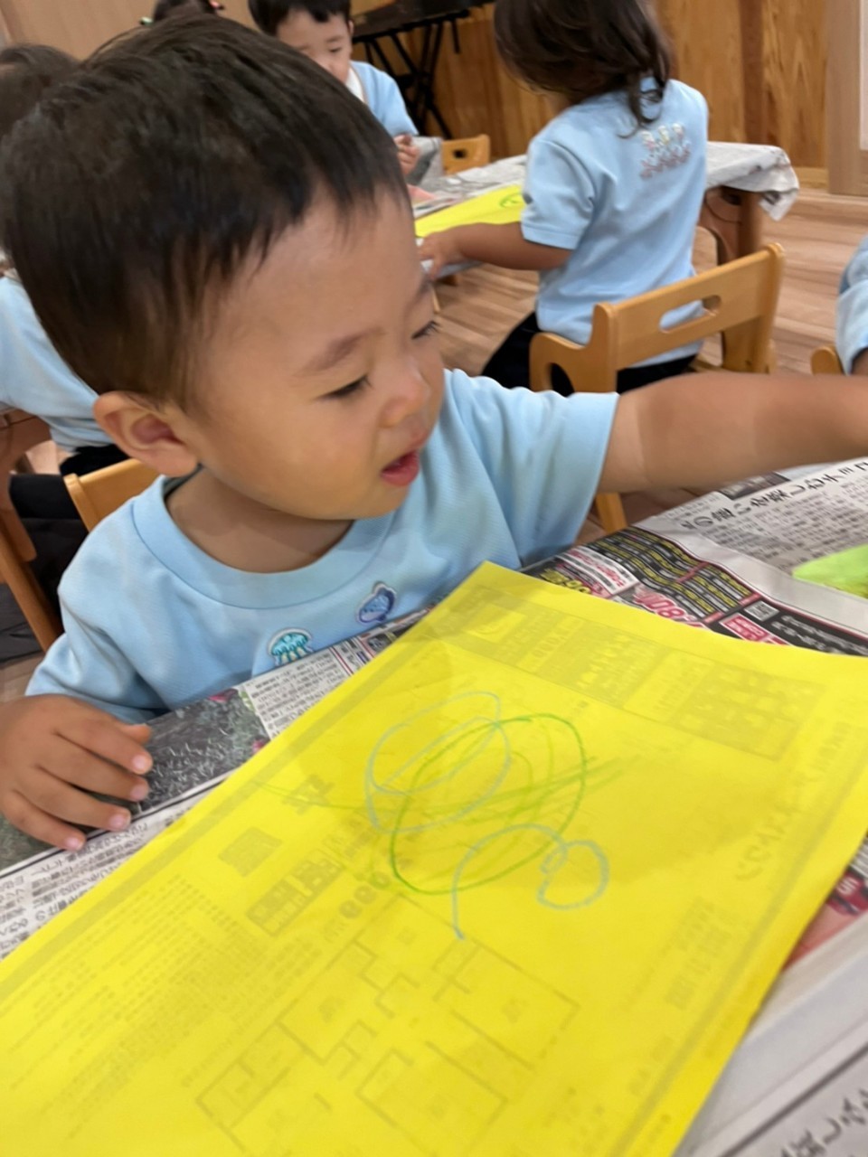 今日は室内でお絵かきやブロック遊びをして楽しみました✨お絵かきでは、思い思いにクレパスを走らせる子、保育士にかいてもらう子、描くことよりもクレパスに興味がある子など様々でしたが、全員椅子に座って楽しく集中して取り組む事ができました☺️