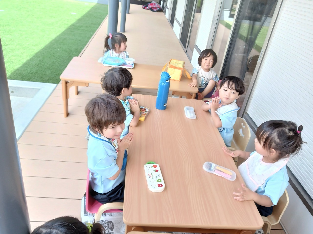 外遊び後は少しだけ磁石のブロックなどで遊び、今日はテラスでのランチタイム🍱に楽しい1日になりました😄うさぎ、こあら、きりん組