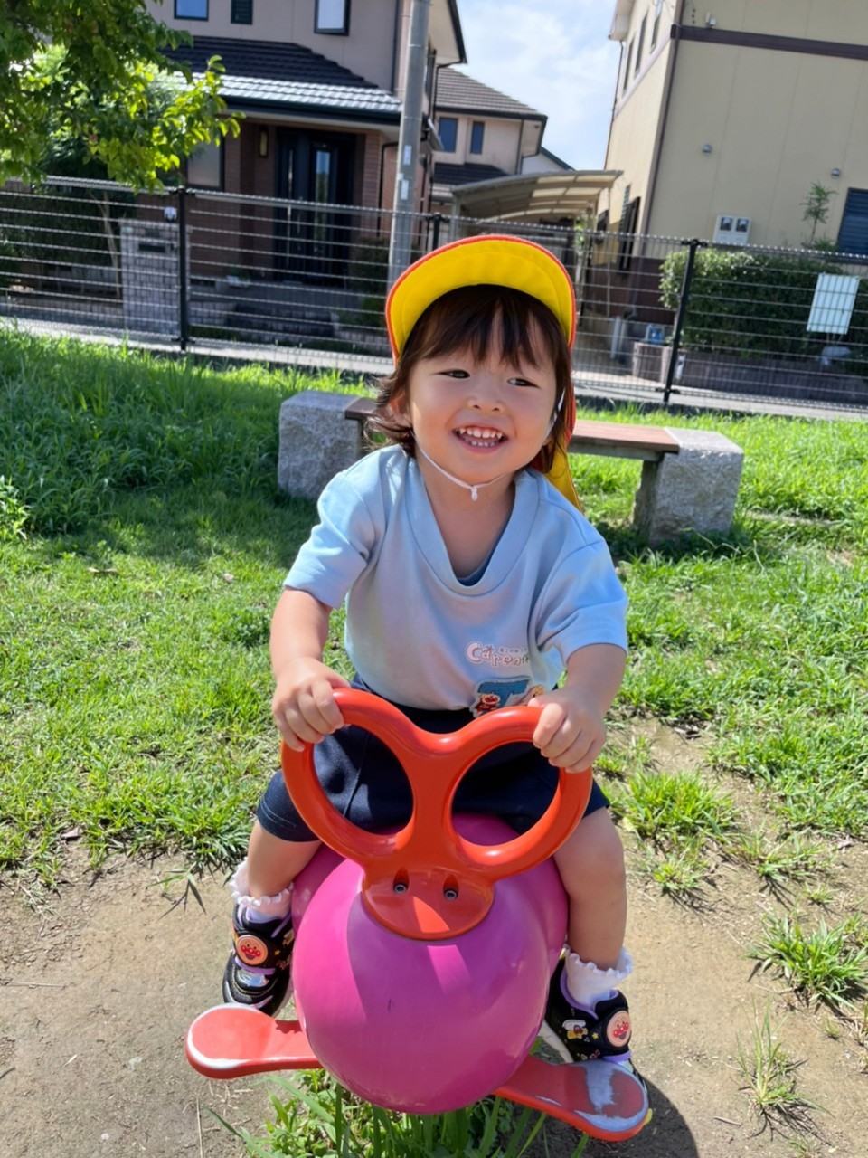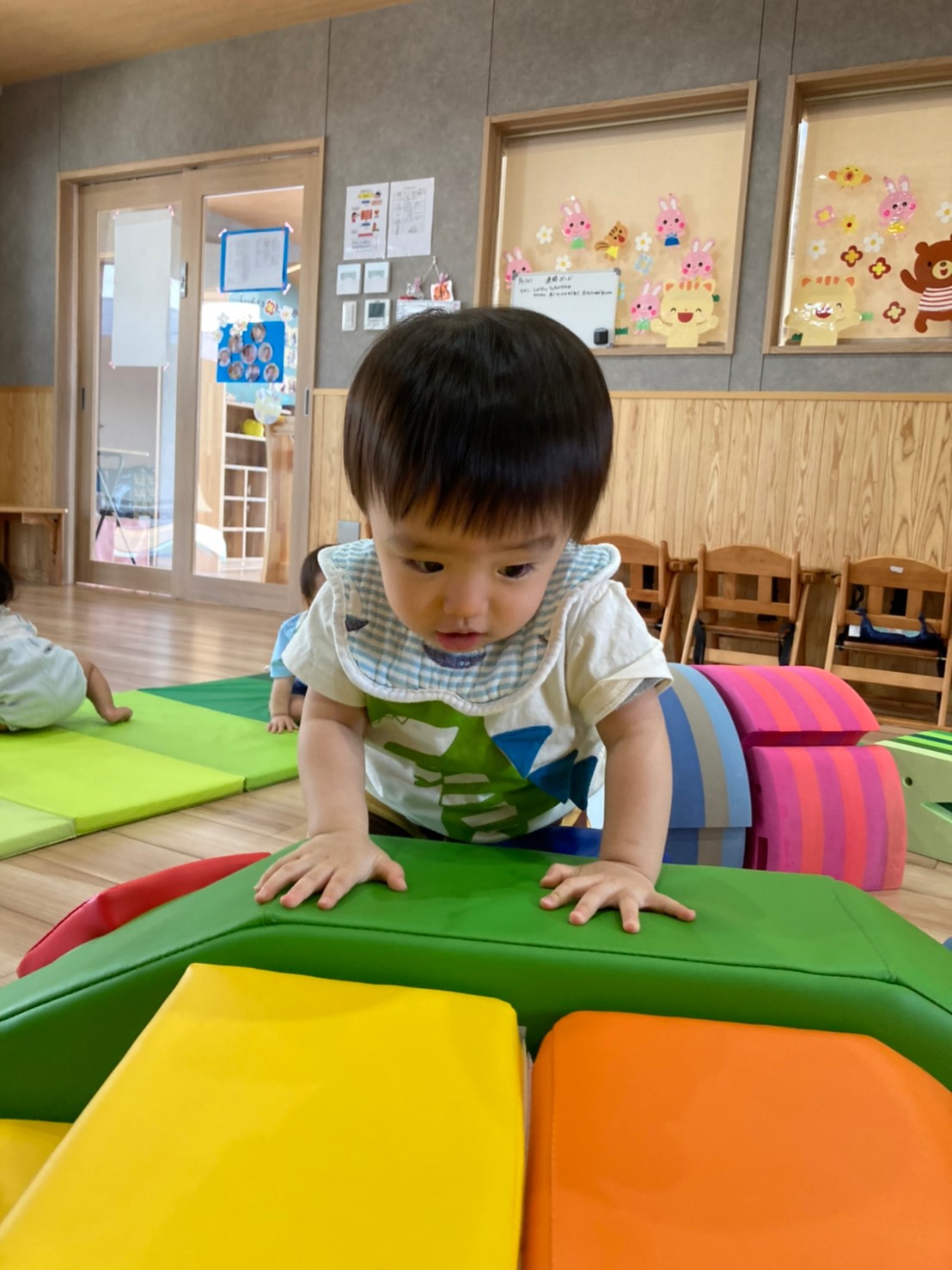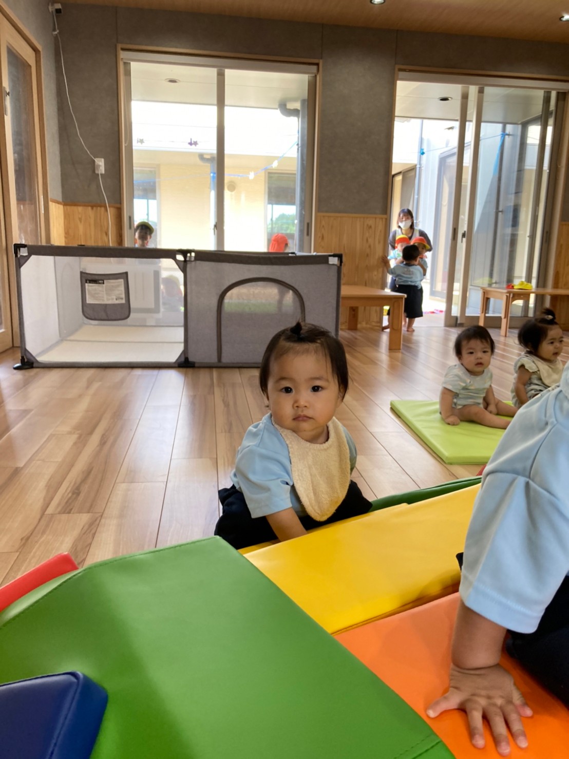 今日は室内と屋内でのびのび遊びました。お外ではシャボン玉を追いかけたりボールを投げたりしました。泣いてた子もお外の気持ちよさに笑顔になりました。お部屋ではカメのプレイマットで階段を登ったり上から滑ったりしました😊たくさん体を動かしたので給食も午睡もスムーズに進みました😊🐿りす組🐿