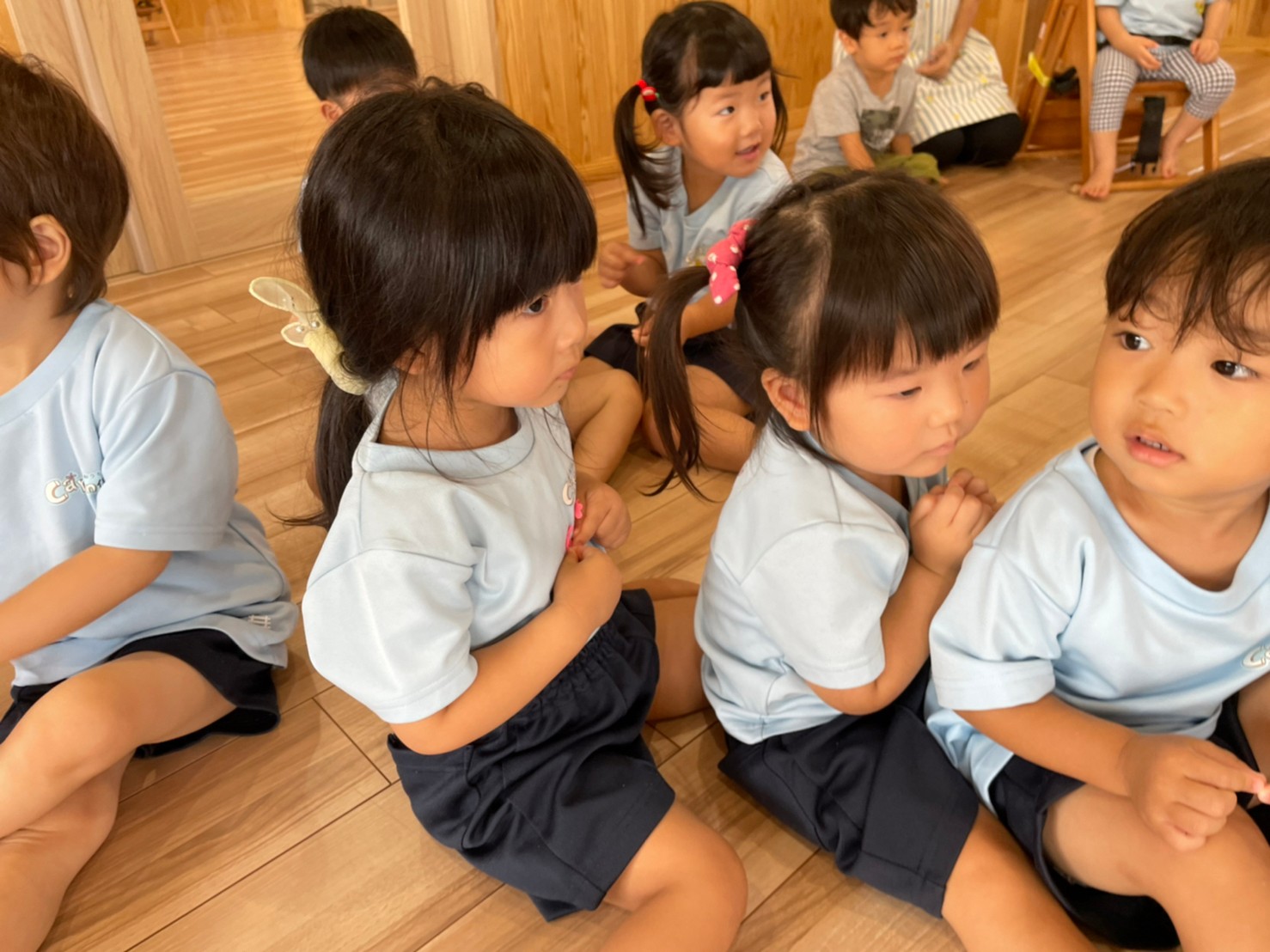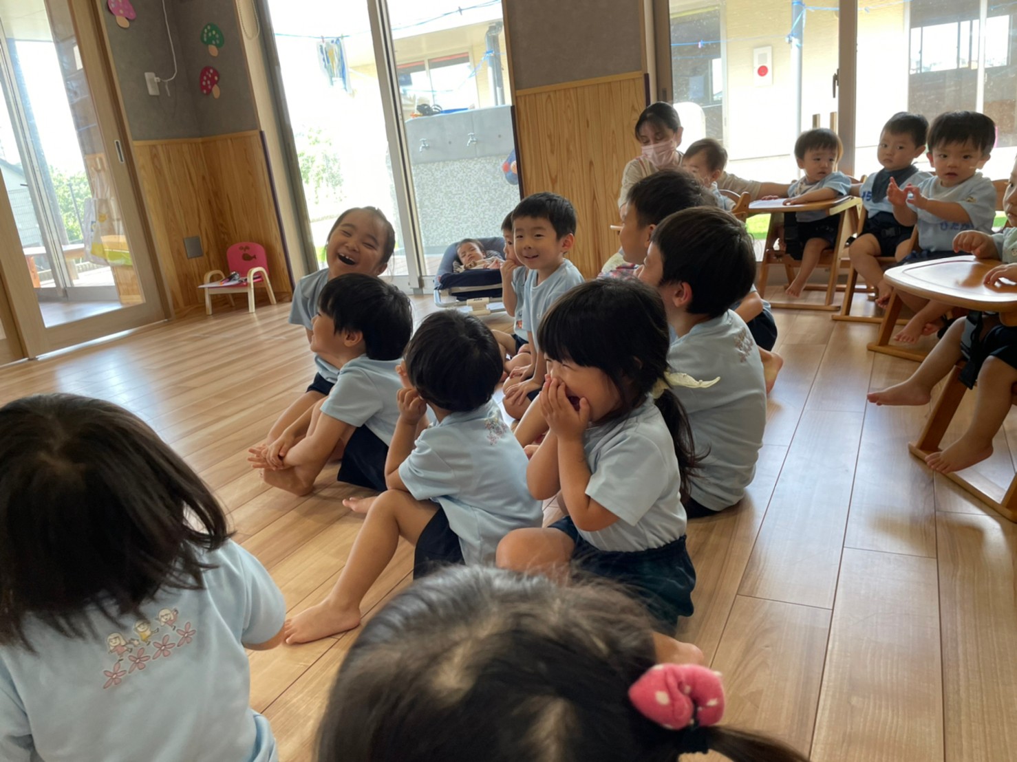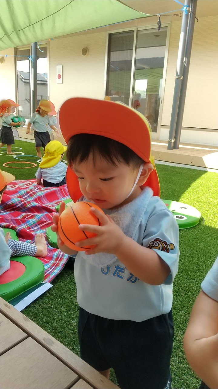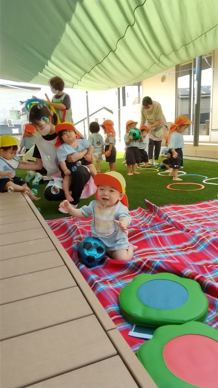 誕生児のお友だちは初め緊張していましたが、みんなに祝ってもらい可愛い笑顔が出ていました🥰職員の出し物では、手拍子したり一緒に歌ったりして、どの子も集中して見ていましたよ🎶その後は園庭で遊びました✨日差しが強かったのでタープで日陰を作って、しゃぼん玉やボール、ラダーで思い思いに遊びました☺️ぱんだ🐼