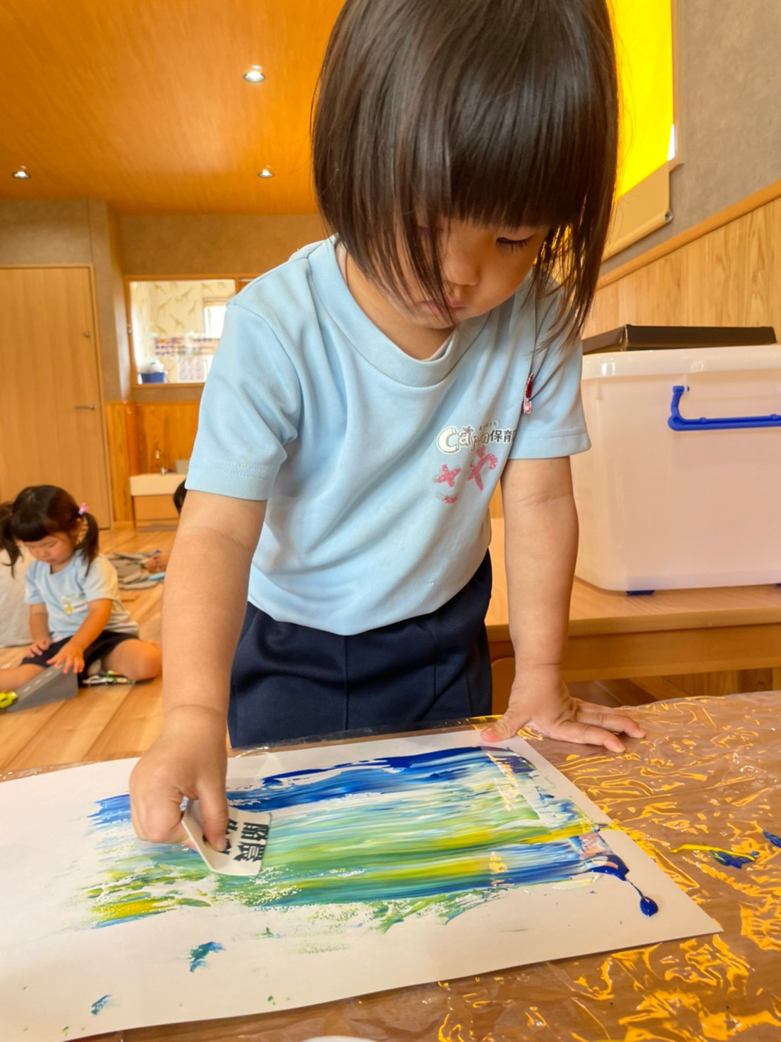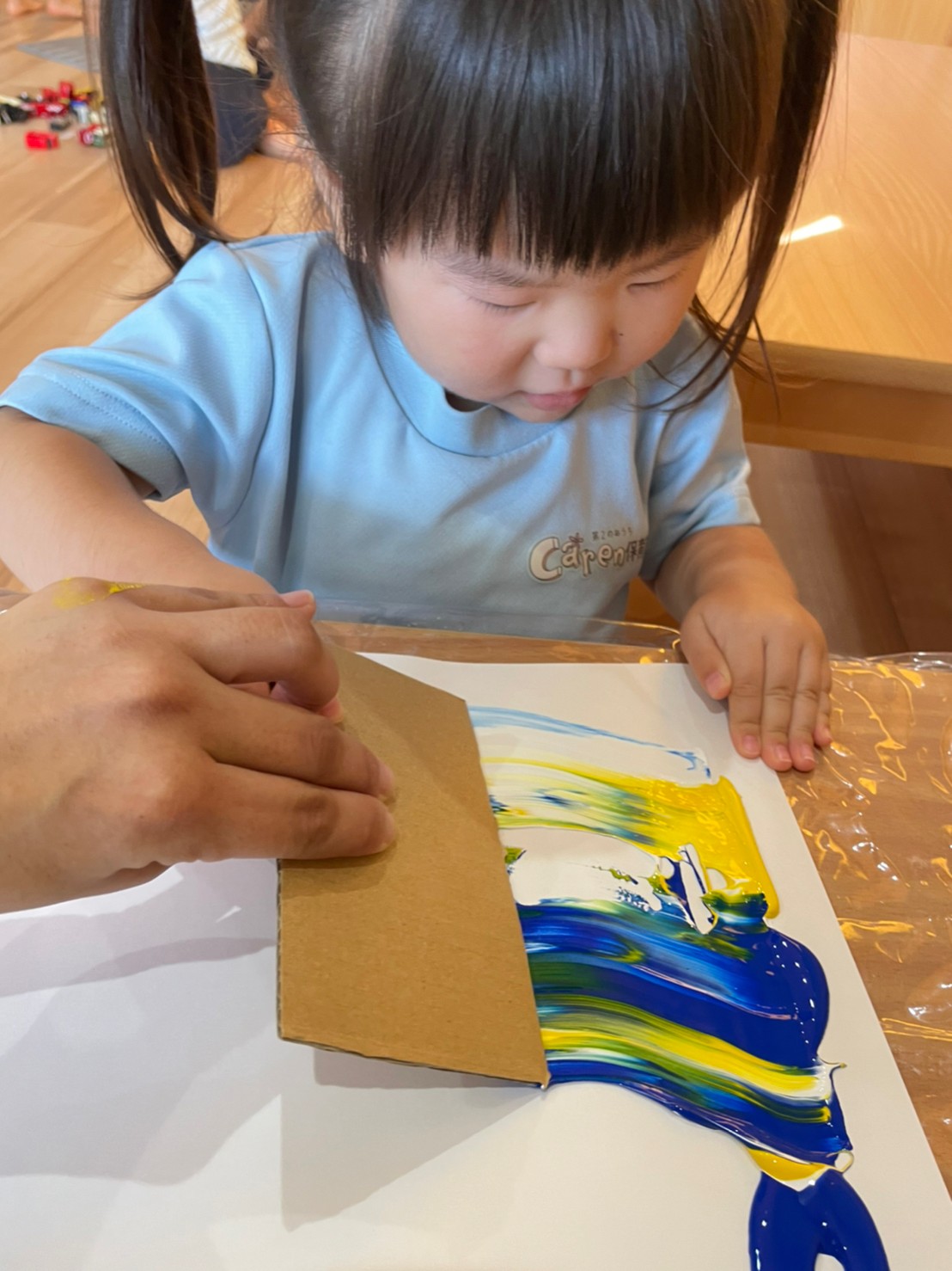 厚紙を使い絵の具を伸ばし、綺麗な空の模様ができ驚きの様子でした✨うさぎこあらきりん🐰🐨🦒