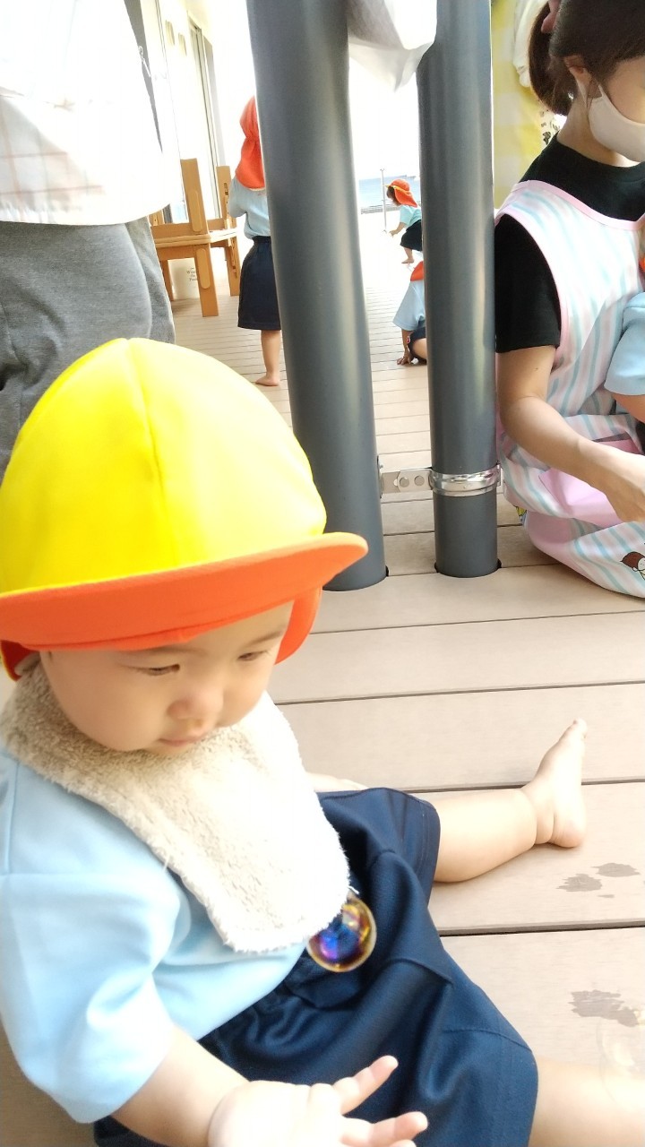 その後は園庭でシャボン玉やマット遊びをしました🌞しゃぼん玉を両手を広げてつかもうとしたり、しゃぼん玉の玩具で自分でしゃぼん玉をとばそうとするなど興味が増した様子が見られました💖新しいお友だちもお外で気分転換ができました✌️😊🐿りす組🐿