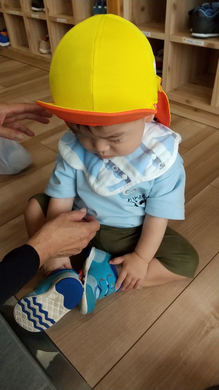 最近靴デビューを果たしたひよこさんは嬉しそうに靴を履いて準備OK!!早速、保育者に手を引かれて「あんよは上手〜❤️」と歩行の練習をしました😆自分で歩いんて保育者に抱きとめられるとニコニコ笑顔でしたよ✨