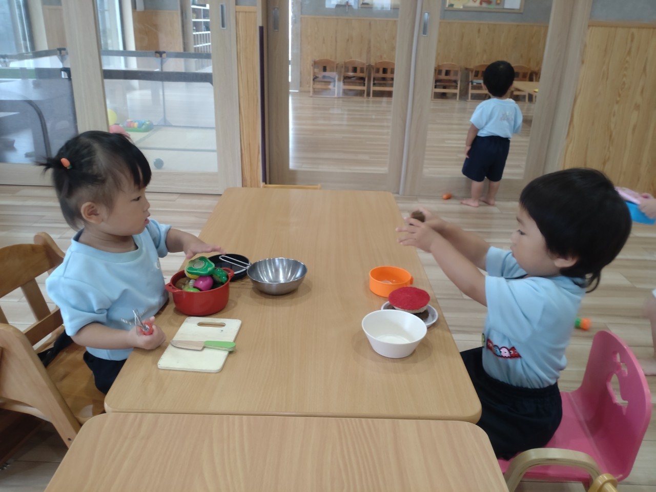 お部屋遊びでは木製パズルやままごと遊びをしました🍳保育者の見守りの中、お友達との関わりも多く見られ微笑ましかったです🥰