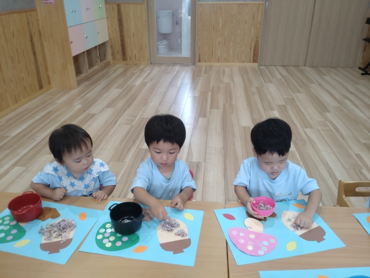 製作前に作品を見せて「どんぐり」を歌ったり作り方を見せたりすると、目を輝かせる子ども達✨どんぐりに毛糸の飾りを集中して付けていましたよ🎶