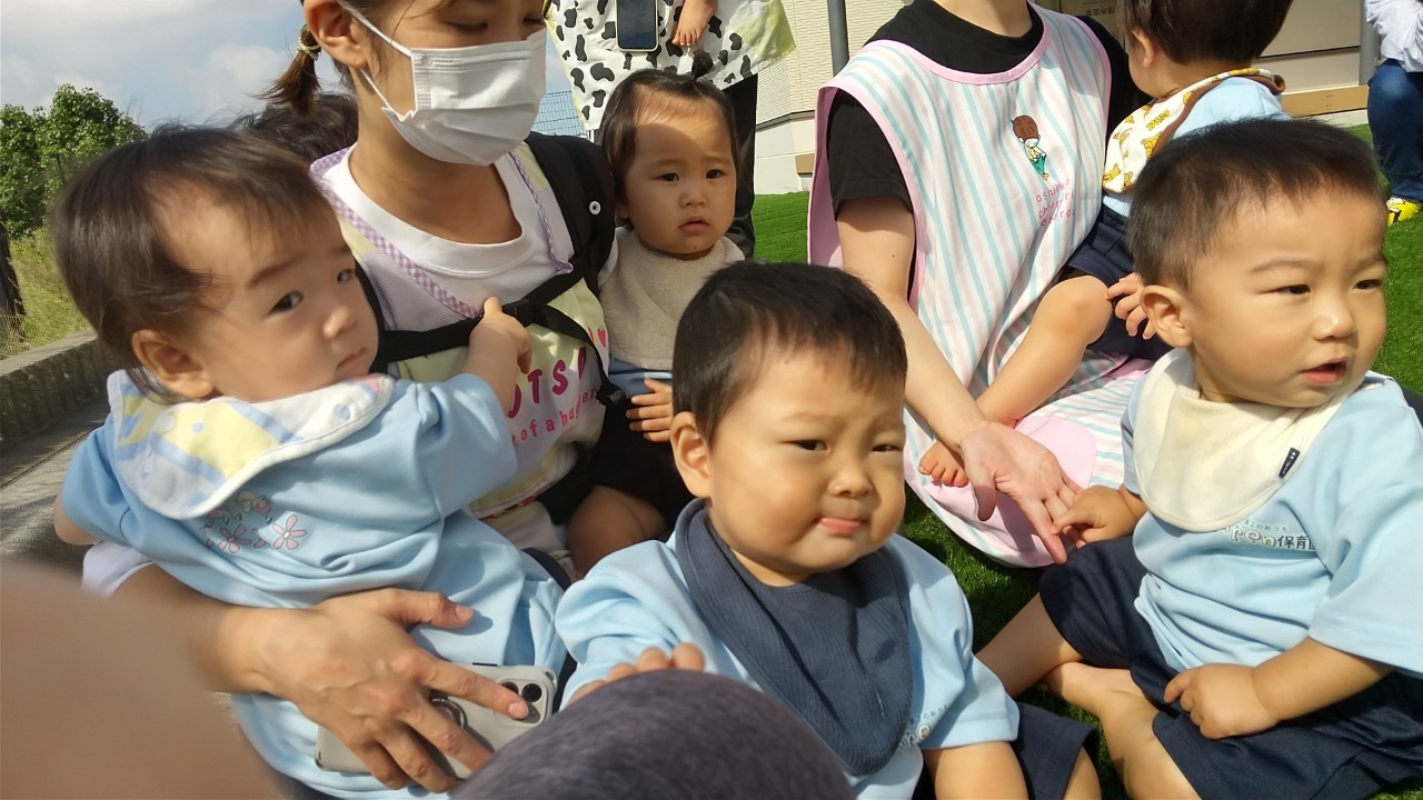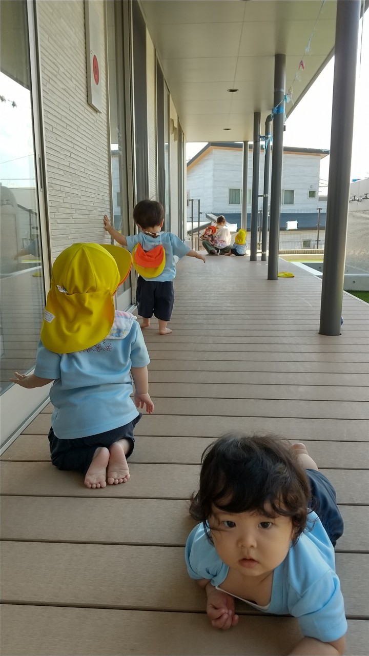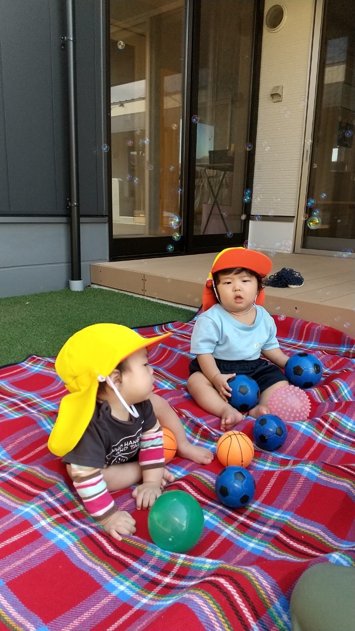 その後は園庭でしゃぼん玉やボール遊びをしました🌞しゃぼん玉に見入ったりキャッチしようとしたりかわいい様子が見られました😆テラスであんよ競争もしましたよ✨