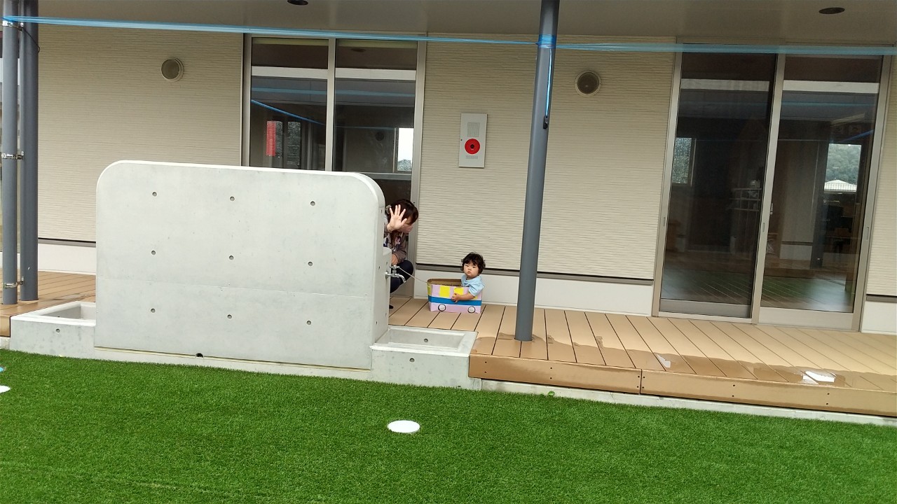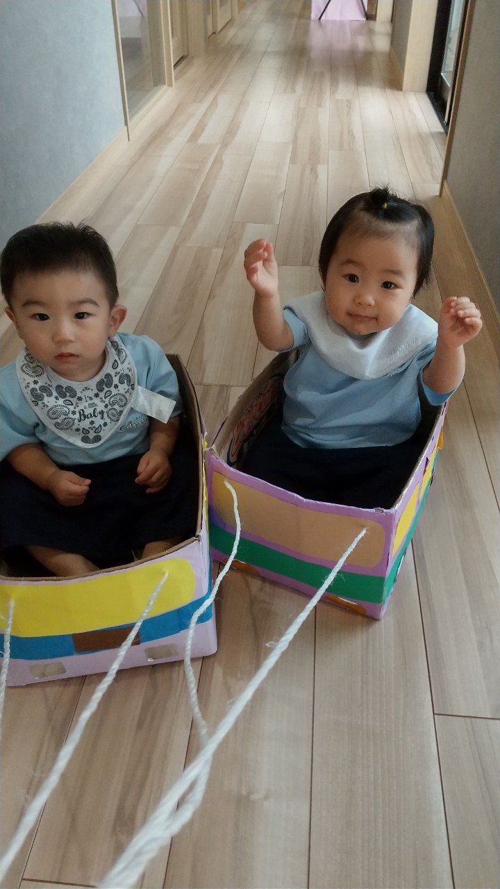 それから、ダンボール車に乗って保育室からテラスなどを園内ドライブを楽しみました!