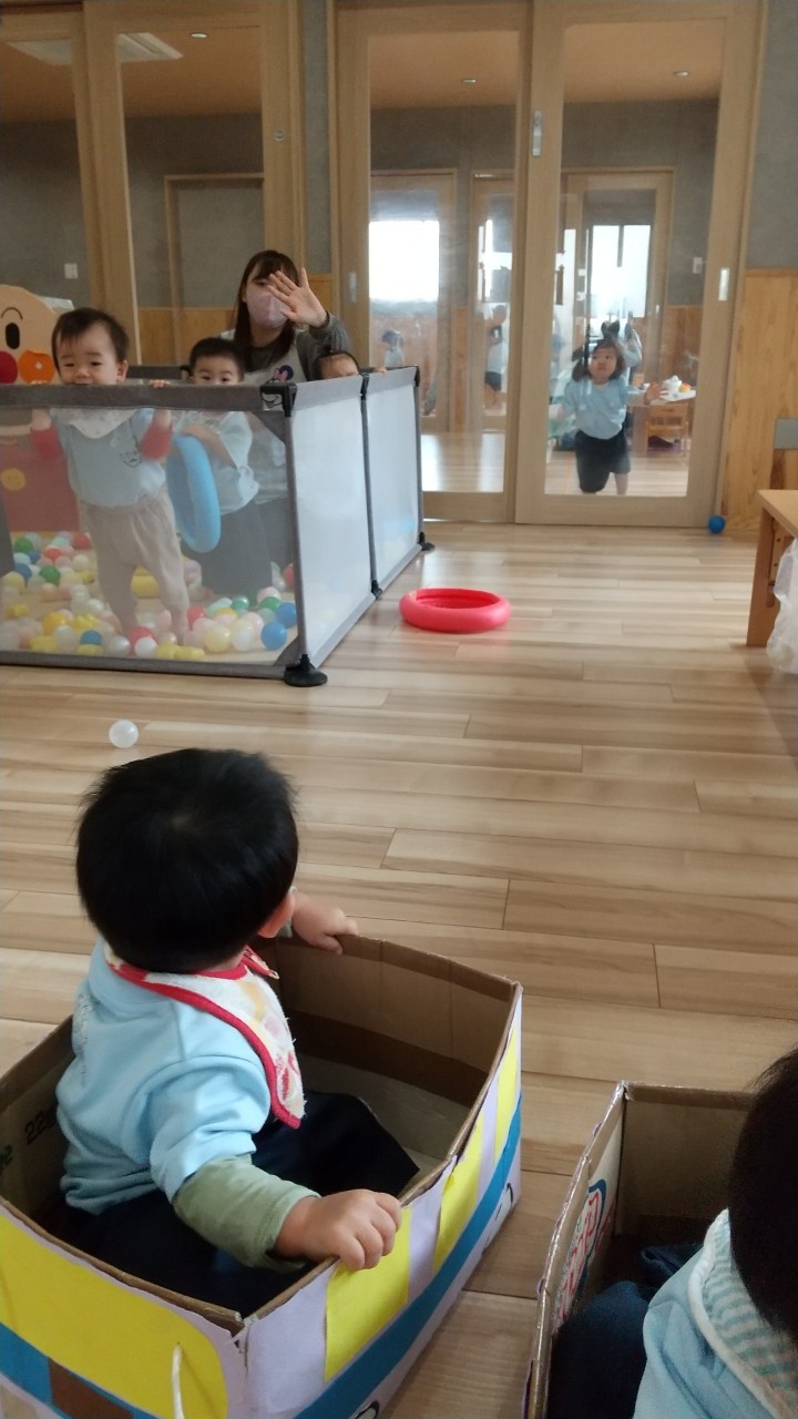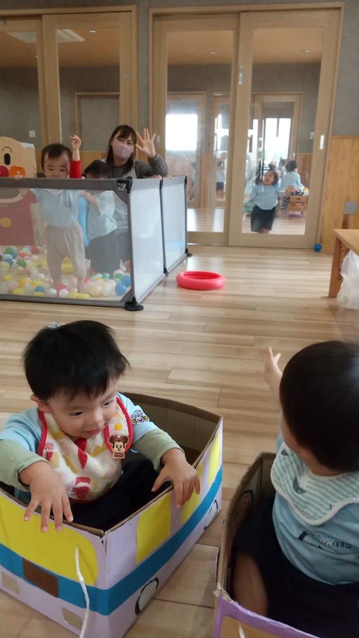 今日は朝体操の後、ボールプールやダンボール車ごっこをしました!