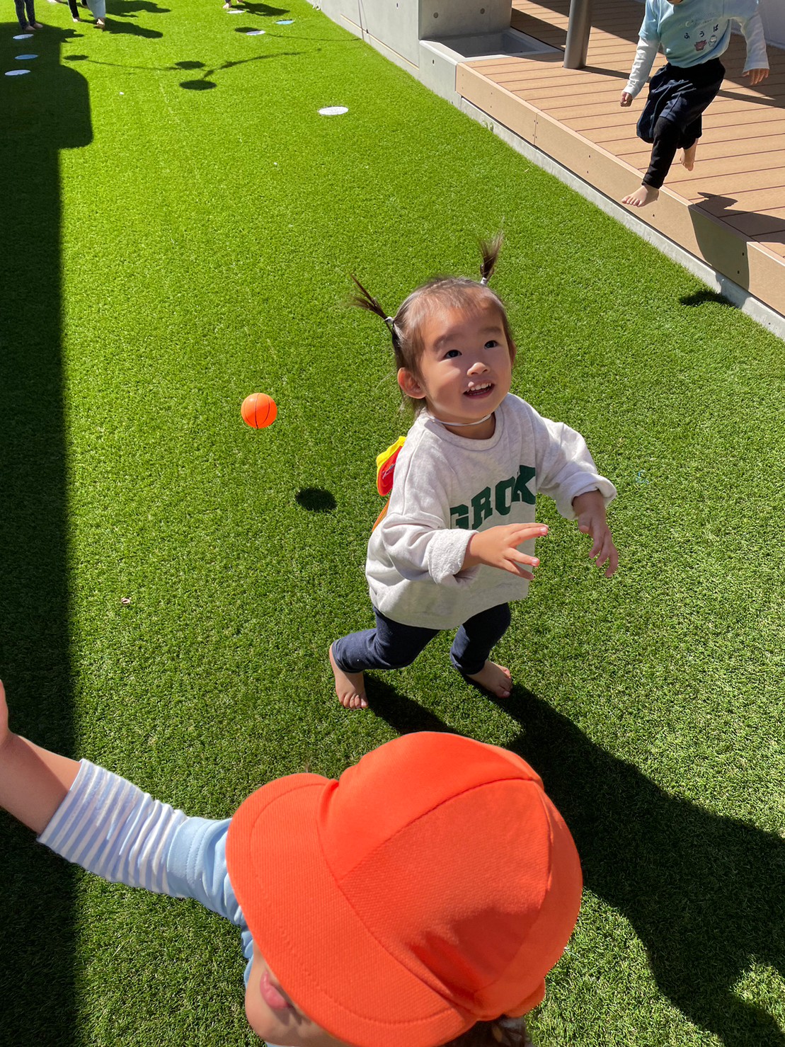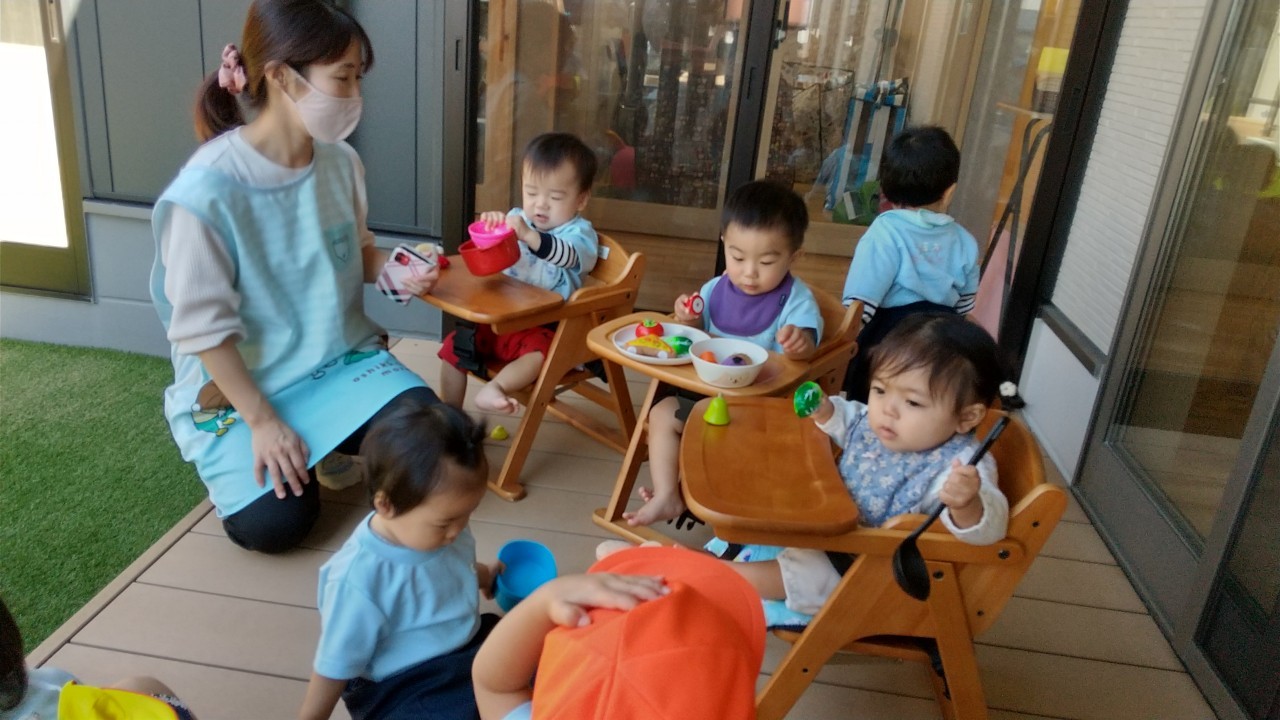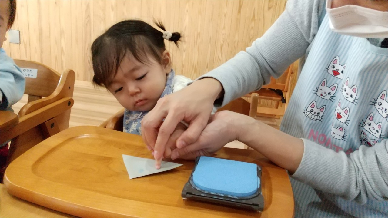 その後は季節の製作の指スタンプをしたり、テラスでままごと遊びをしました。お外でのままごとはいつもとひと味違って嬉しそうでしたよ😆✌️
