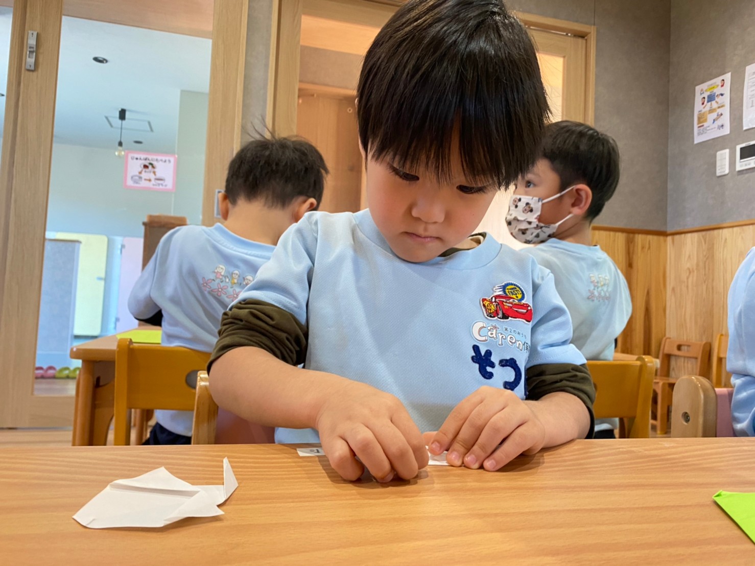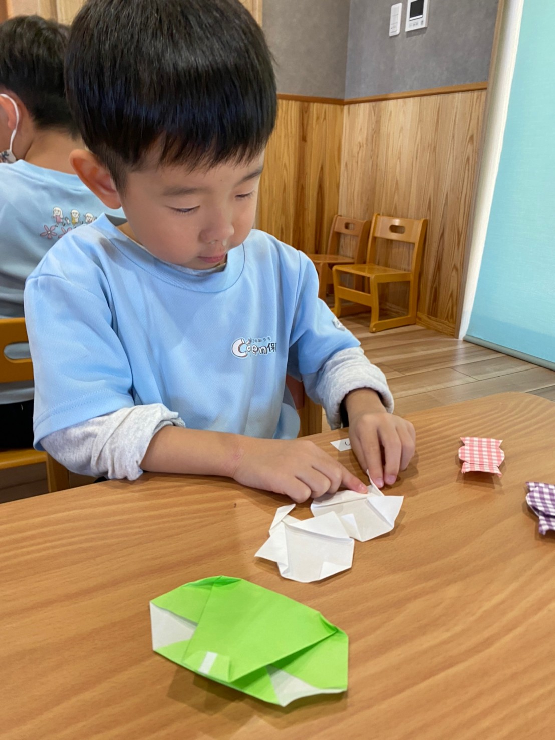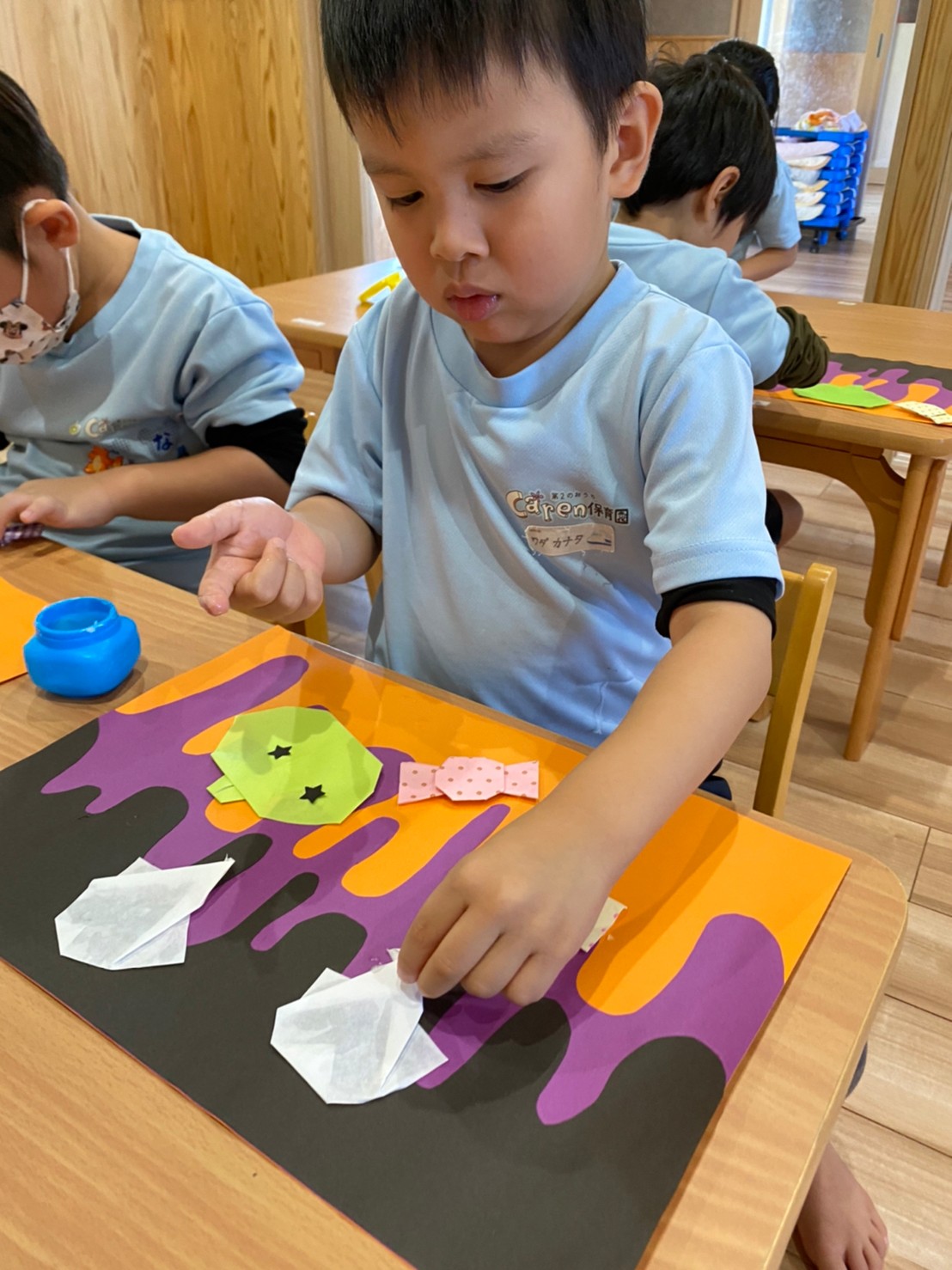 「僕はハロウィンでコウモリになるよ〜🦇」「私は魔女♡」と口々に話しながら、難しいところも一生懸命に挑戦して、楽しく折ることができていました☺️💕