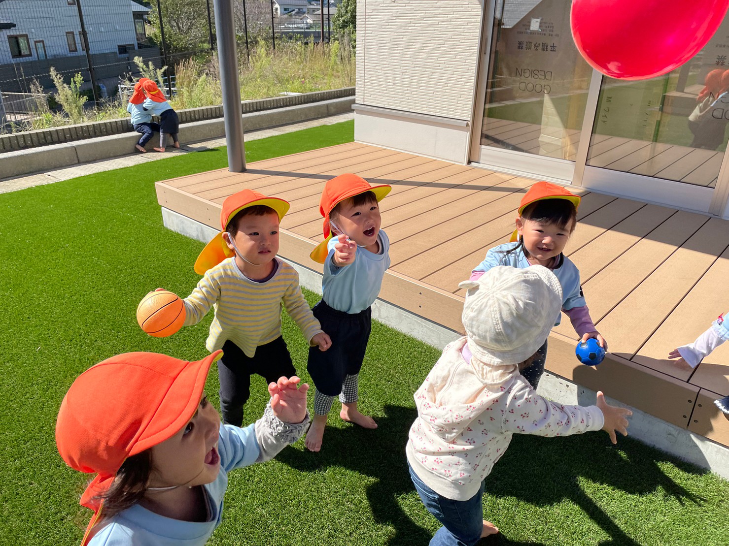 その後は園庭でボール遊びをしたり、風船を吊るして風に揺れる風船を眺めたり、風船にタッチ!して笑顔いっぱいで楽しく過ごしました🌼