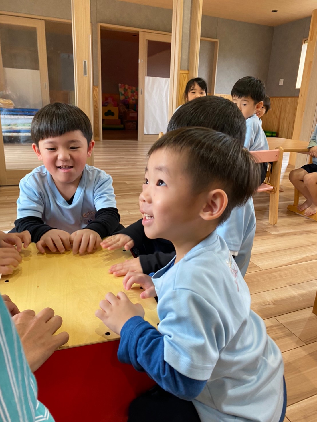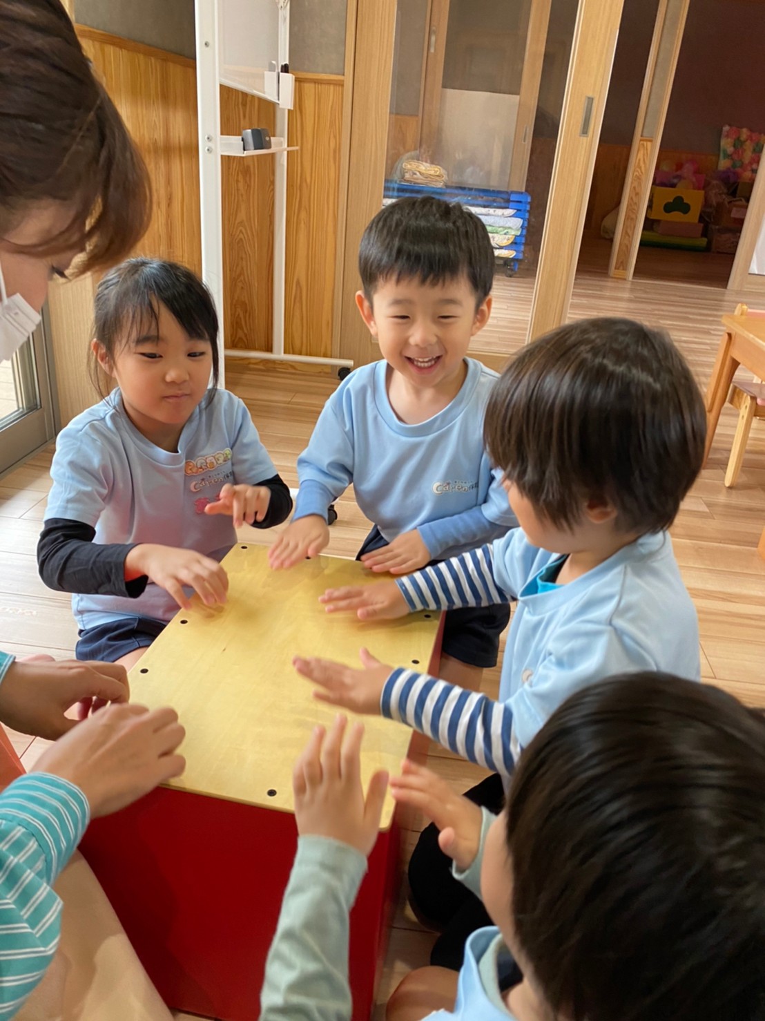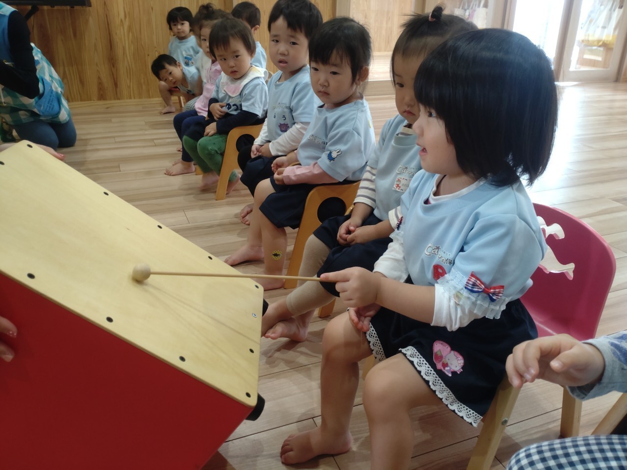 先生のピアノの音をよく聴き、カホンの合図が聴こえたら、カホンを叩きに行くという遊びでは、みんなワクワクしながらピアノの音を聞いている様子でした😁✨