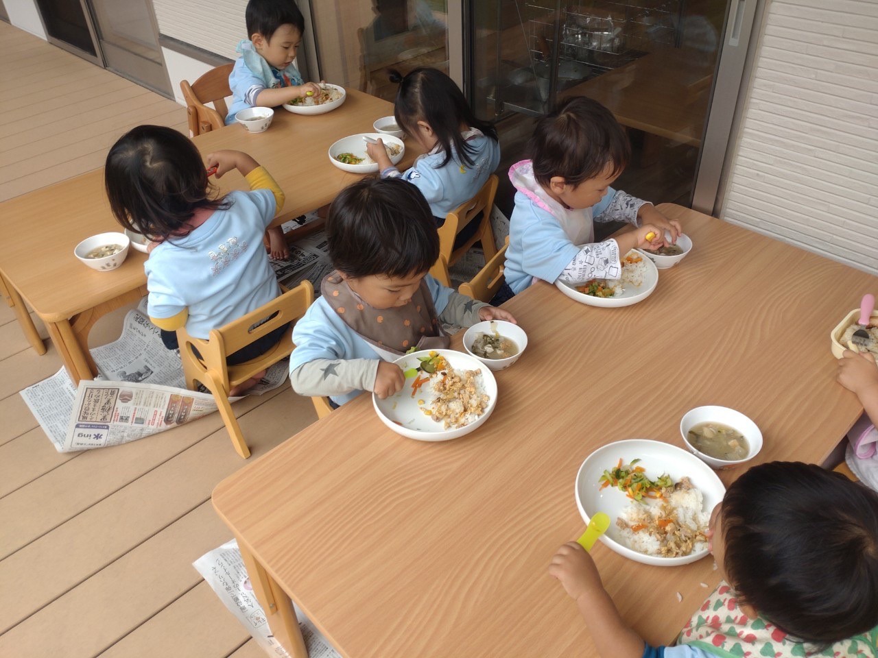 今日は登園の子が少なかったのでテラスで給食を食べ、いつもと違う雰囲気を楽しんでいた子どもたちでした🥰【くりえいと園の今日の給食です】