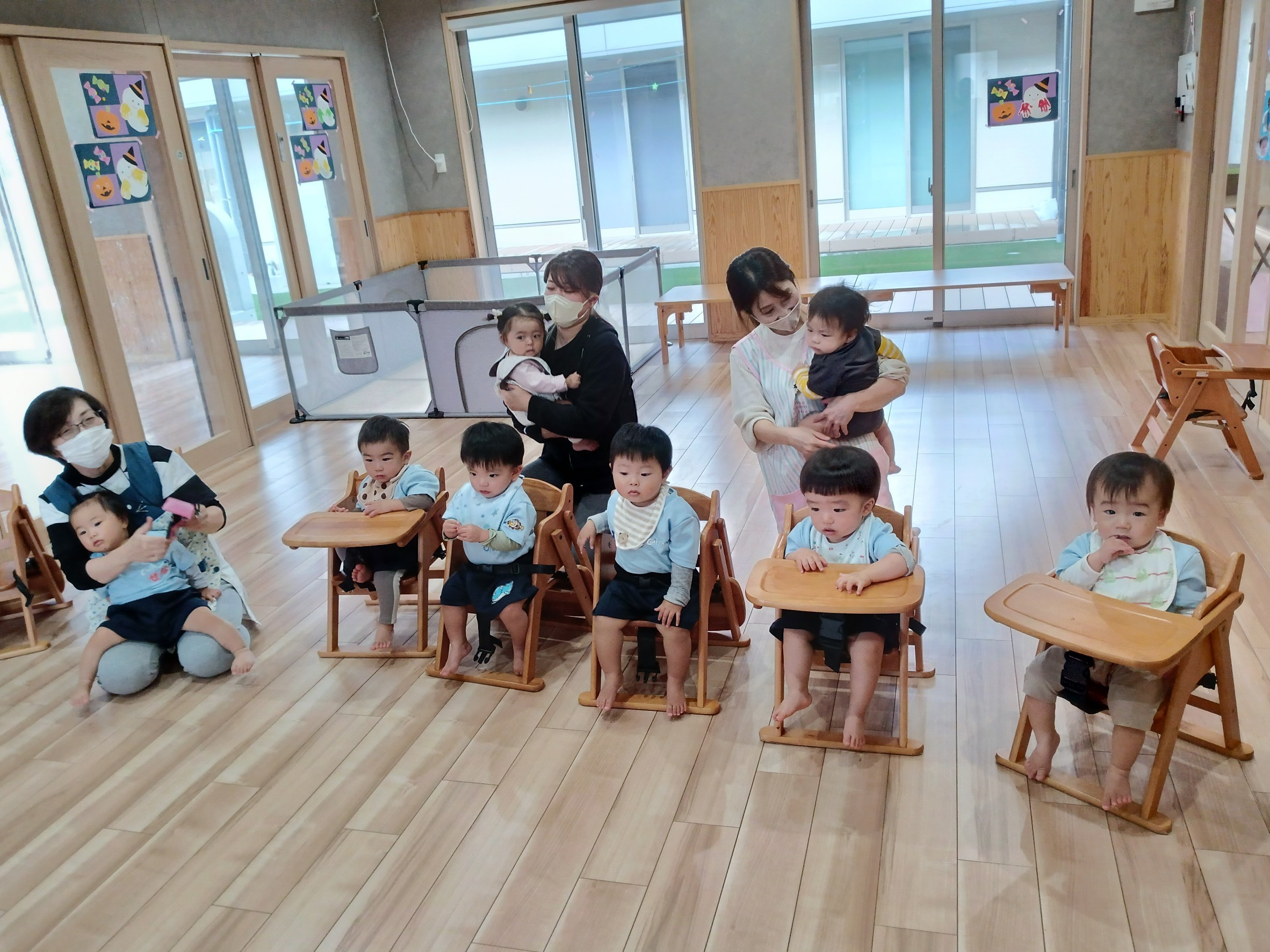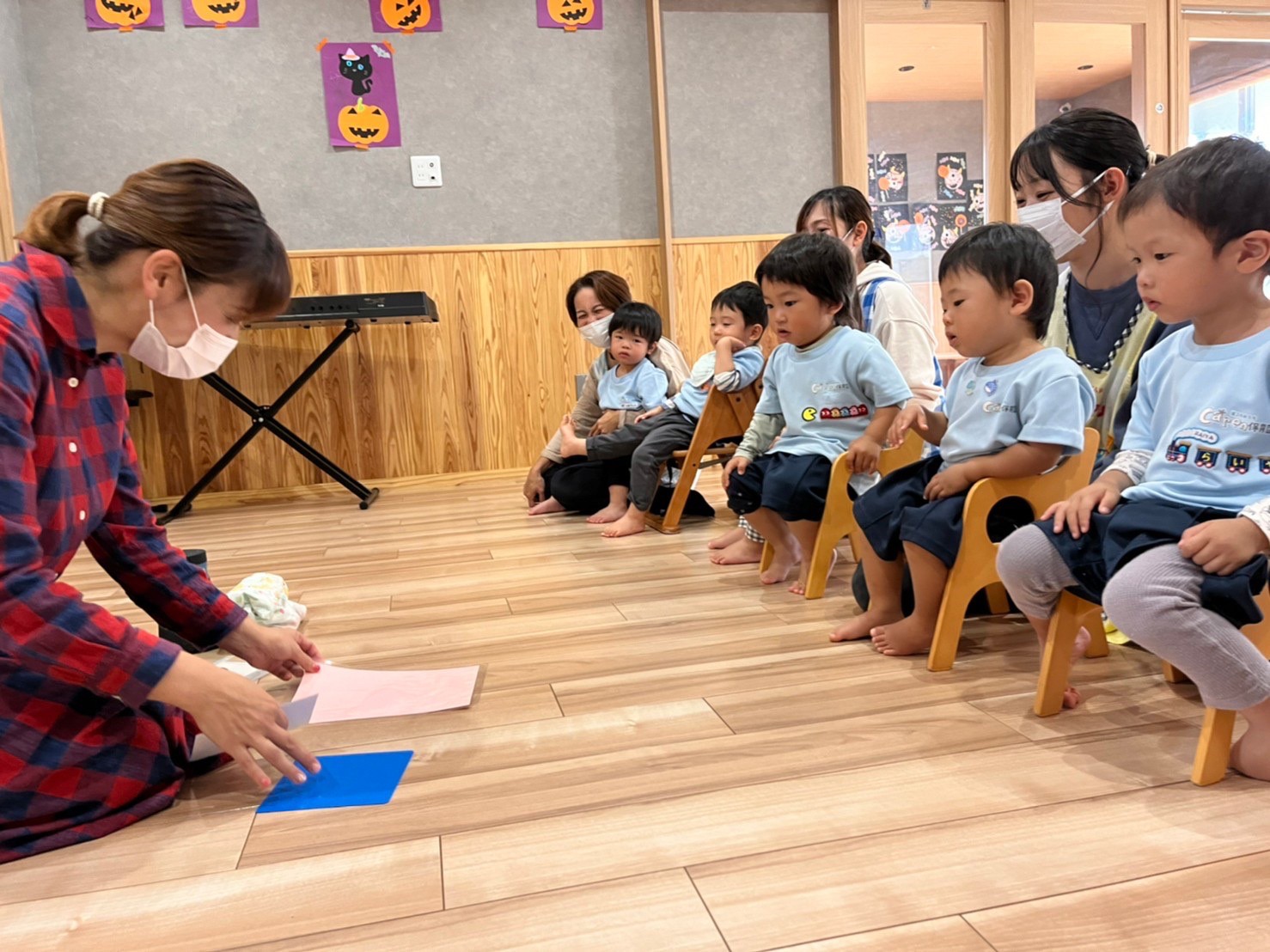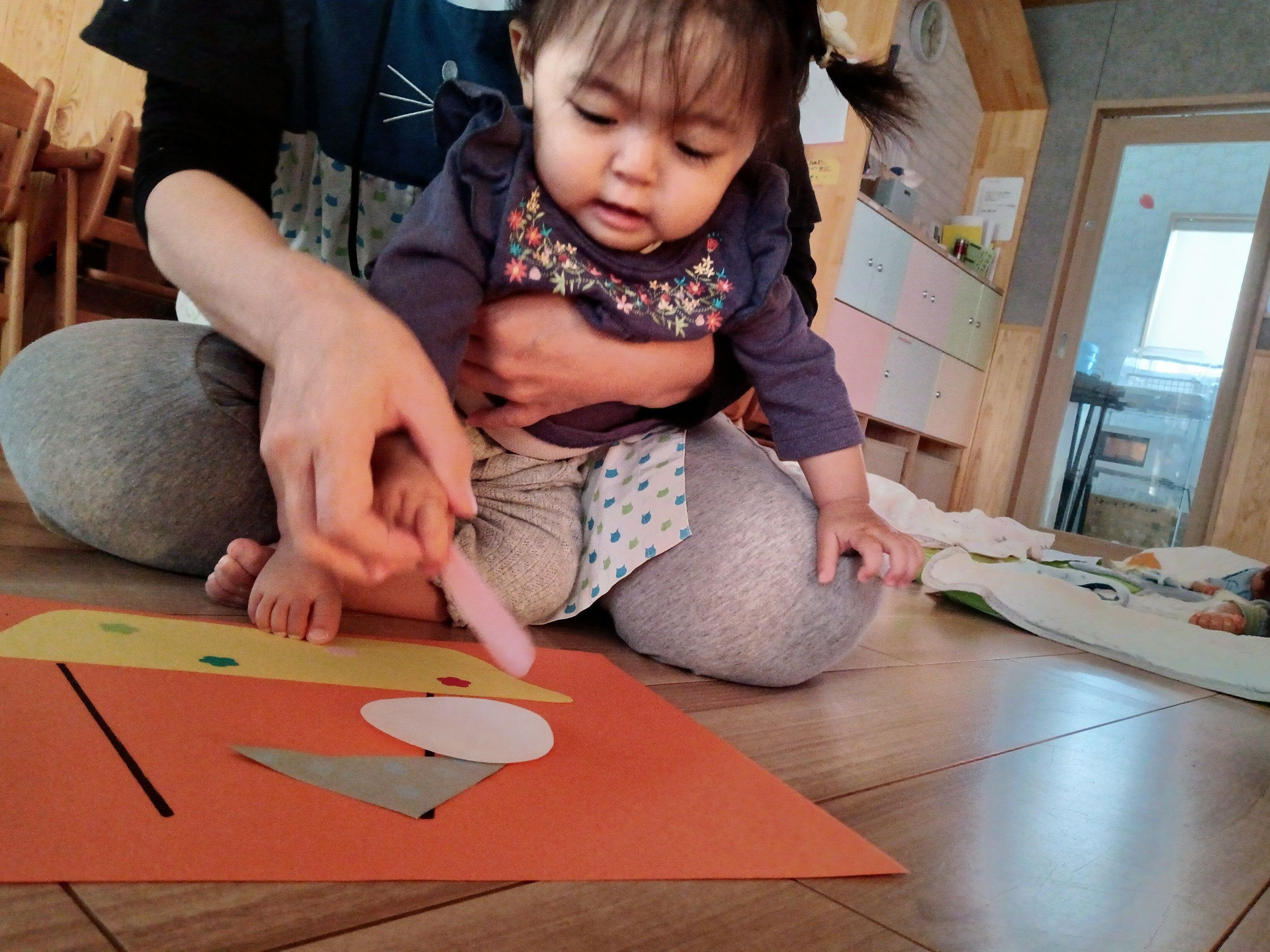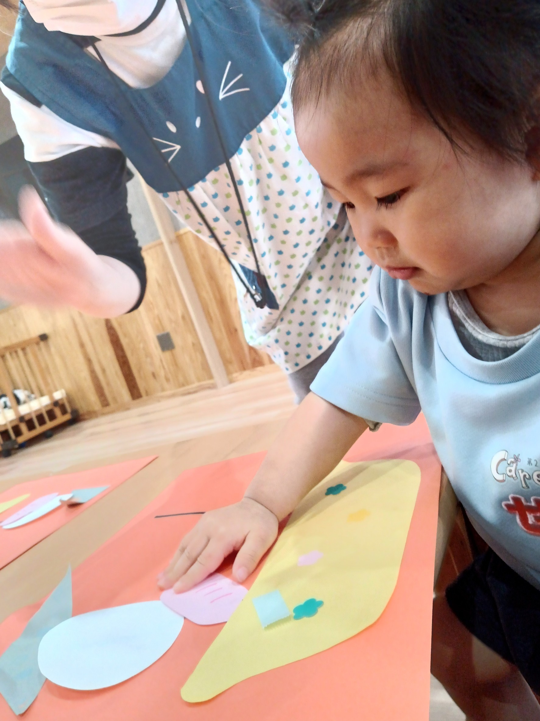 今日はリトミックに参加しました🎶歌絵本を集中して見たり、歌に合わせて手拍子したり体を揺らしてリズムを楽しんでいましたよ🙂。鈴バンドも好きな色を選んで積極的に遊んでいたひよこ組さんでした🐤その後は、季節の製作でパーツ貼りをしたり、色や形に興味を示して楽しみながら作る事ができました🍢。りすぐみ🐿