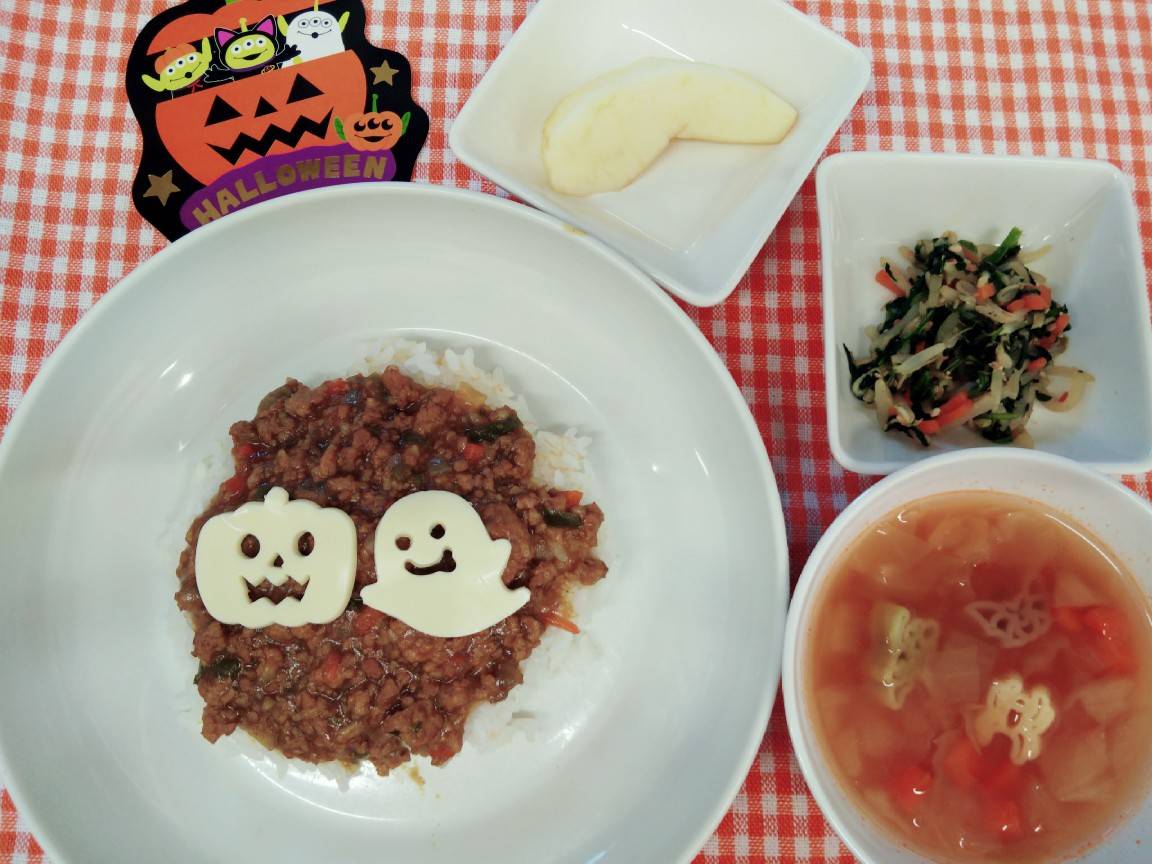 たくさん身体を動かした後は可愛いハロウィンご飯ももりっと食べてゆっくり身体を休めて過ごしました🍛【くりえいと園の今日の給食です】